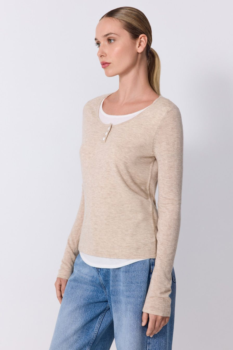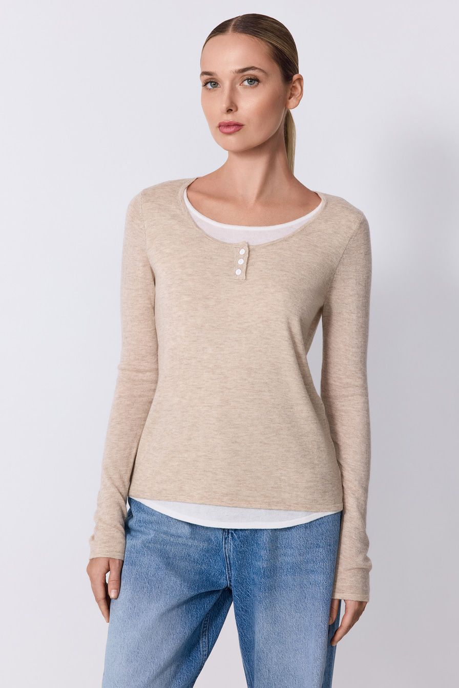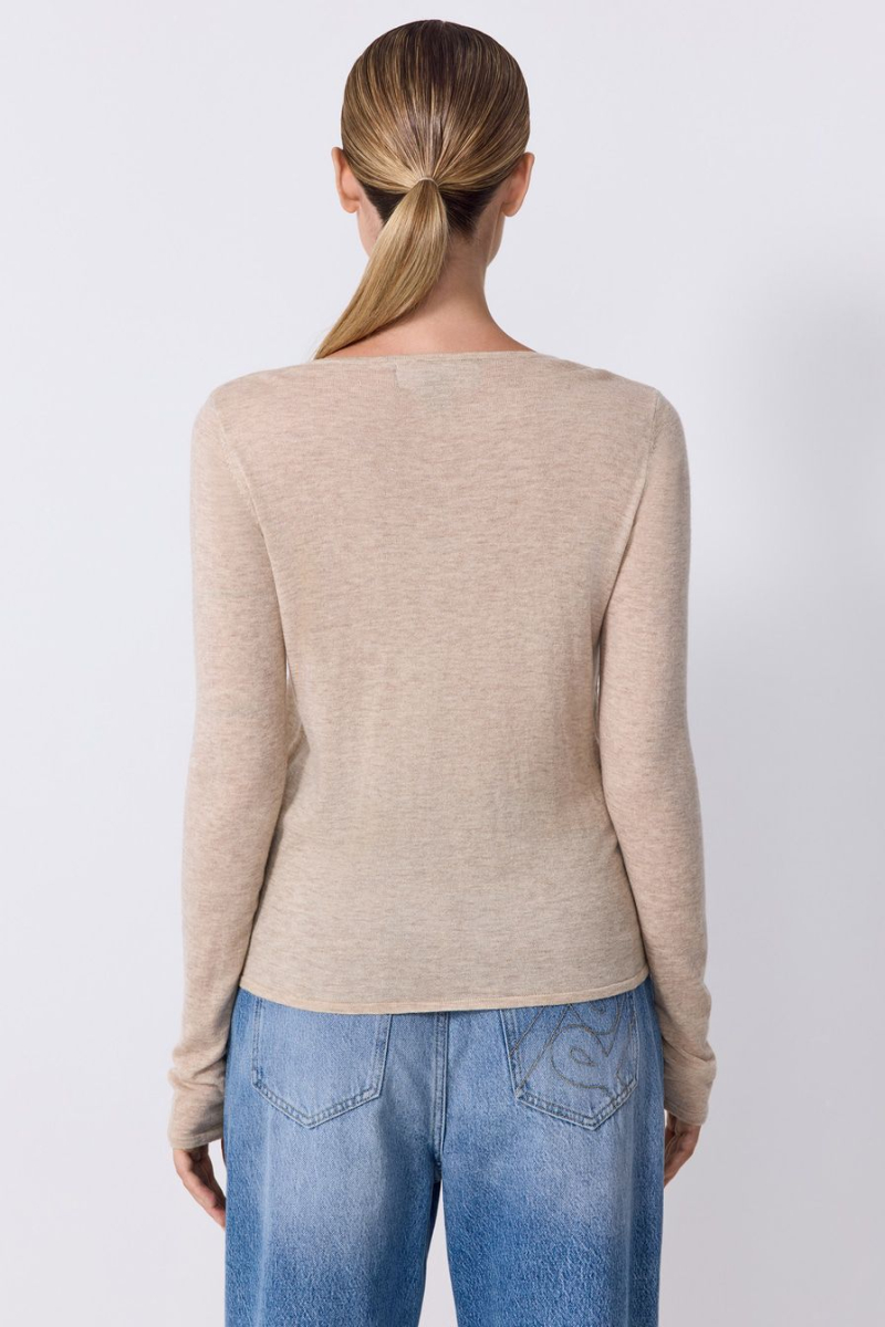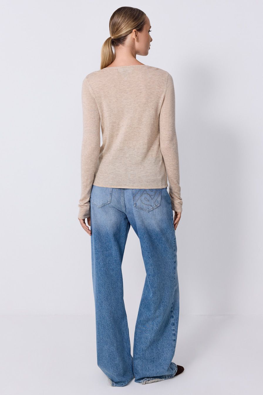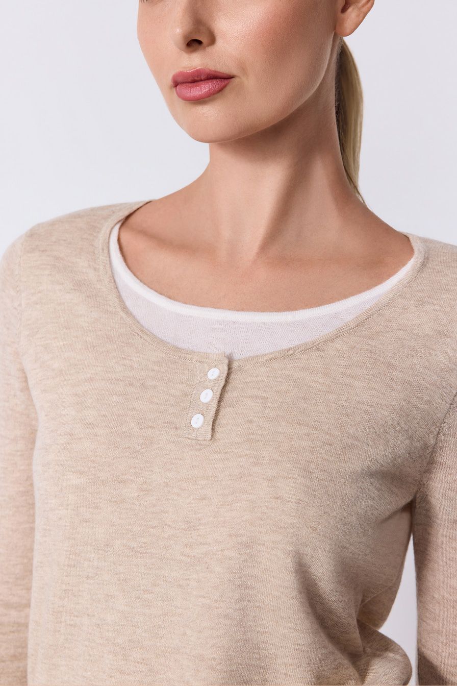 Светло-бежевый джемпер выполнен из смесовой ткани с добавлением шерсти и кашемира и декорирован контрастной отделкой.