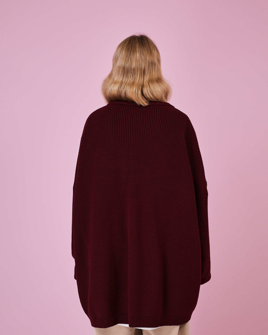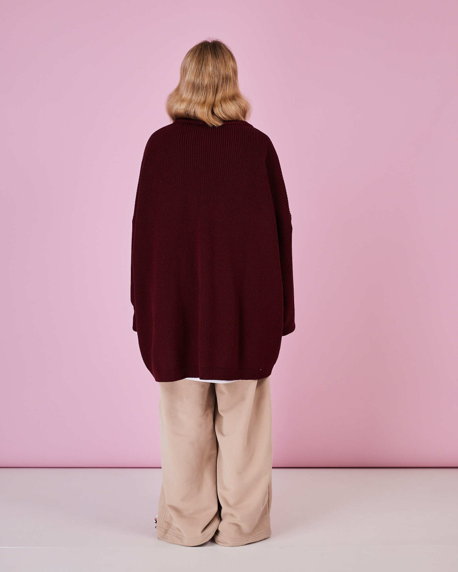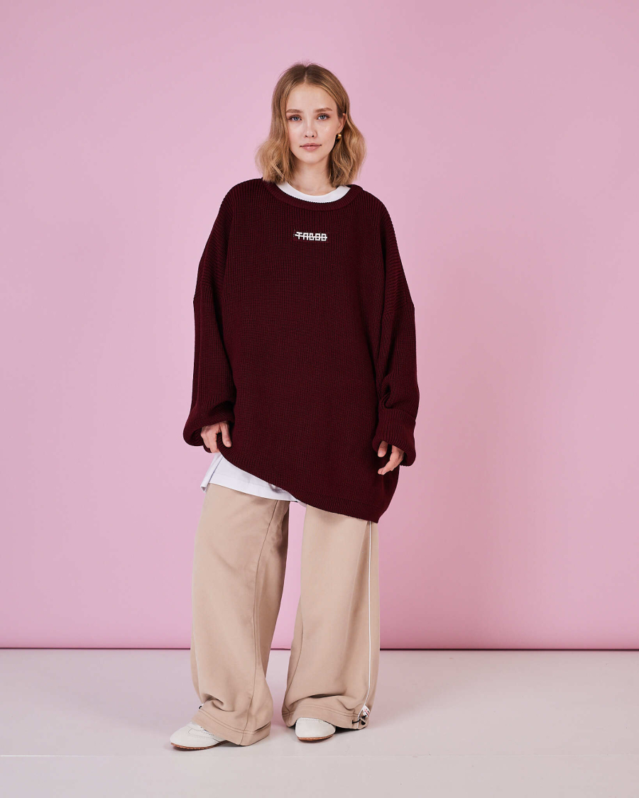 Оверсайз-свитер в насыщенном бордовом цвете. Благодаря составу (50% меринос, 50% акрил) он мягкий и практичный. Универсальный размер и свободный крой делают его идеальным выбором для создания расслабленных и трендовых образов.