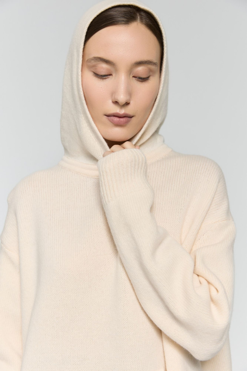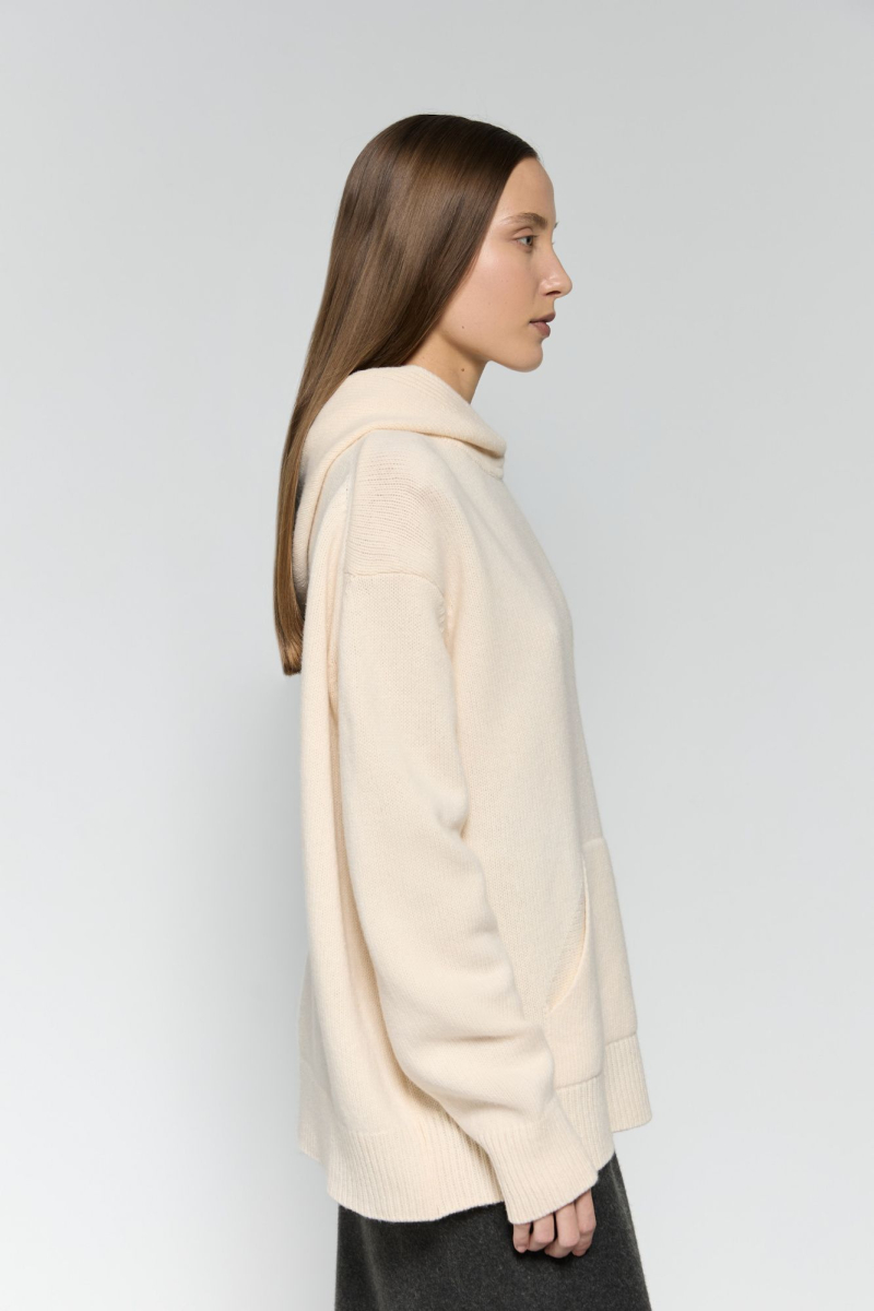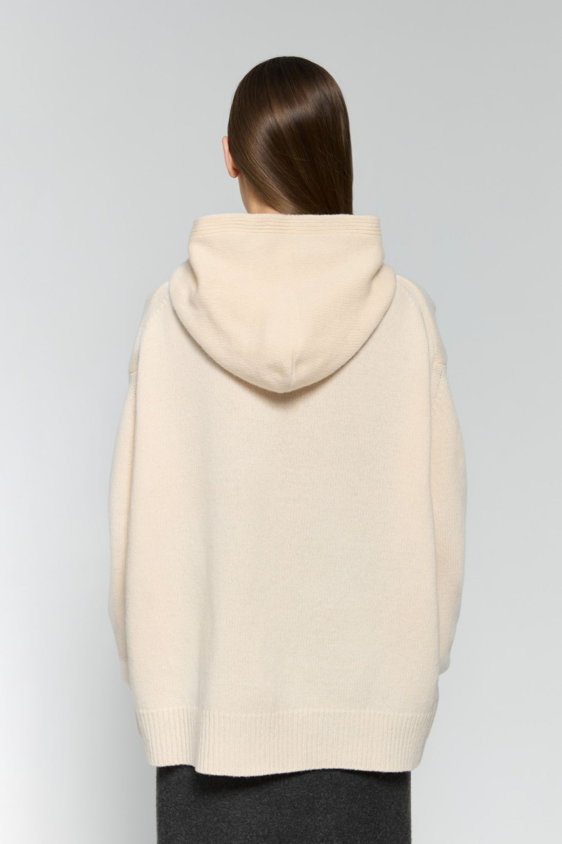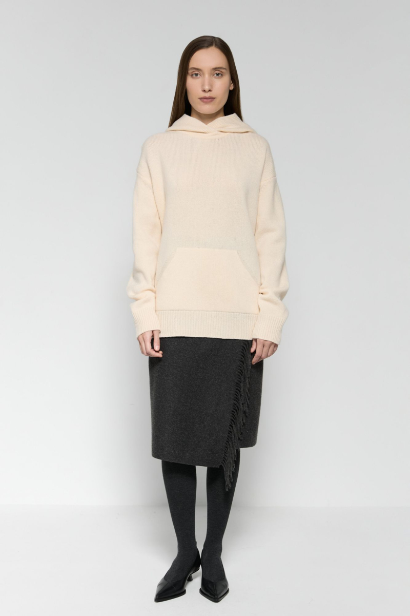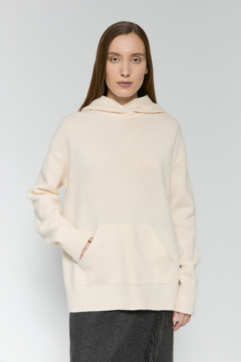 Объемное худи с капюшоном связано средней плотностью из 100% шерсти мериноса, сделанной в Италии. Очень теплое.
