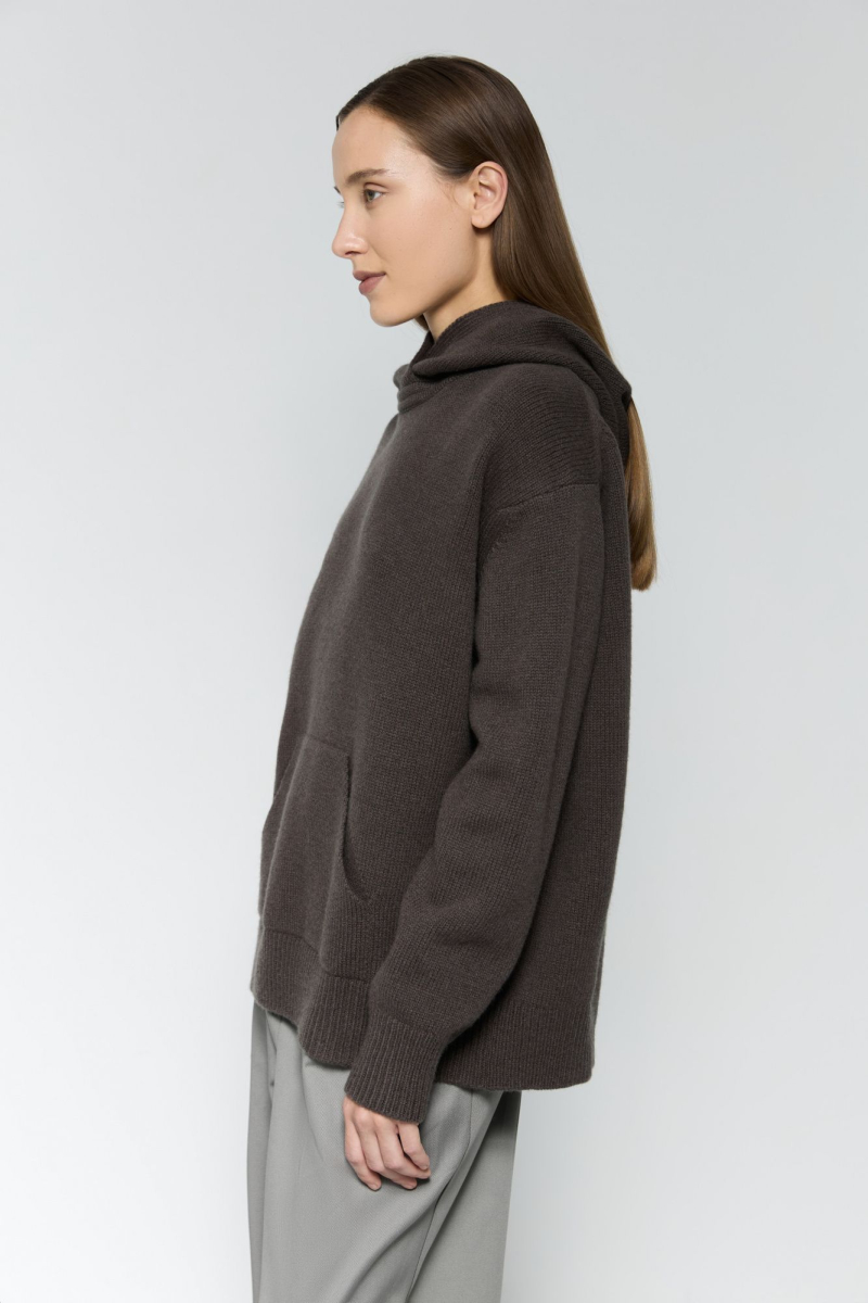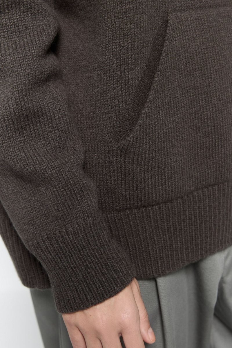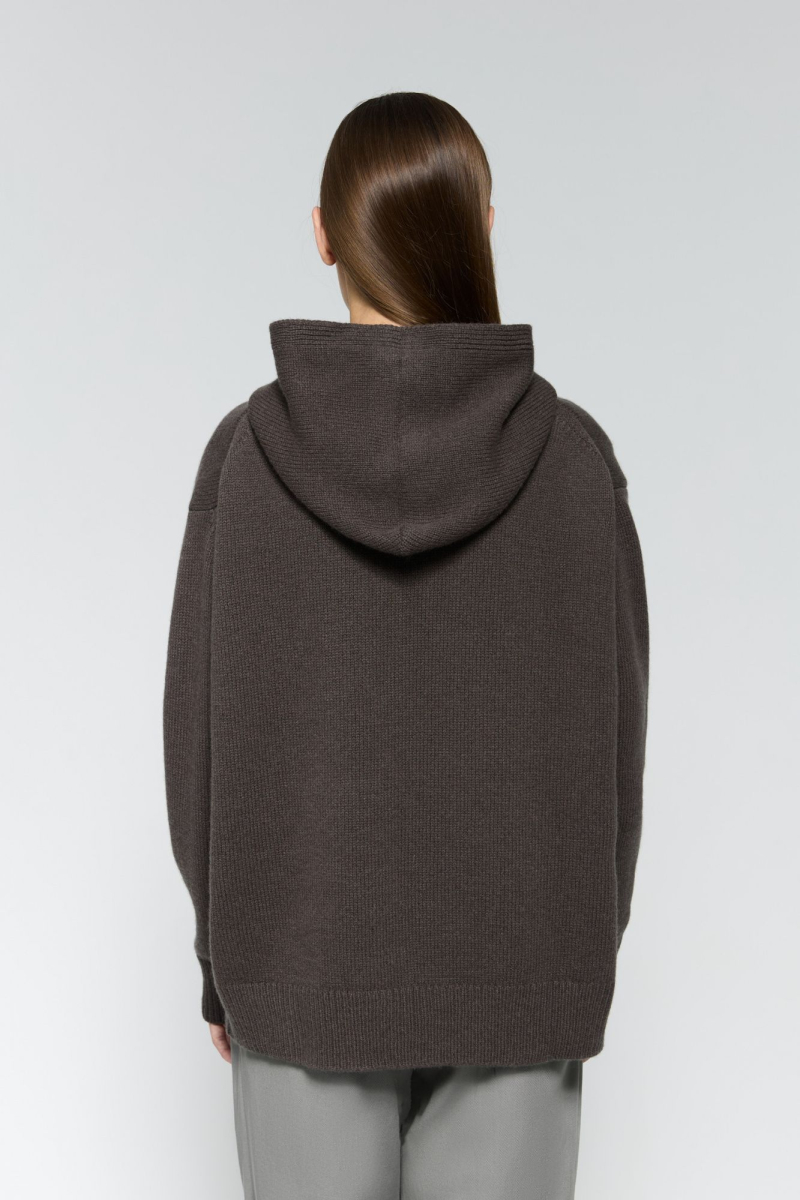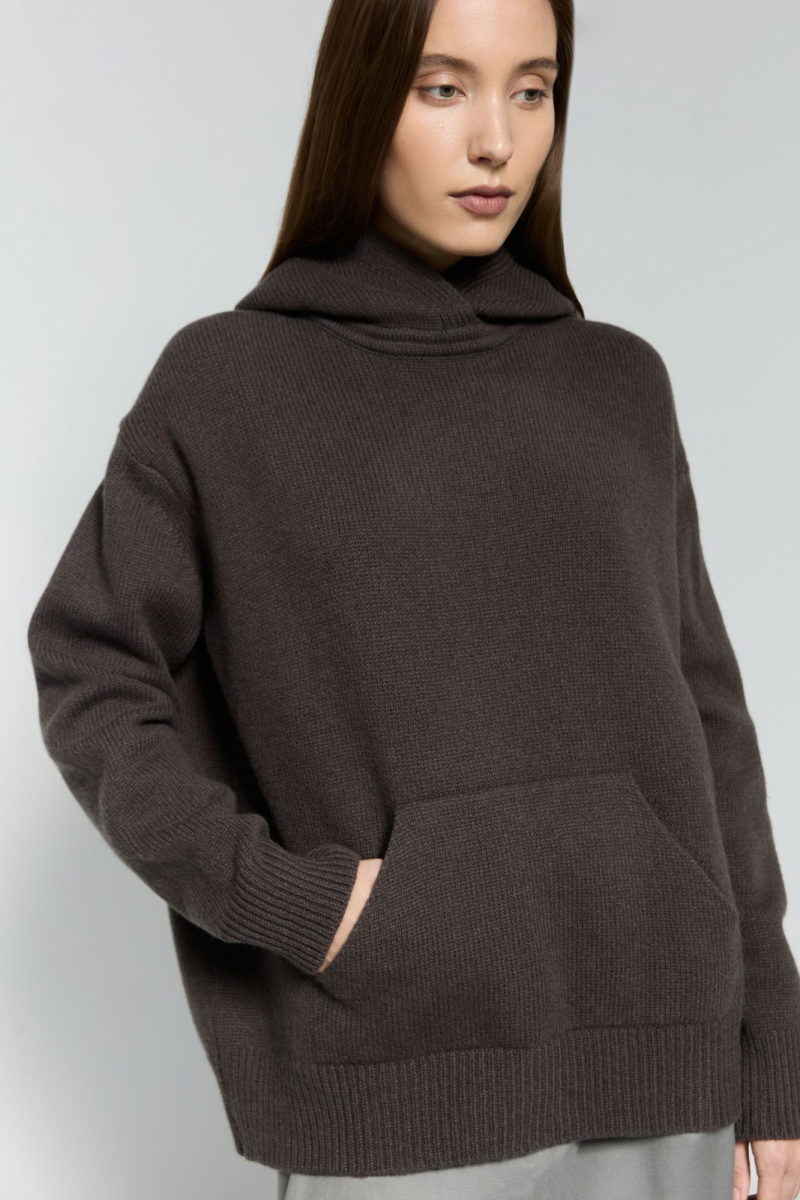 Объемное худи с капюшоном связано средней плотностью из 100% шерсти мериноса, сделанной в Италии. Очень теплое.