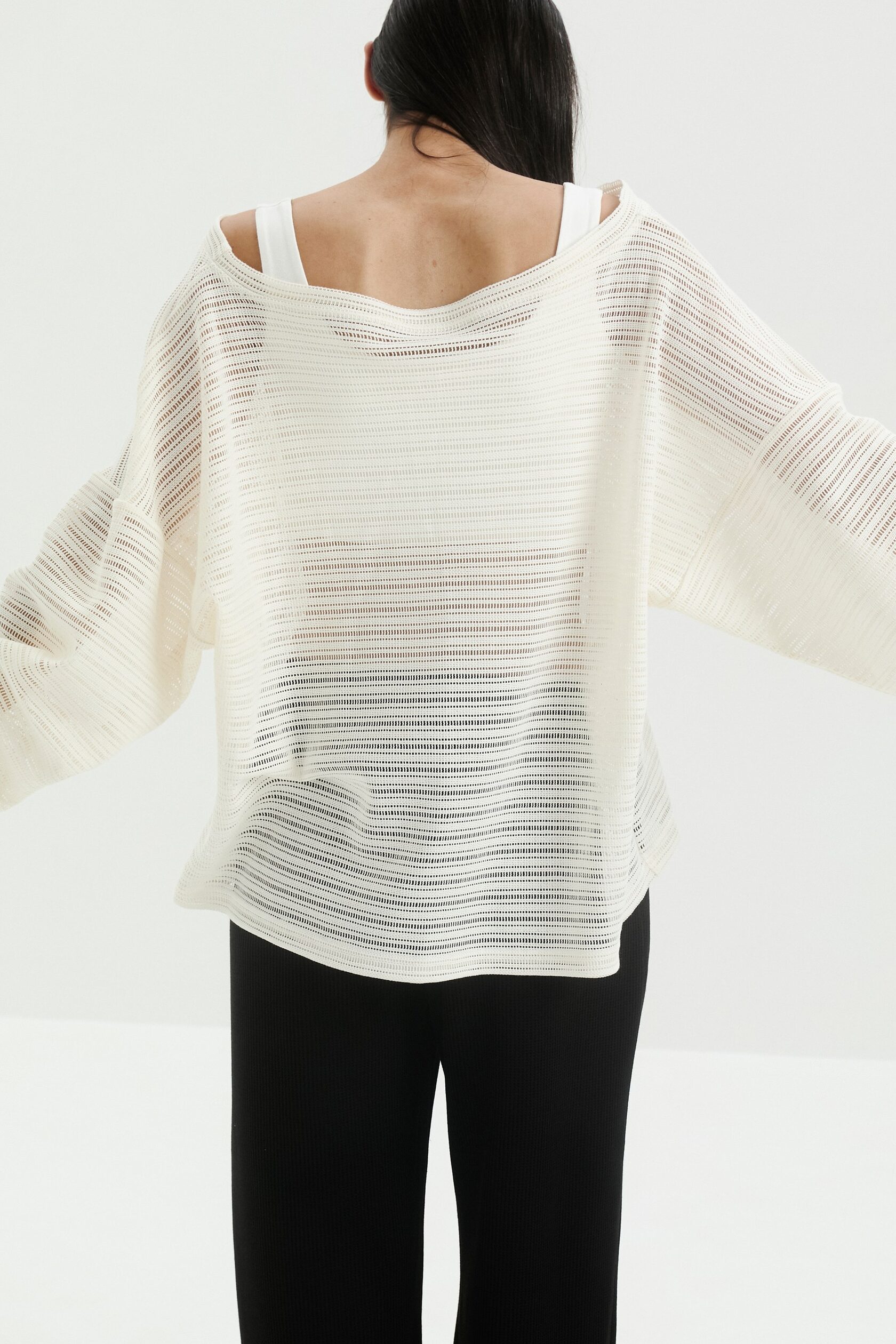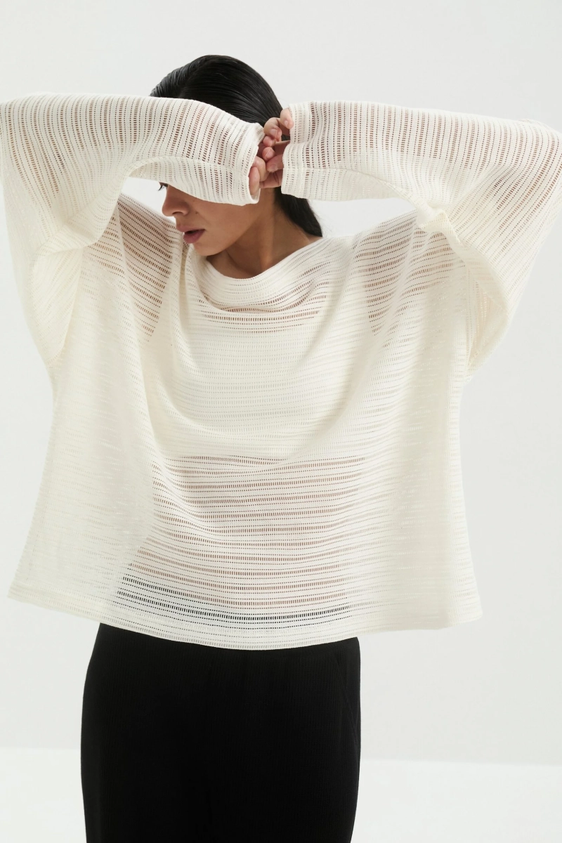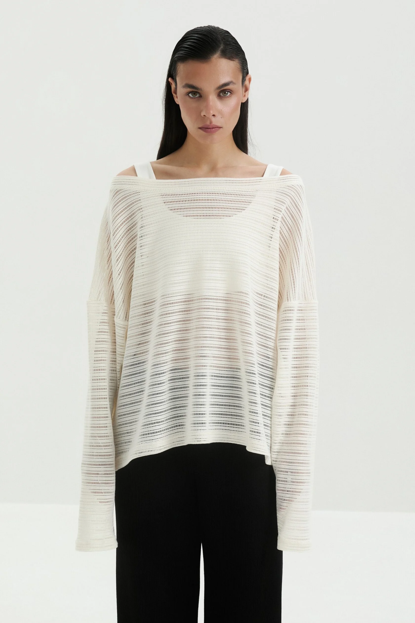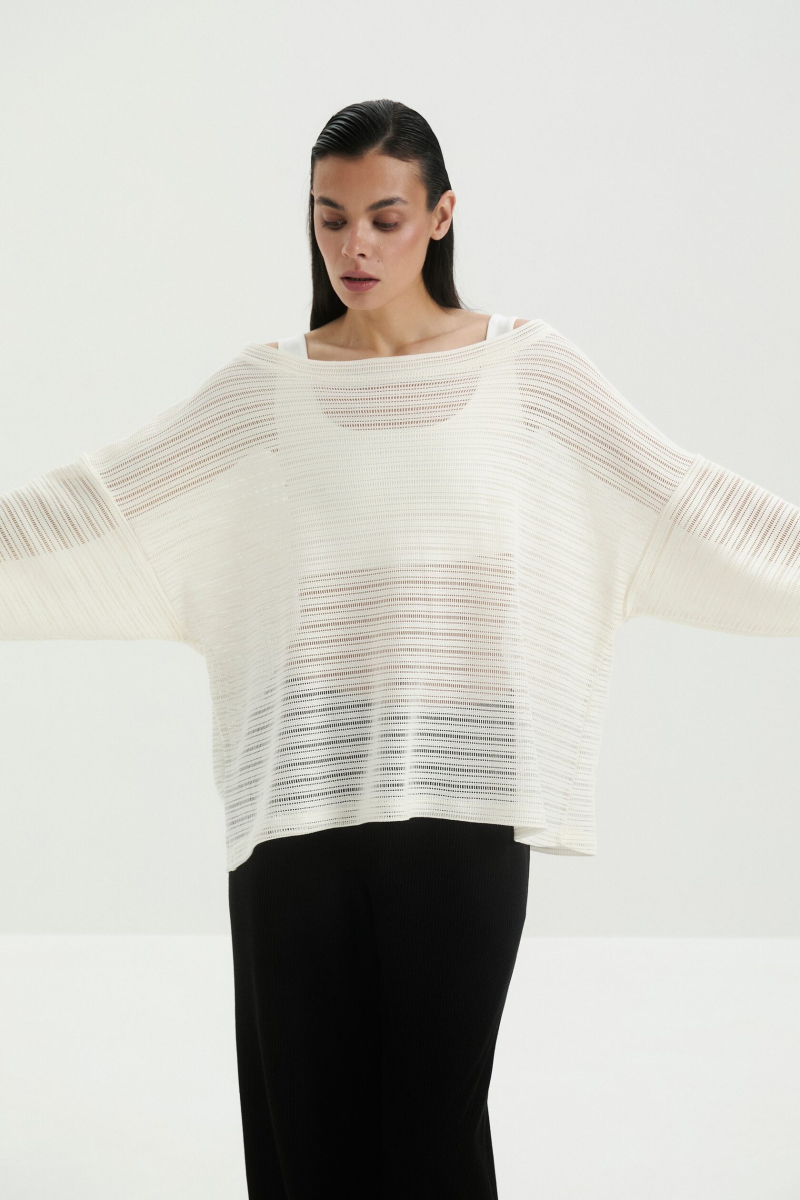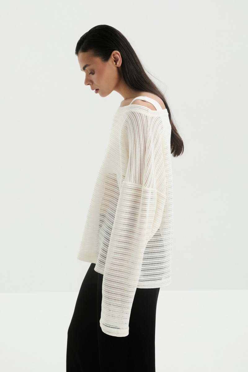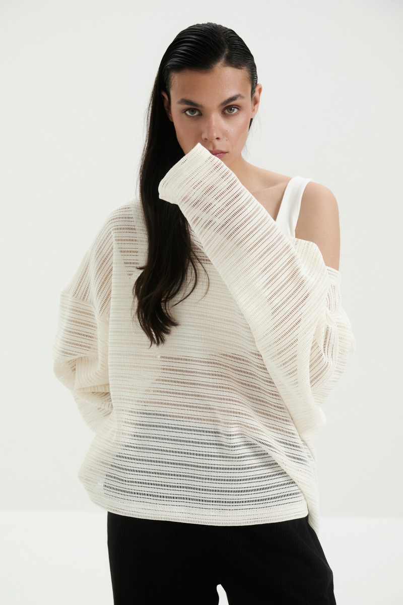 Легкий, невесомый лонгслив из ажурной вязки. Более расслабленный вид ему придает спущенная линия плеча, поэтому он отлично подходит для создания различных образов: от повседневных в качестве первого слоя до праздничных с юбками или брюками.