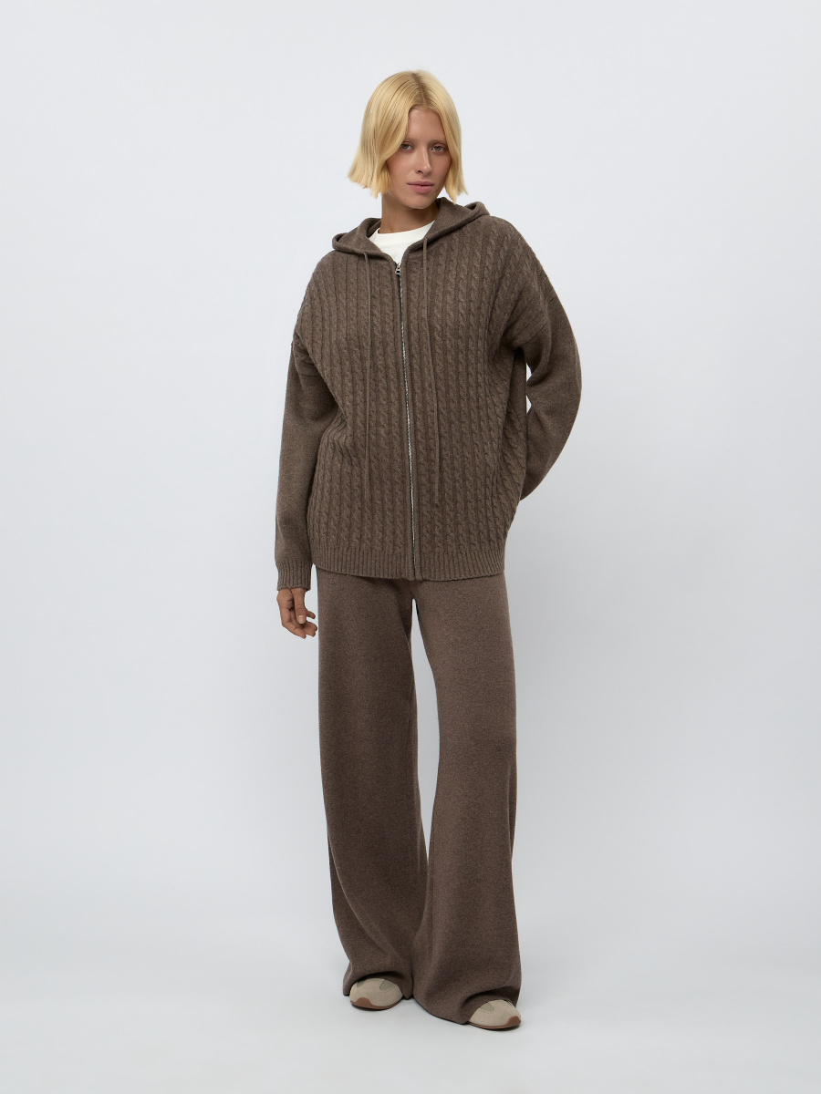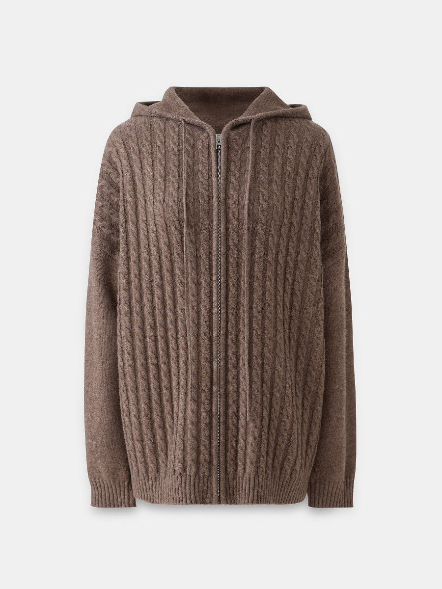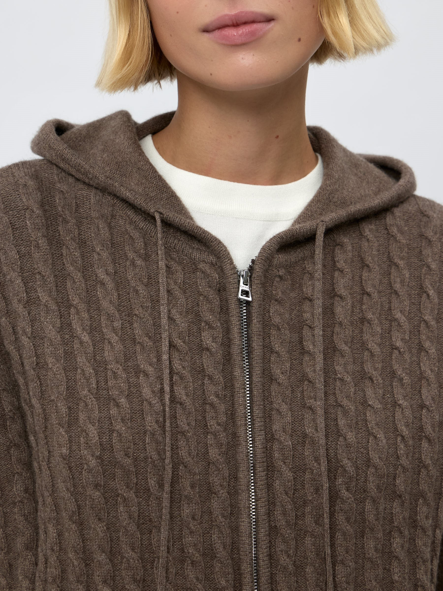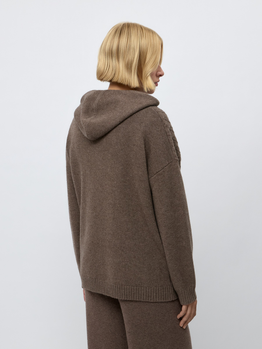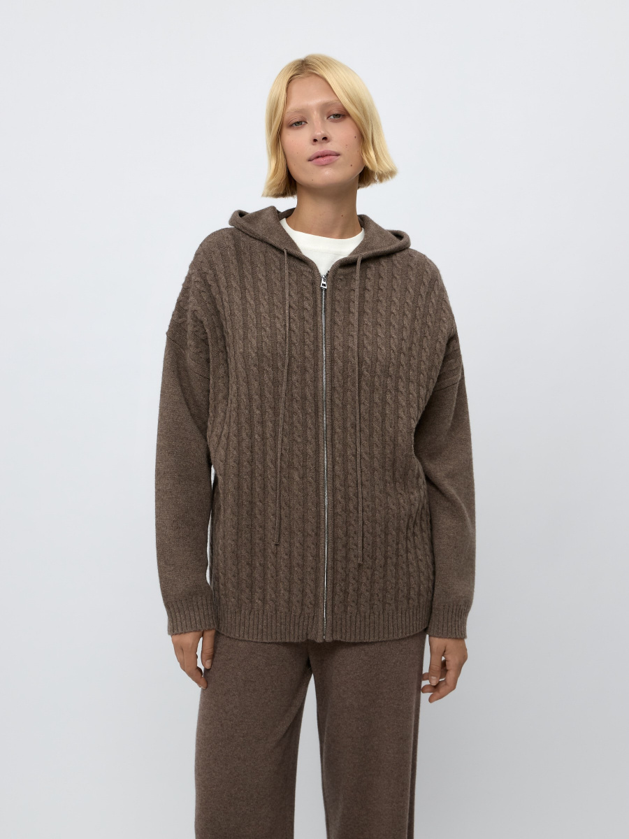Повседневный кардиган прямого свободного кроя с регулируемым капюшоном на завязках. Связан вертикальными косами из мягкой пряжи с шерстью и кашемиром. Манжет и низ оформлены фактурной резинкой. Застежка на металлическую молнию.