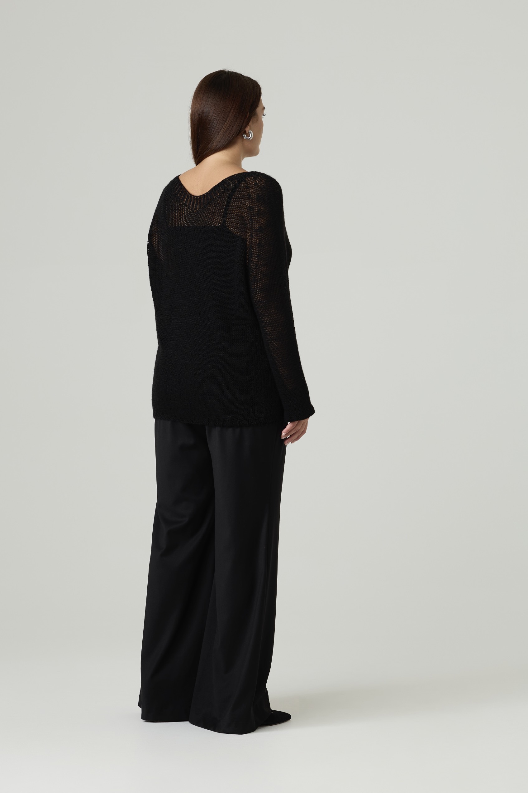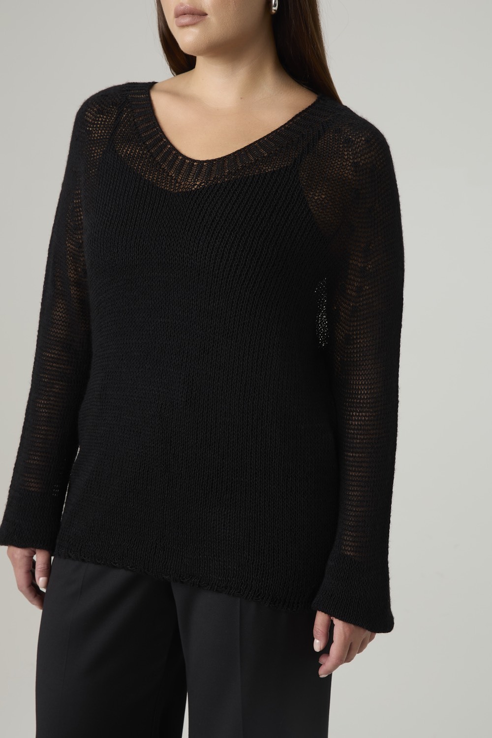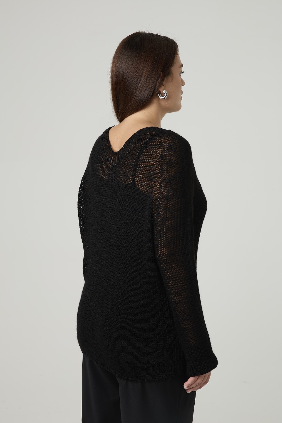 Женский джемпер черного цвета, выполнен из тонкой мягкой пряжи с вязкой средней плотности. Модель свободного силуэта с длинными рукавами реглан и V-образным вырезом горловины, подчеркивающим линию шеи. Низ изделия и манжеты связаны резинкой для комфортной посадки. Длина джемпера стандартная, закрывает линию бедер.