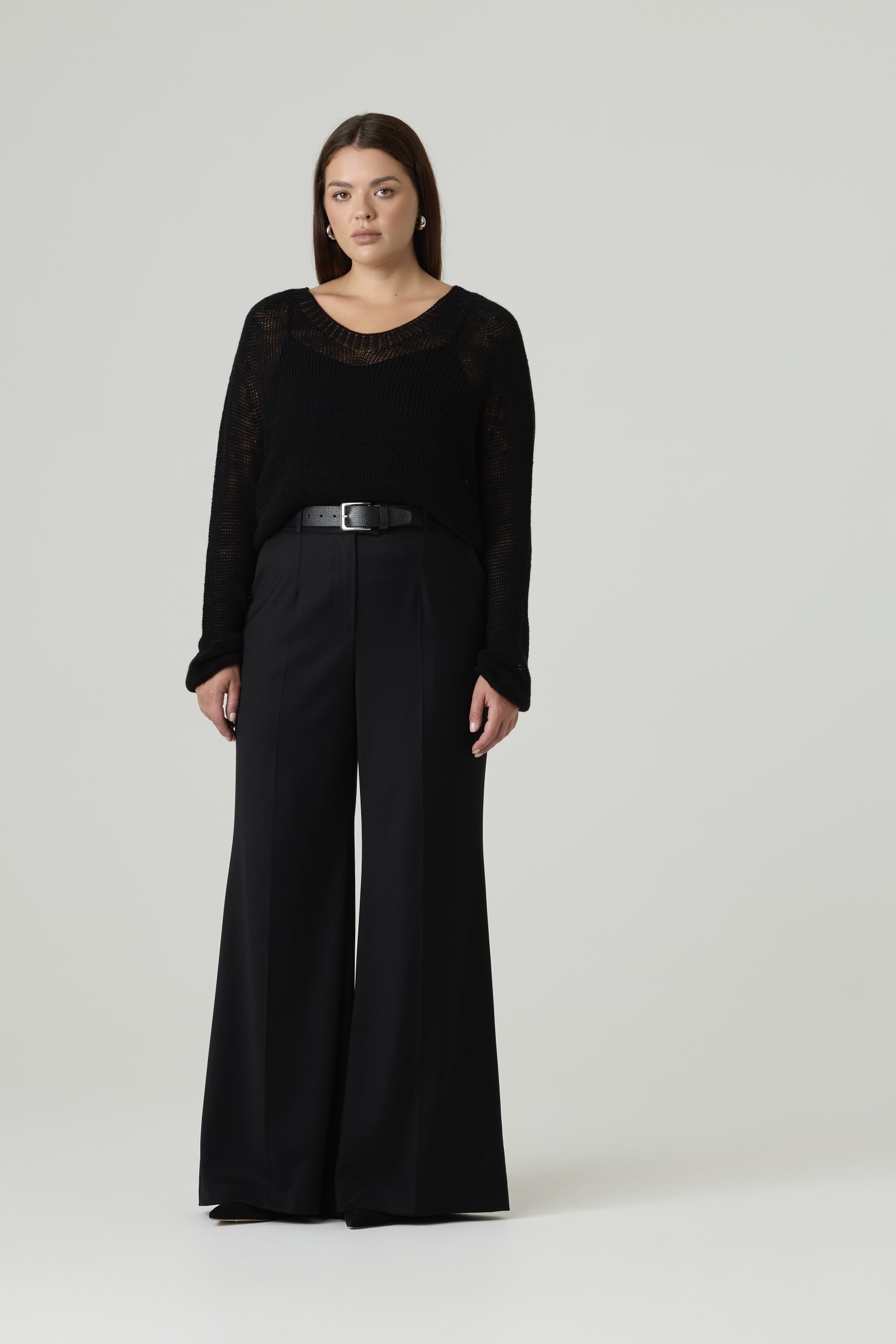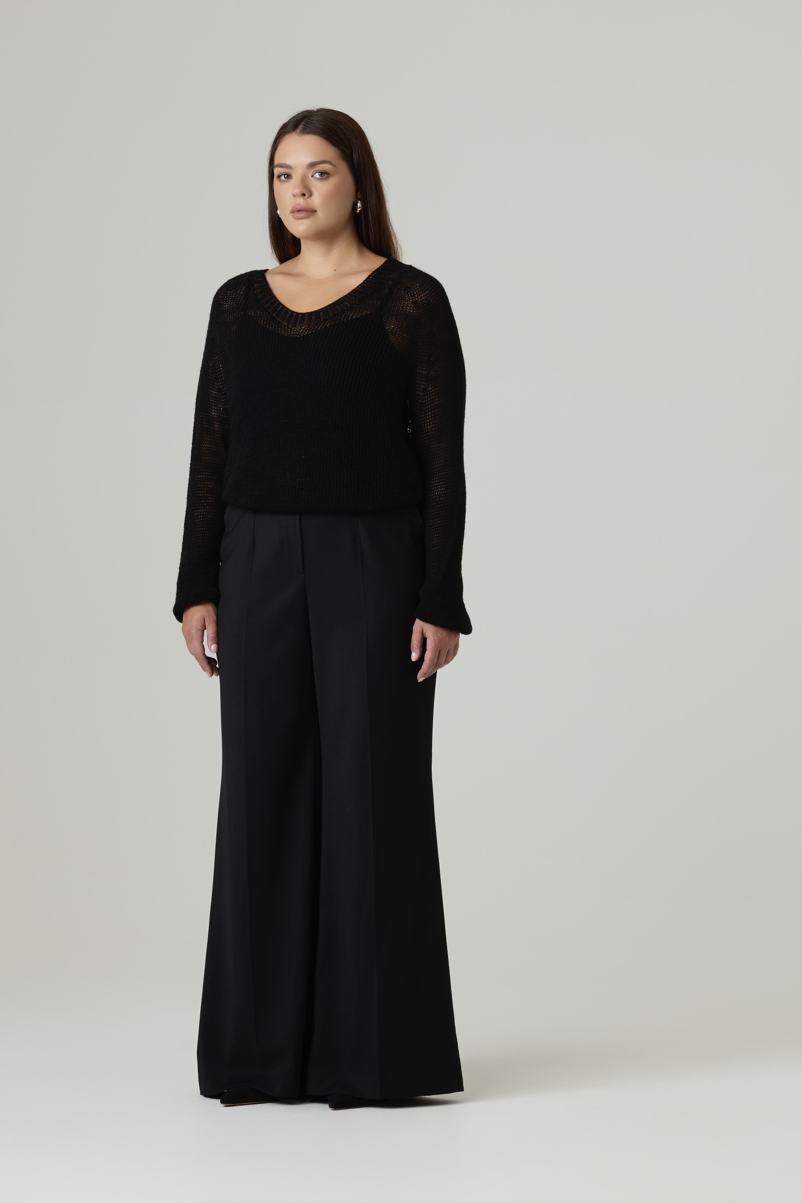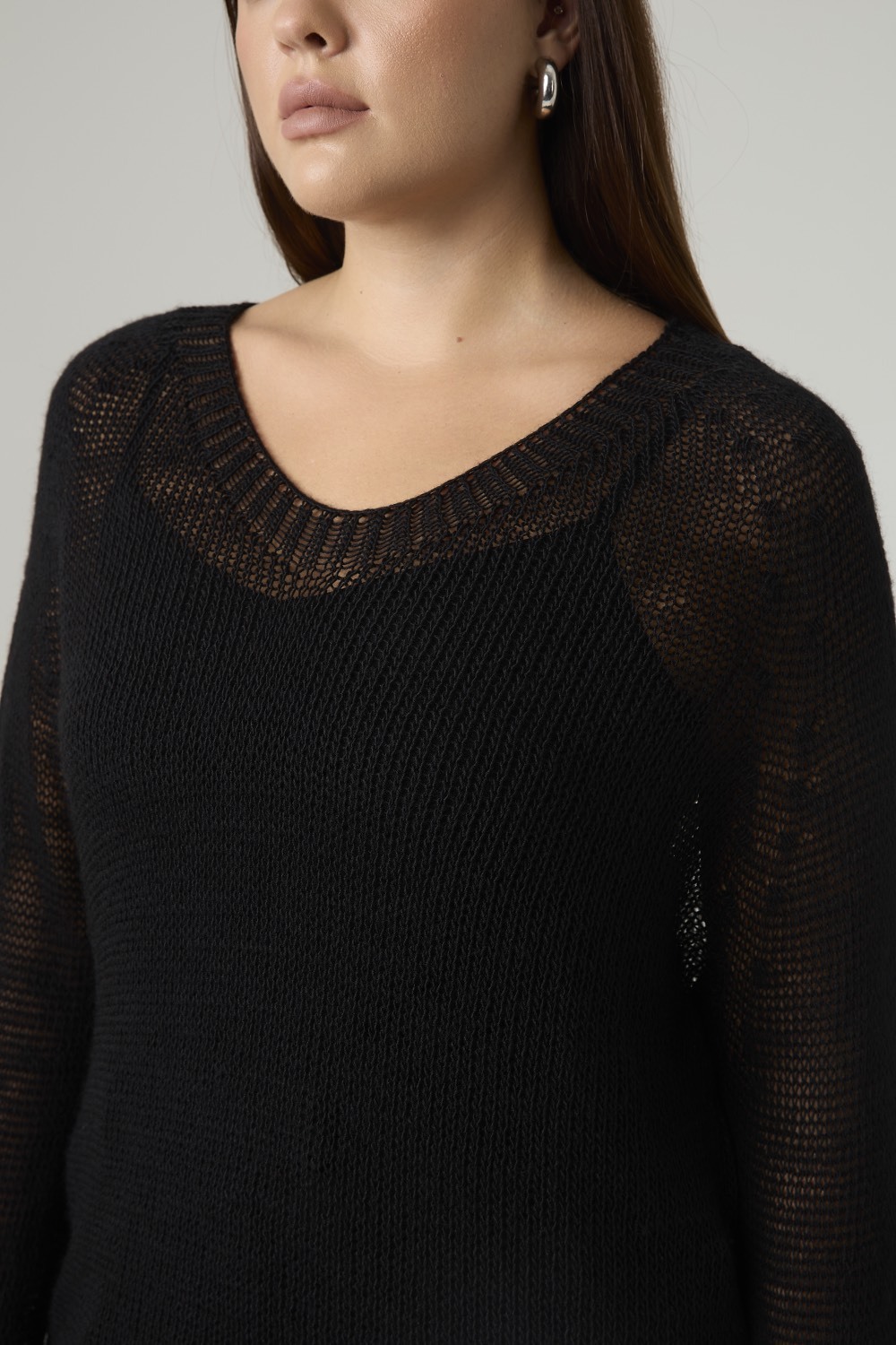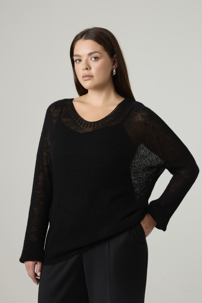 Женский джемпер черного цвета, выполнен из тонкой мягкой пряжи с вязкой средней плотности. Модель свободного силуэта с длинными рукавами реглан и V-образным вырезом горловины, подчеркивающим линию шеи. Низ изделия и манжеты связаны резинкой для комфортной посадки. Длина джемпера стандартная, закрывает линию бедер.