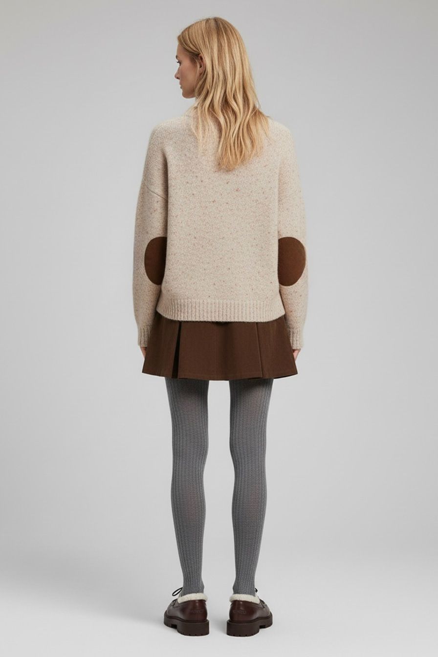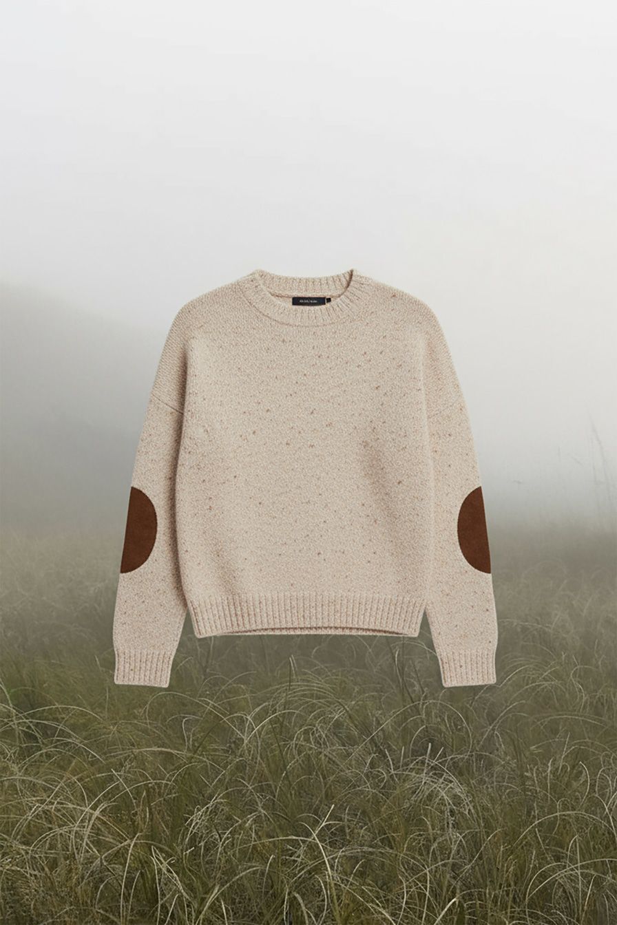 Бежевый джемпер из смесовой ткани с добавлением шерсти и хлопка – модель свободного кроя со спущенной линией плеч. Джемпер дополнен контрастными заплатками на рукавах.