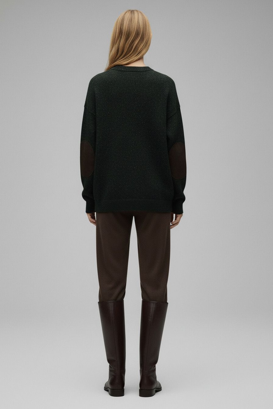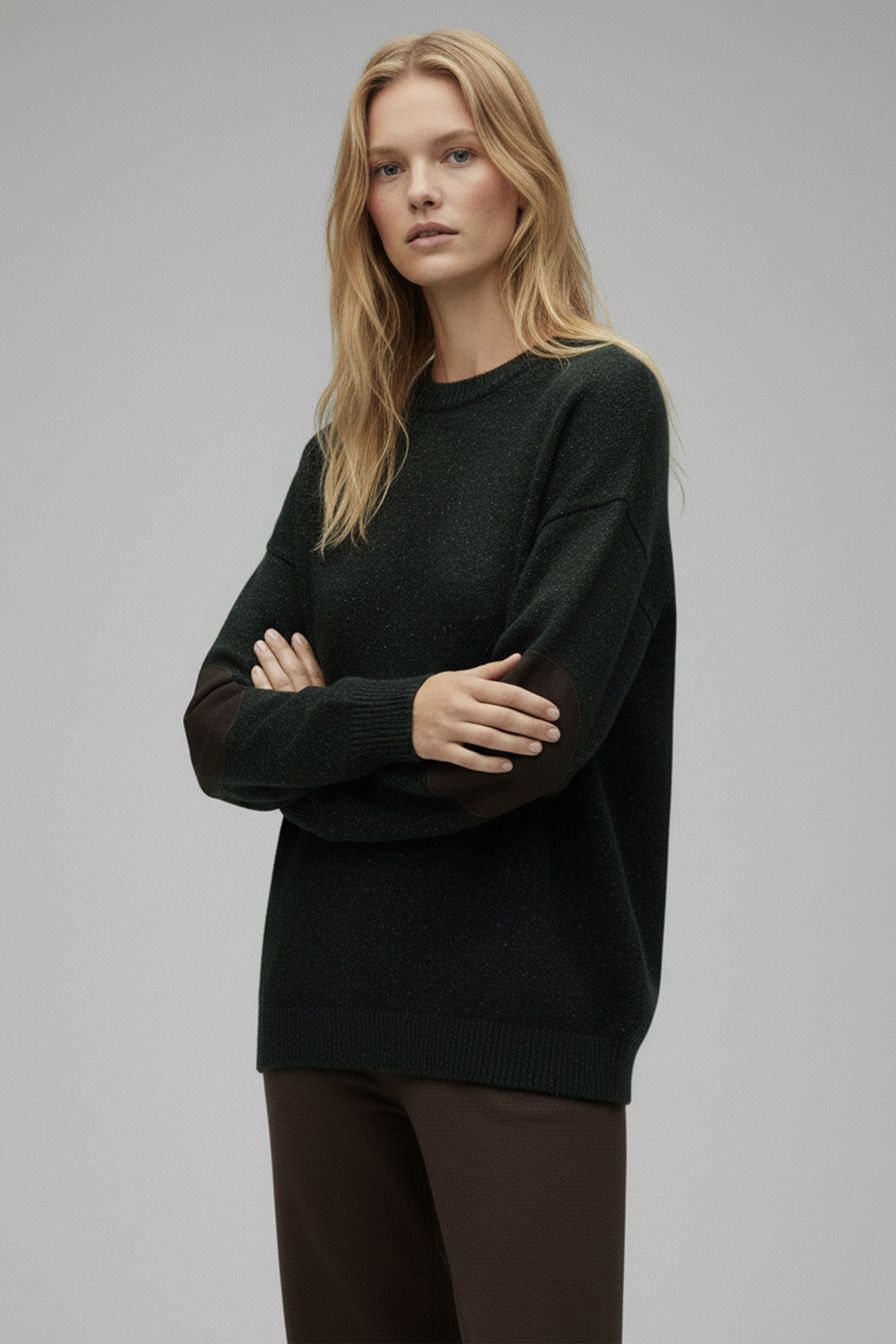 Зеленый джемпер из смесовой ткани с добавлением шерсти и хлопка – модель свободного кроя со спущенной линией плеч. Джемпер дополнен контрастными заплатками на рукавах.