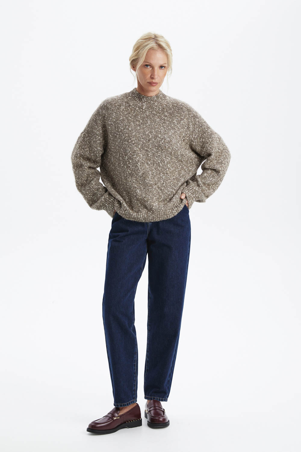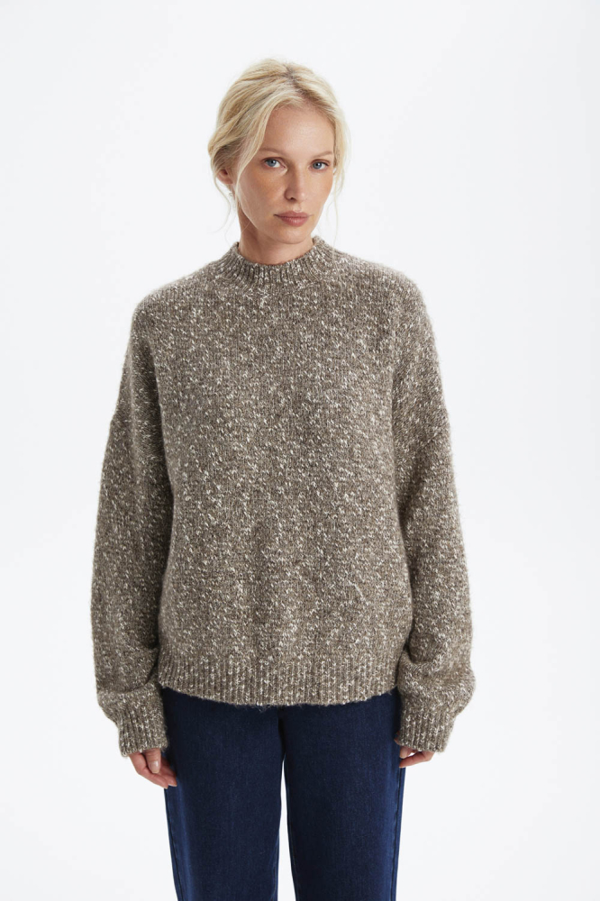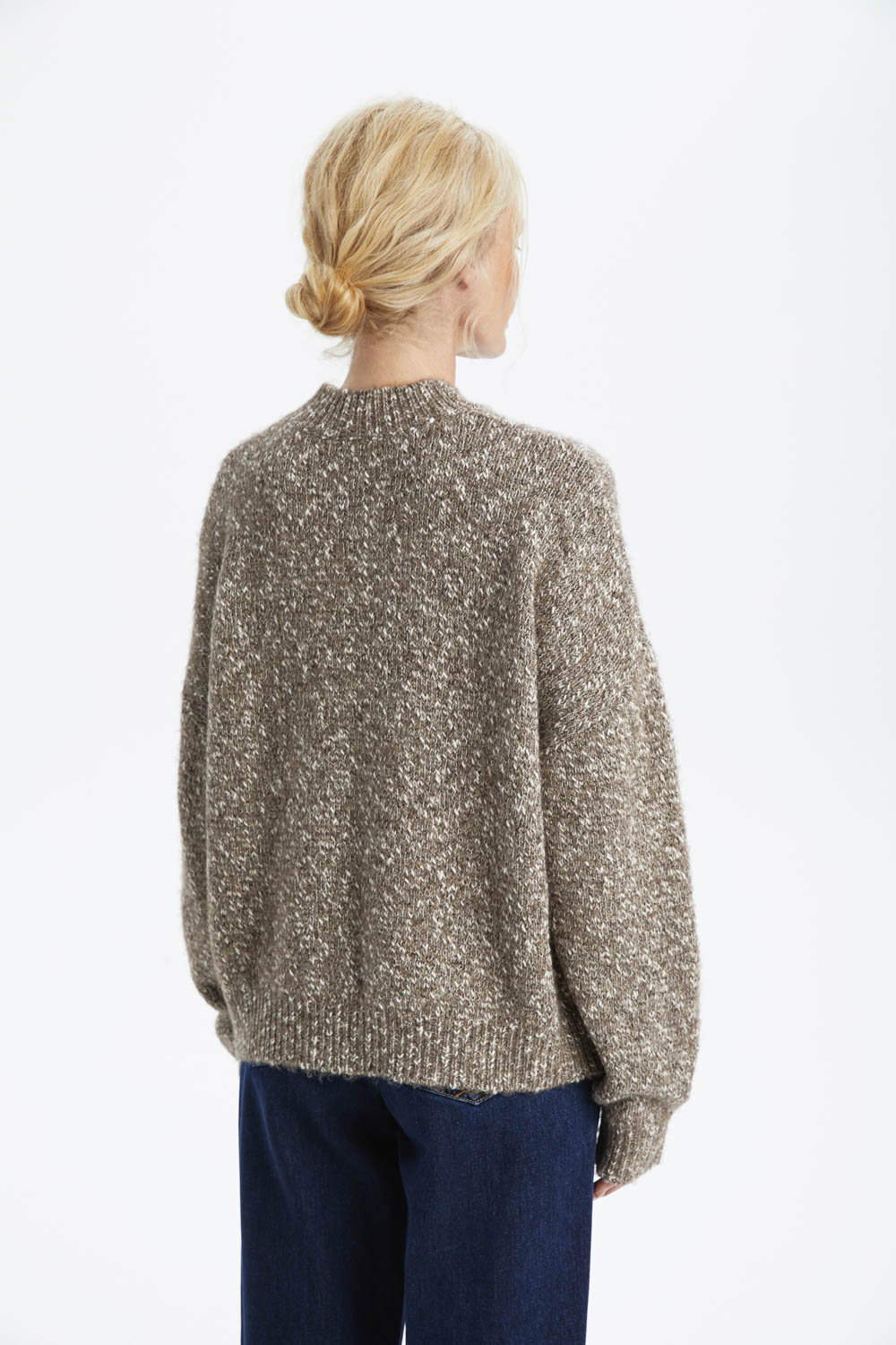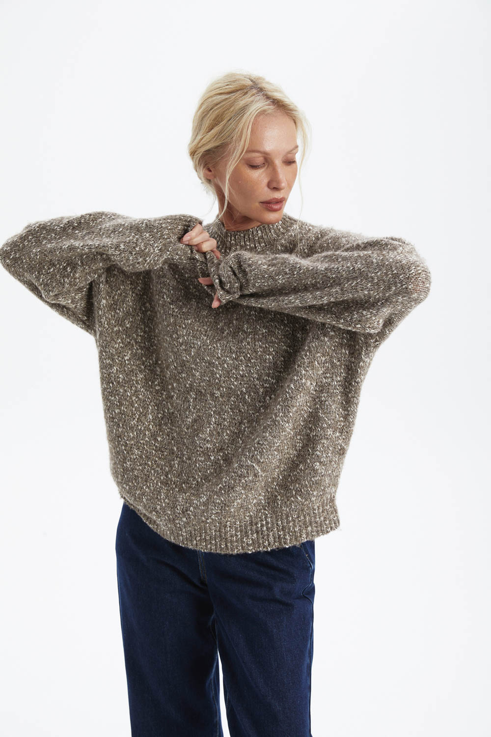 Объёмный свитер прямого силуэта выполнен из мягкой фактурной пряжи с буклированным эффектом в серо-бежевом меланже с белыми вкраплениями.