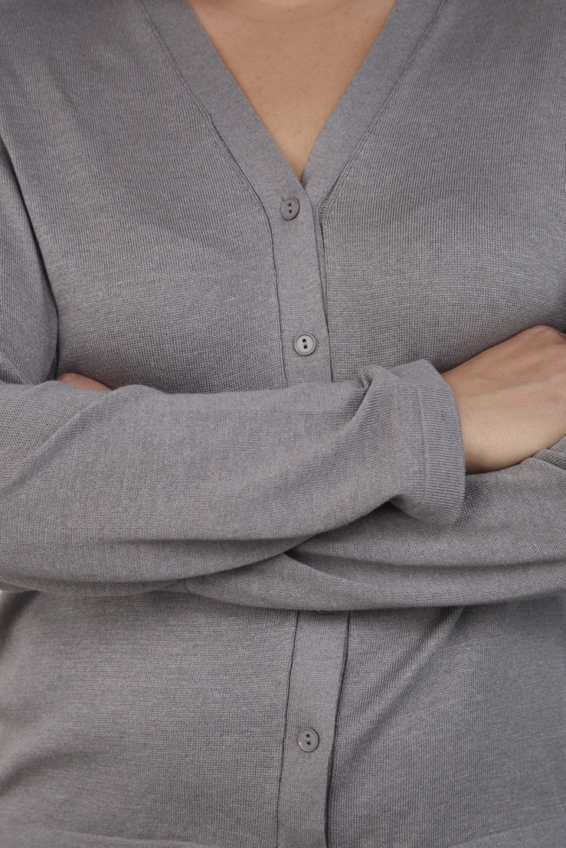Кардиган базового серого цвета из мягкой и очень приятной к телу акриловой ткани тонкой деликатной вязки. V-образный вырез горловины эффектно подчеркивает шею и удлиняет ее.