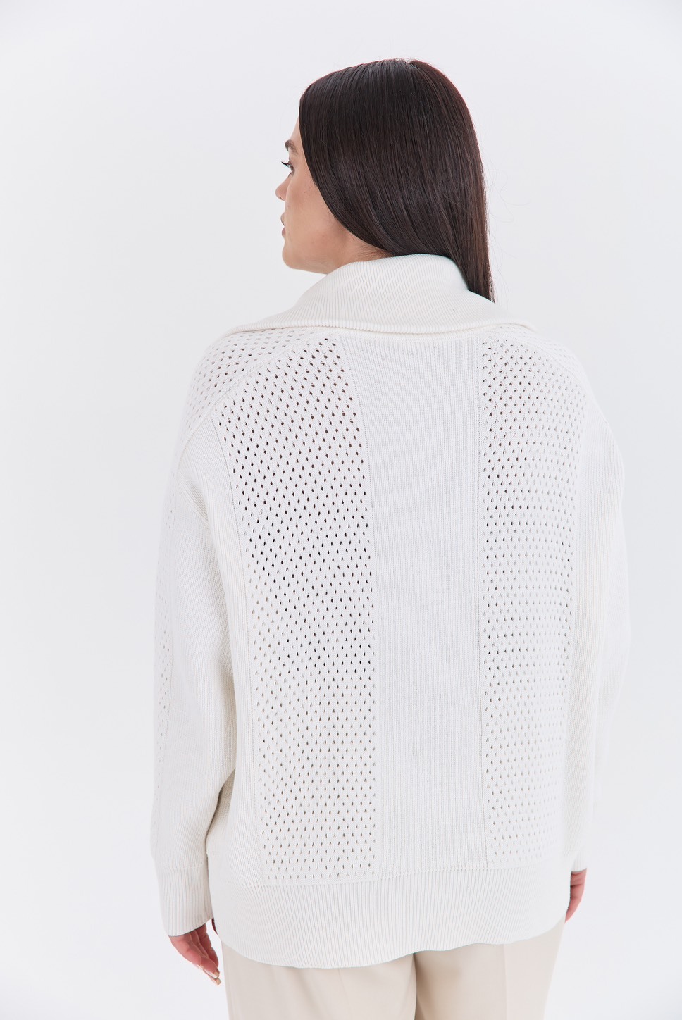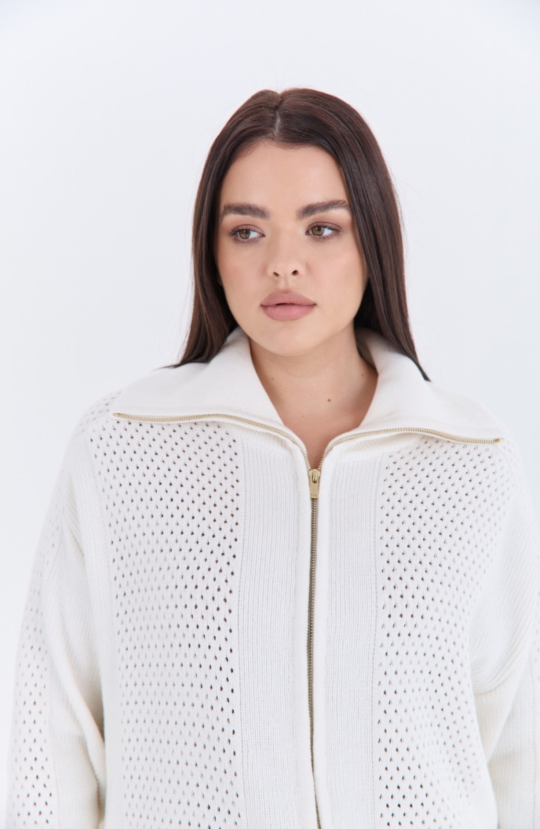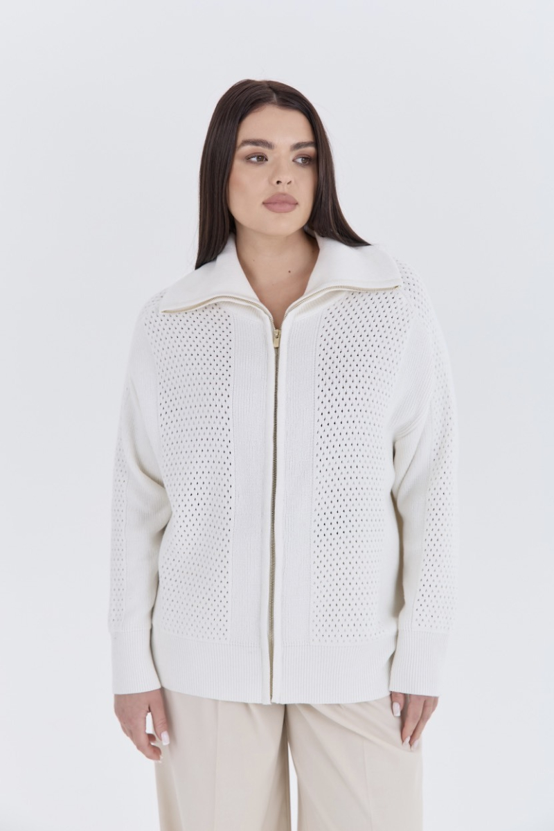 Кардиган из мягкой пряжи молочного оттенка с декоративными ажурными полочками, придающими изделию женственность и легкость. Универсальная модель, подходящая как для офисного, так и для повседневного гардероба. Длинные рукава и плотная вязка обеспечивают тепло и комфорт.