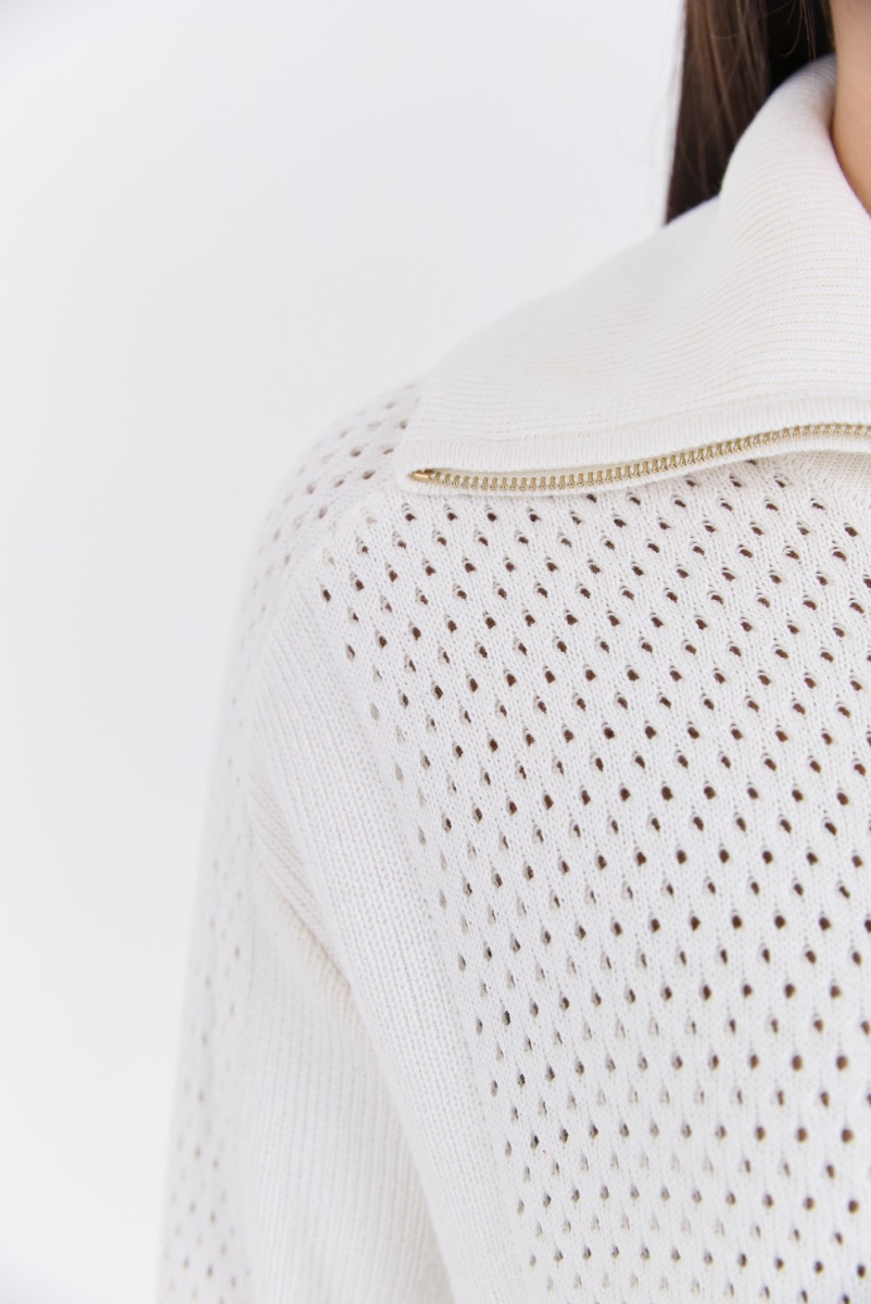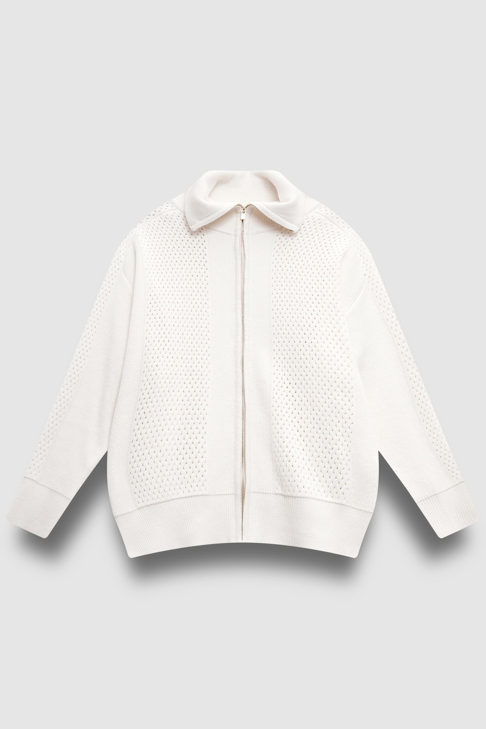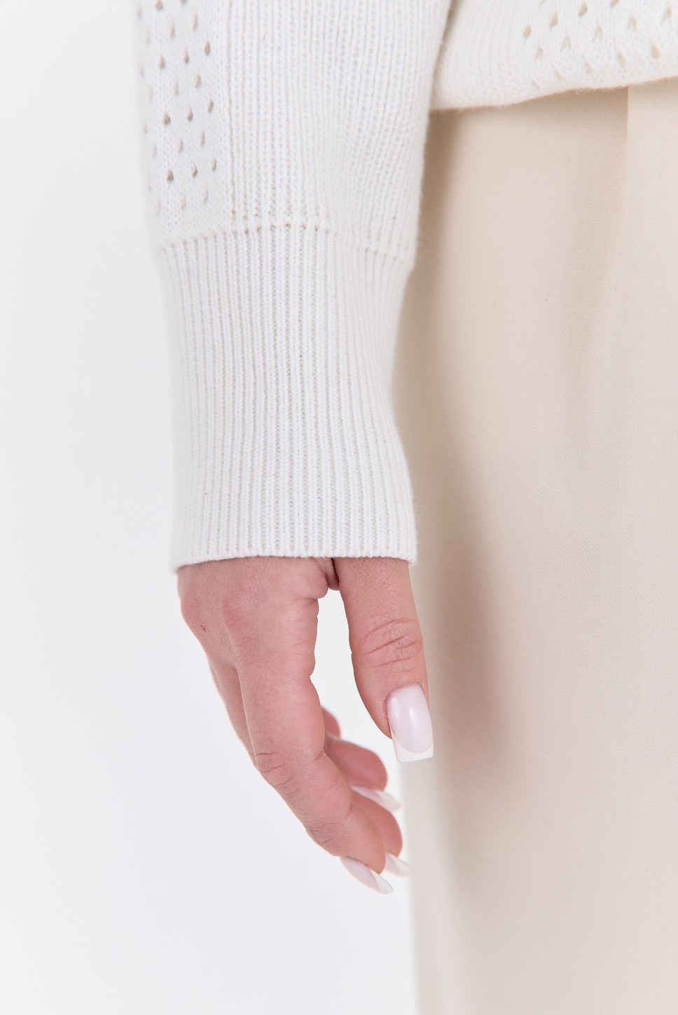 Кардиган из мягкой пряжи молочного оттенка с декоративными ажурными полочками, придающими изделию женственность и легкость. Универсальная модель, подходящая как для офисного, так и для повседневного гардероба. Длинные рукава и плотная вязка обеспечивают тепло и комфорт.