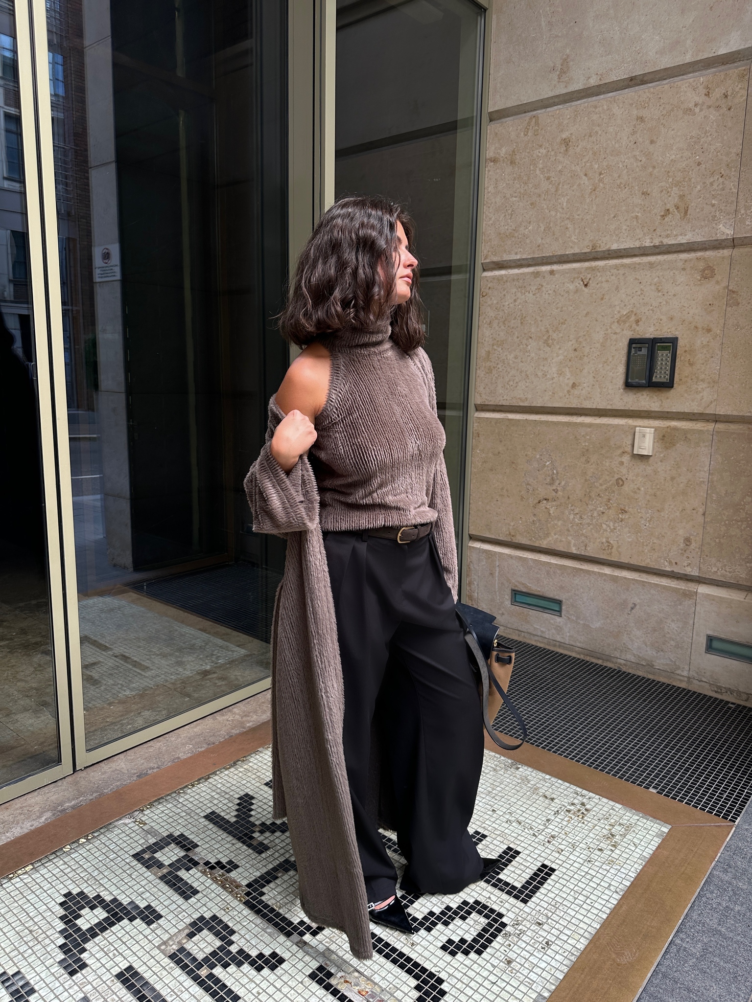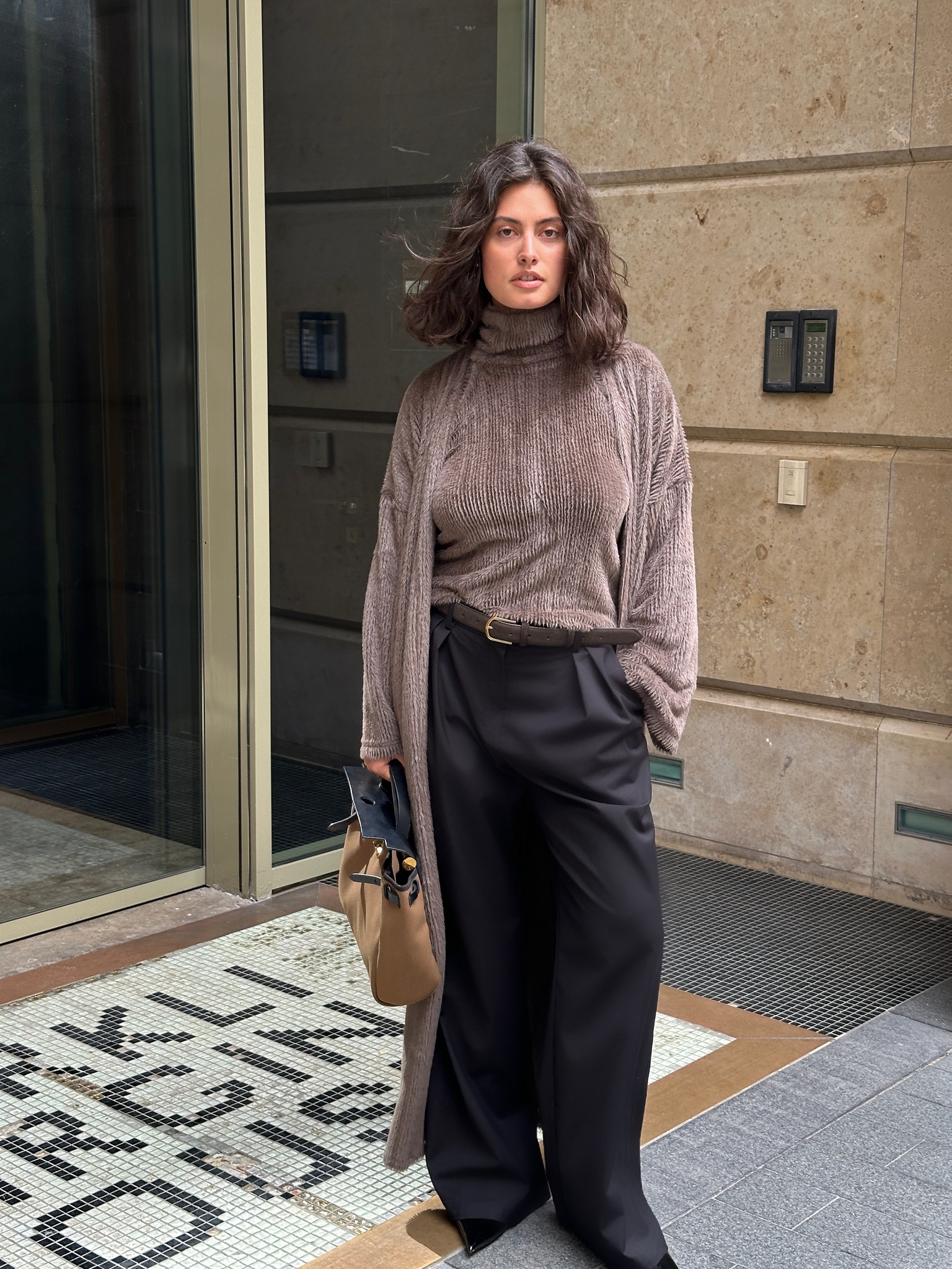 Накидка-кардиган из пушистого коричневого трикотажа согреет вас в межсезонье.