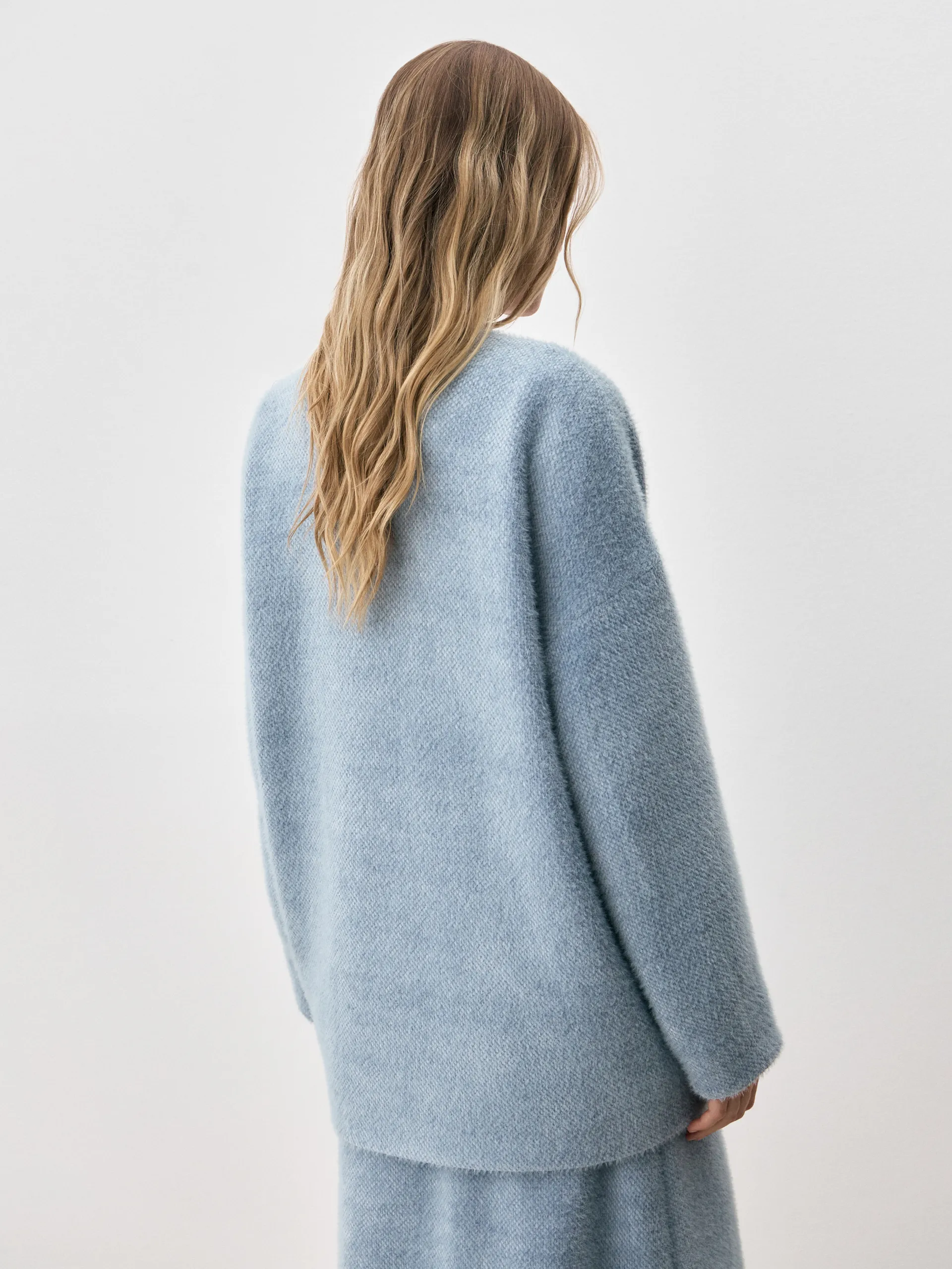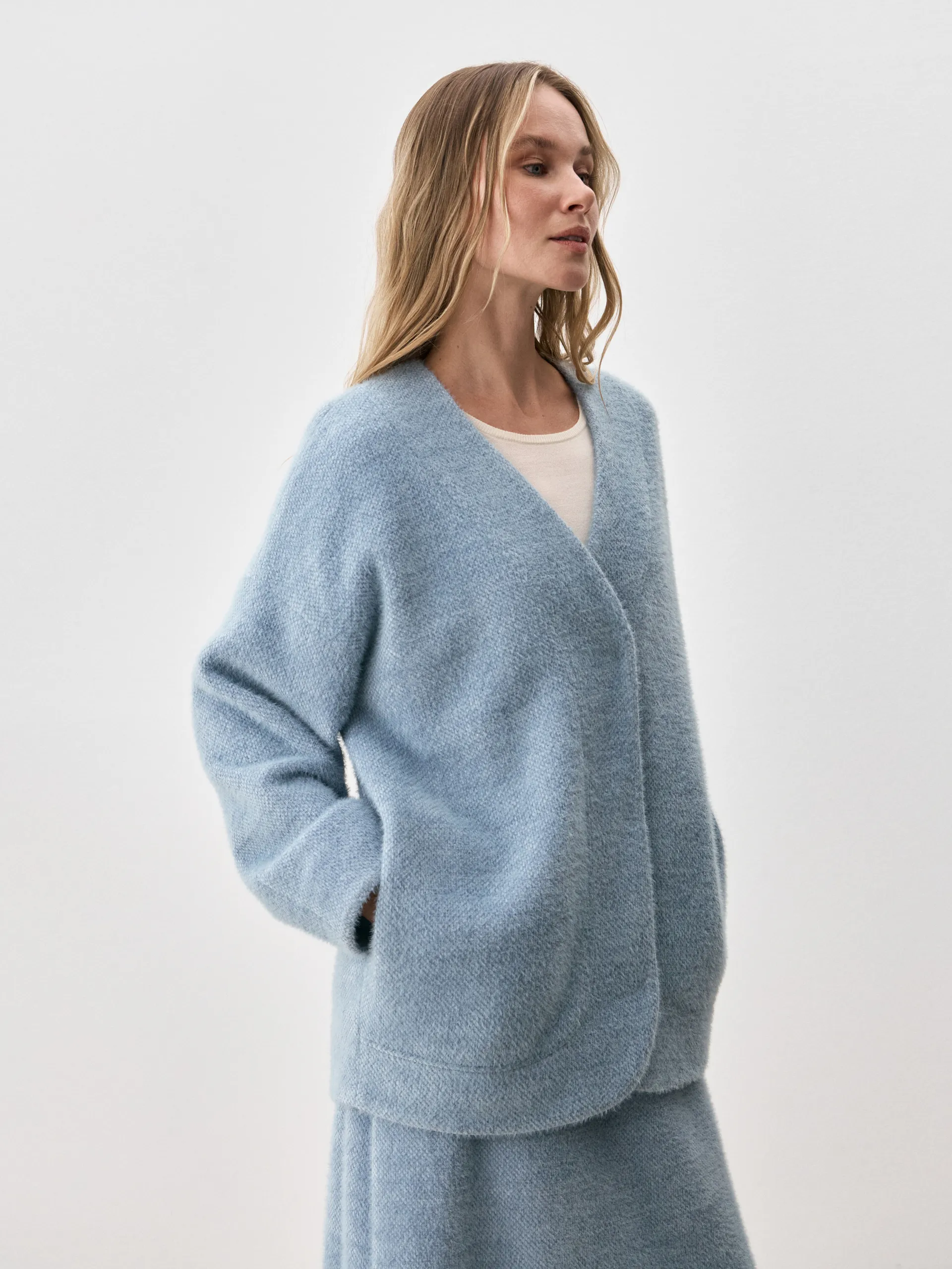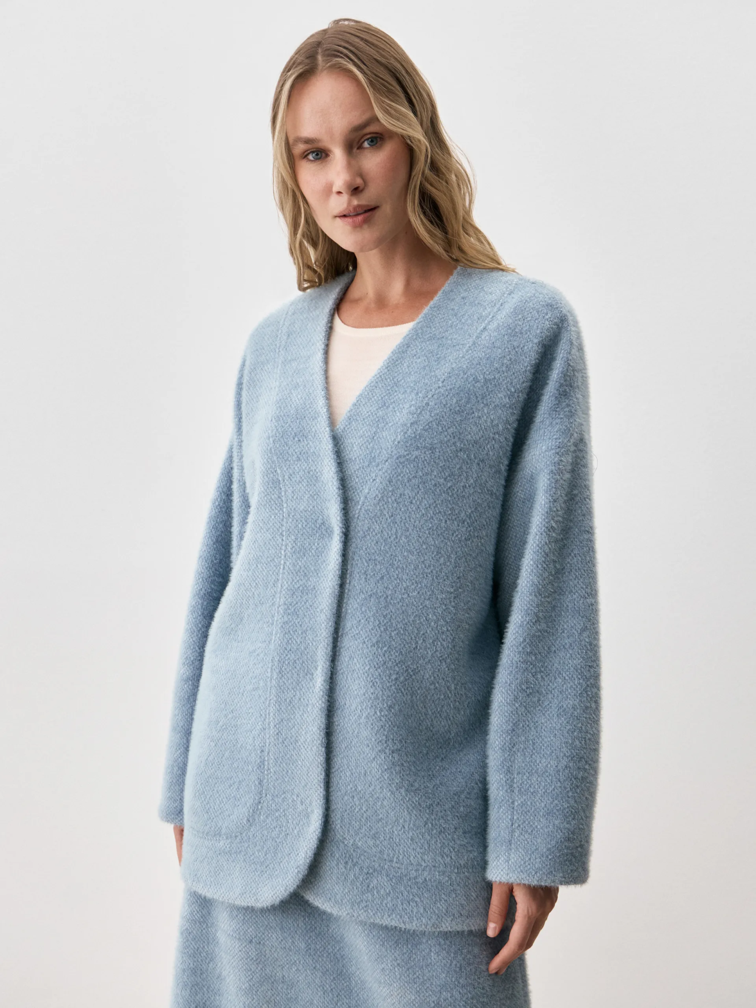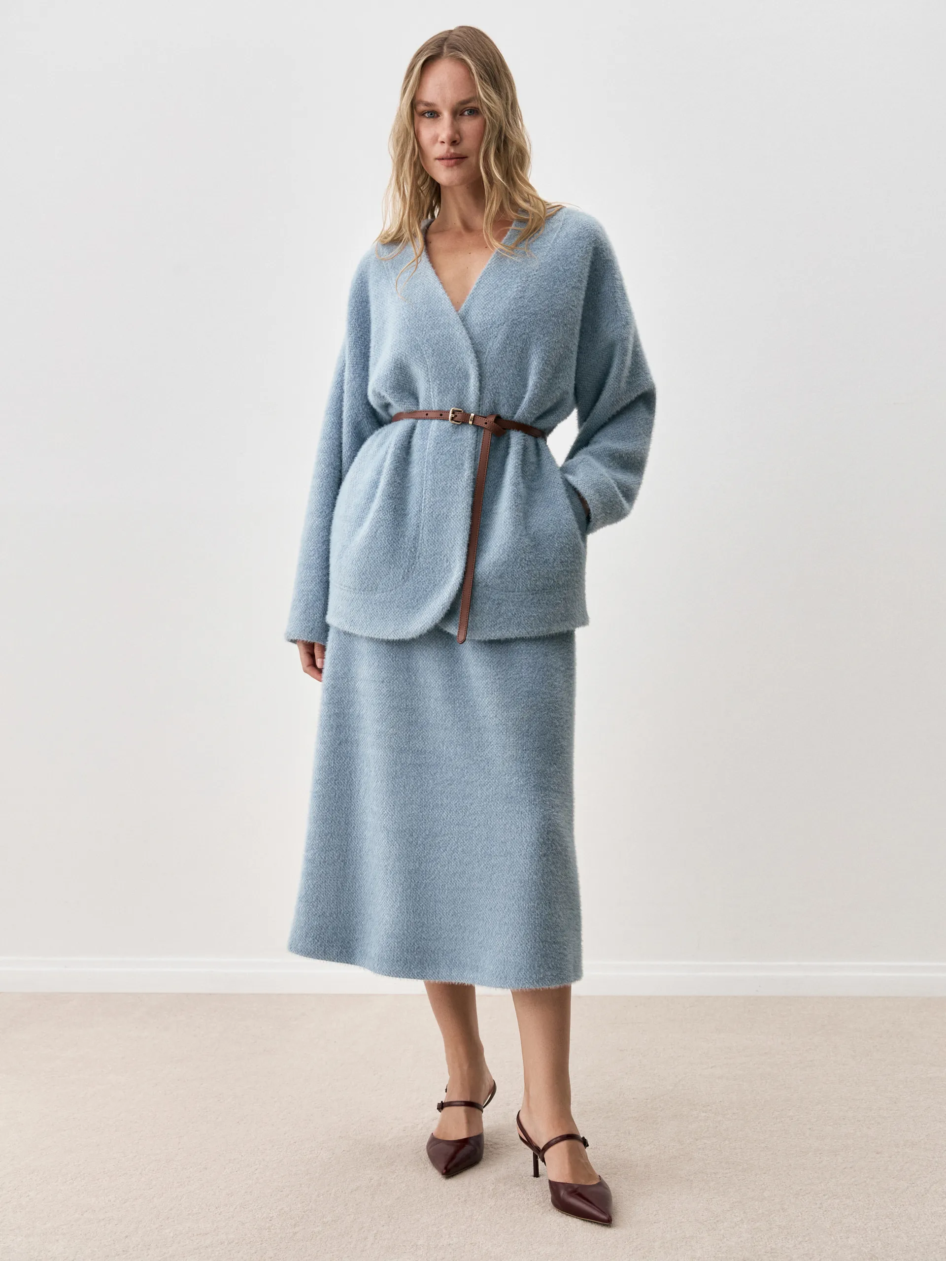 Кардиган Carolyn. Объемный силуэт кардигана продолжает оставаться в тренде, несмотря на то, что дизайнеры стремятся сместить фокус на женственные фасоны. Но мы полюбили oversize, ведь с его помощью можно визуально корректировать фигуру и создавать стильные многослойные образы. Модель Carolyn выполнена в пушистой ткани, мягкой и приятной на ощупь, она, словно, окружает вас теплом и уютом. Кардиган можно носить нараспашку или акцентировать талию кожаным ремнем, тем самым, создав совершенно новый образ.