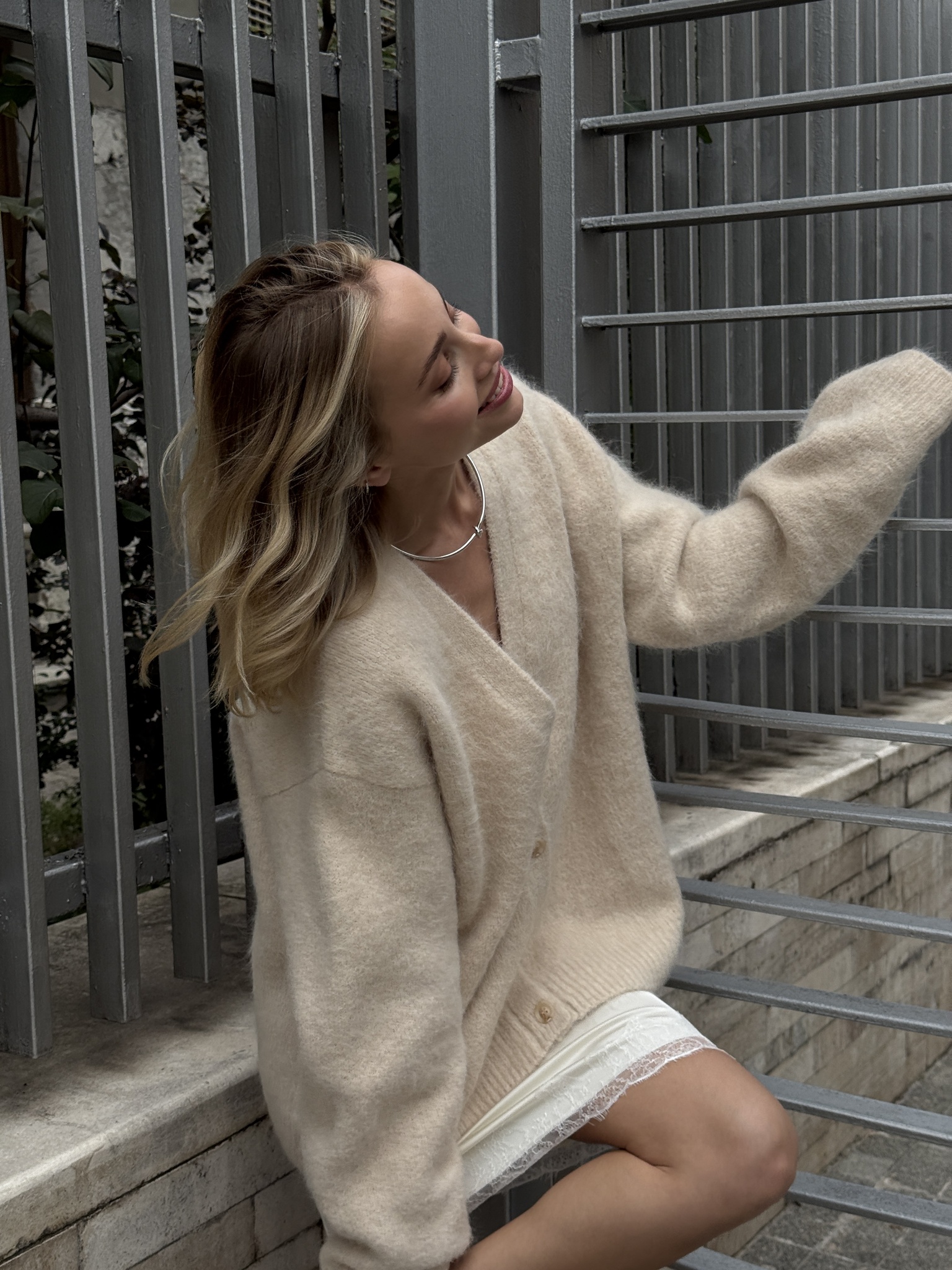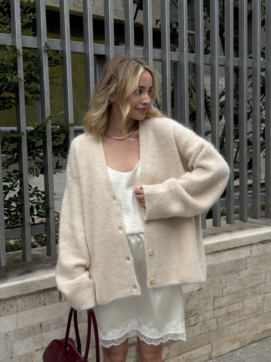 Трикотажный кардиган из пушистой пряжи на основе шерсти альпаки - идеальный выбор для тех, кто ценит детали и комфорт даже в повседневных образах.
