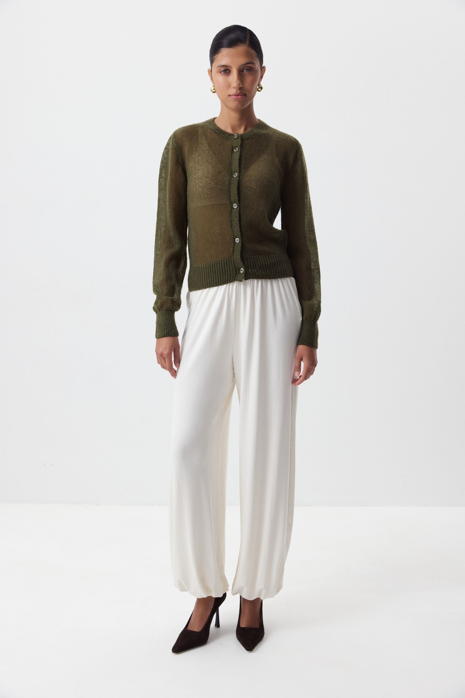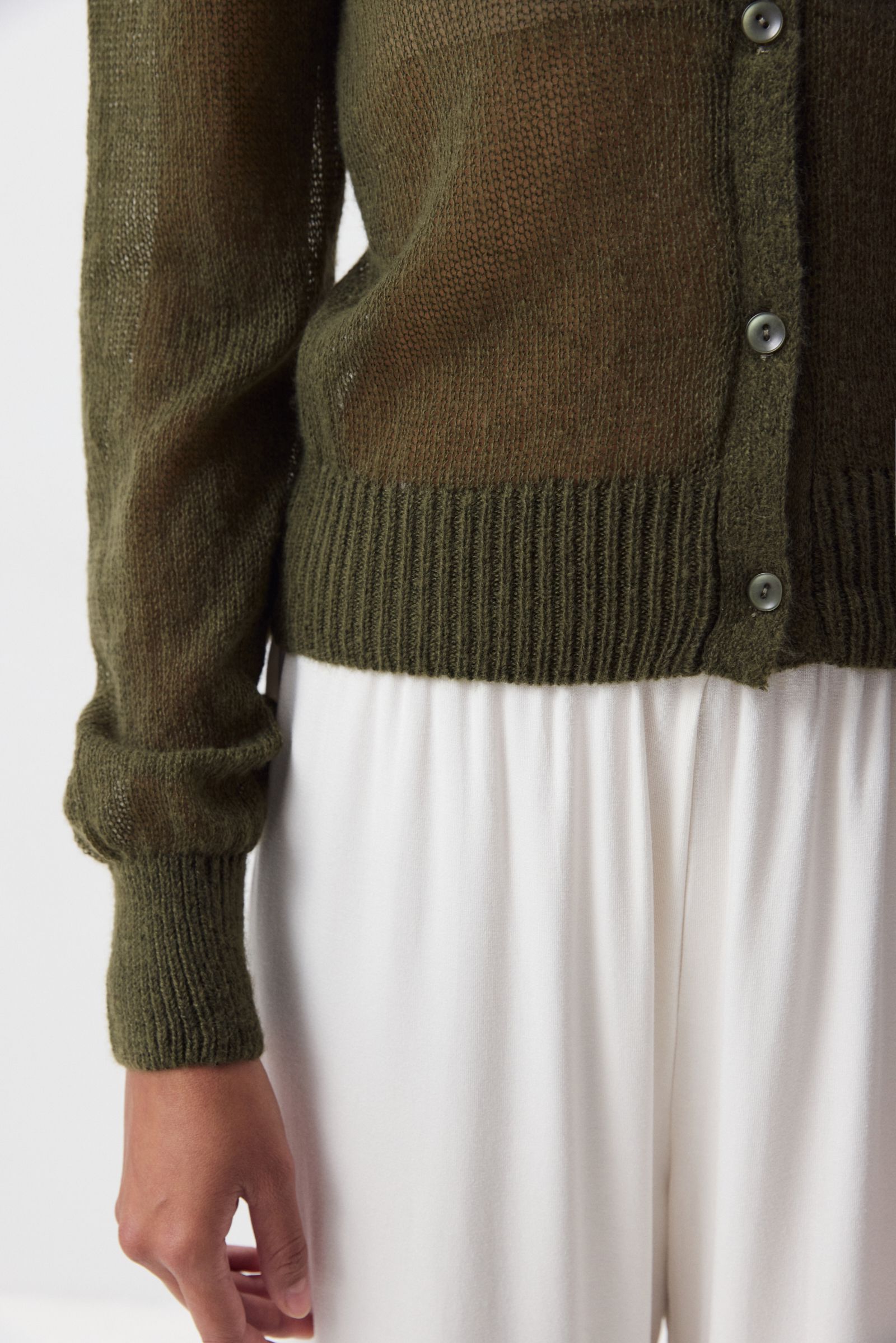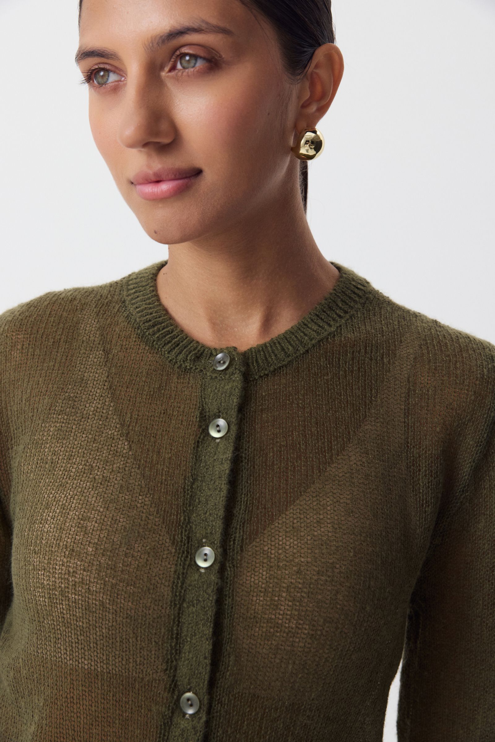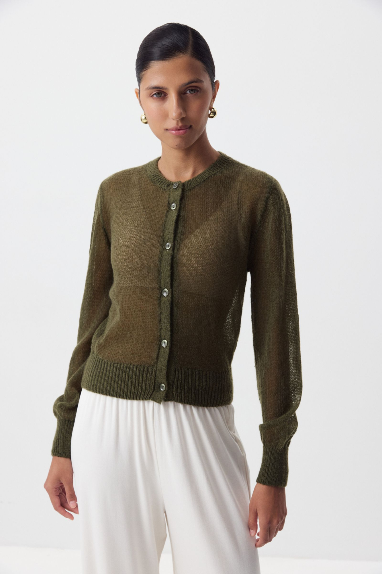 Легкий и аккуратный базовый кардиган — втачные рукава, риб по краям, классический силуэт. Связан мелкими петлями из пряжи, в составе которой 10% мохера. Такой трикотаж получается плотным и пластичным. Застегивается на петли и пуговицы по тонкой планке в тон изделия.
