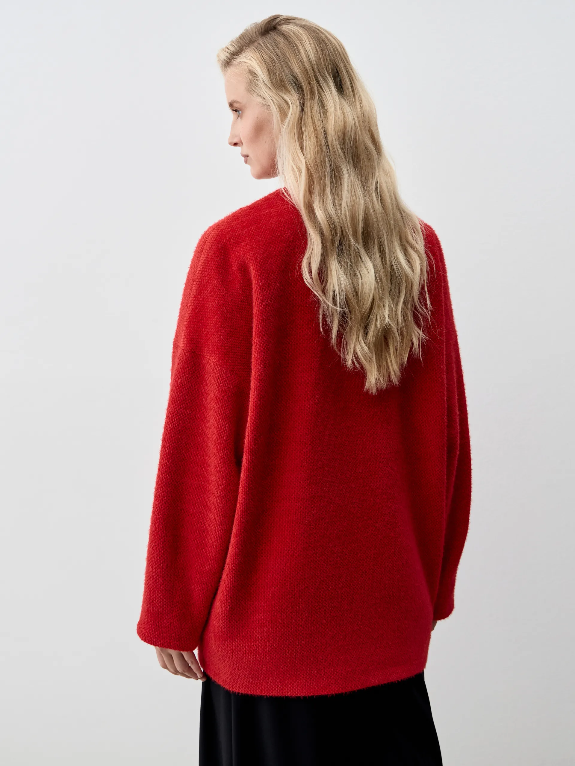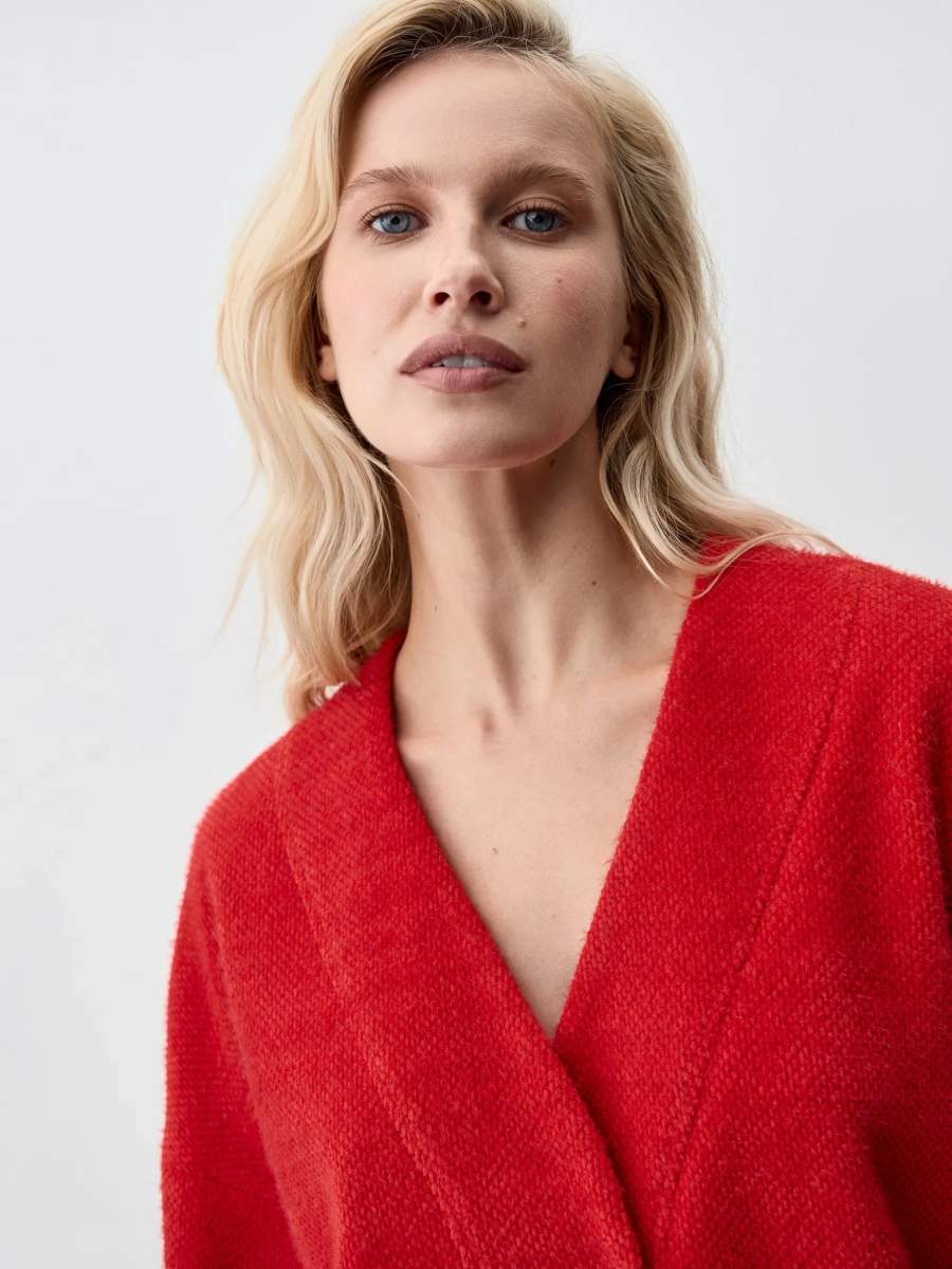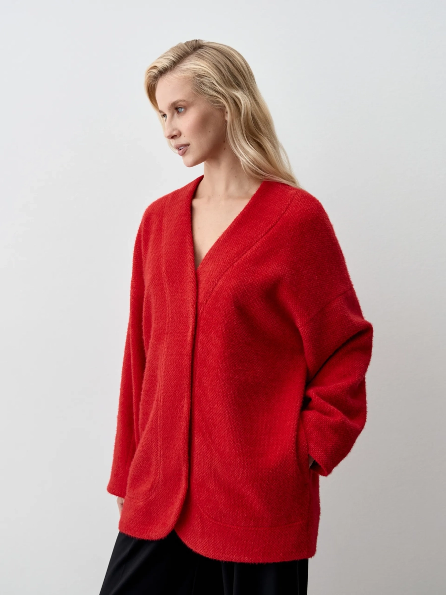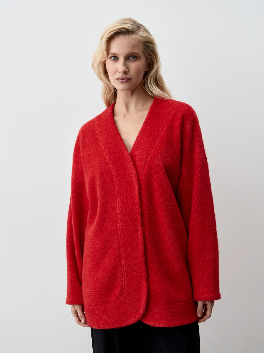 Кардиган Carolyn. Модель прямого кроя из мягкого трикотажа станет уютным и стильным акцентом в осенне-зимнем гардеробе. Яркий алый оттенок добавляет образу выразительности и легко комбинируется как с базовыми, так и с акцентными вещами. Прямой силуэт обеспечивает свободу движений, а приятная ткань дарит тепло и комфорт. Кардиган универсален в сочетаниях: элегантно смотрится с классическими брюками в офисе, непринуждённо с джинсами и футболками для повседневных выходов и женственно с платьями или юбками для романтичных образов.