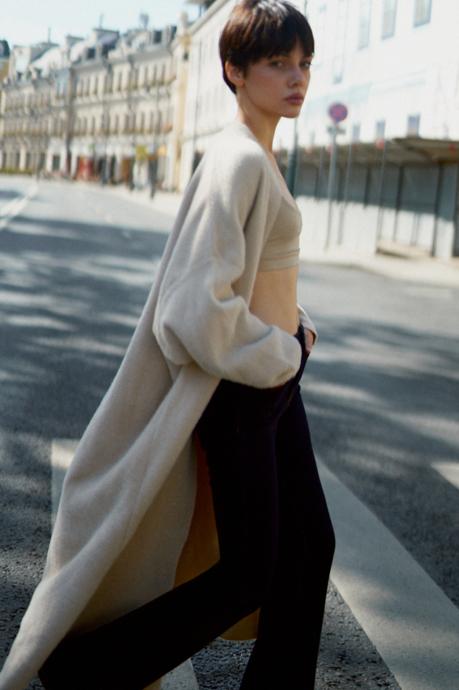 Невероятный кардиган выполнен из приятной на ощупь шерстяной ткани. Изделие, которое дарит только приятные ощущения при соприкосновении с телом. Модель в длине макси с объёмными рукавами и манжетами, со свободным краем без фиксации. Можно экспериментировать, сочетая с базовыми образами, а также включать в аутфиты с денимом, эко-кожей или сформировать total look из нежного трикотажа.