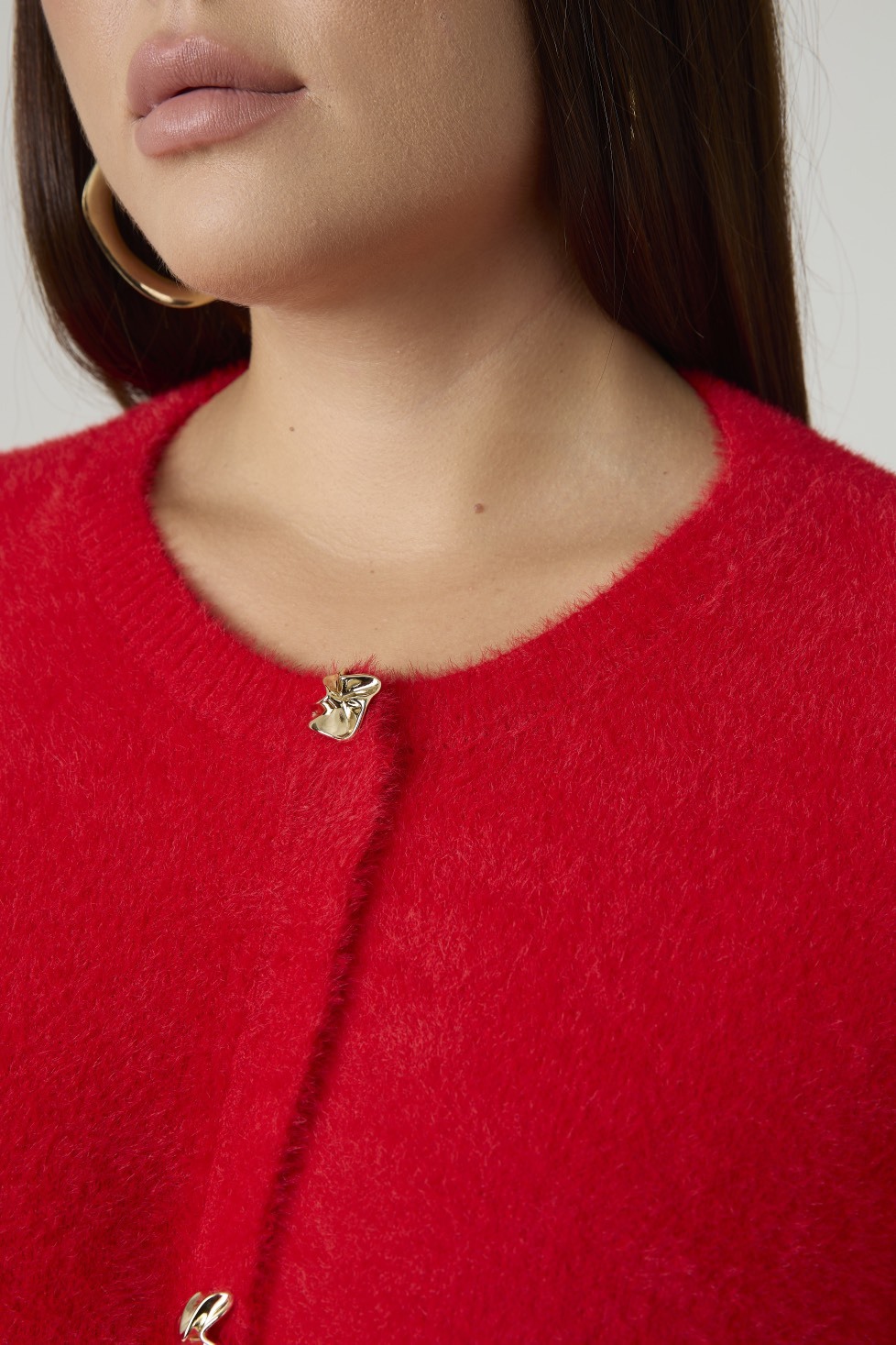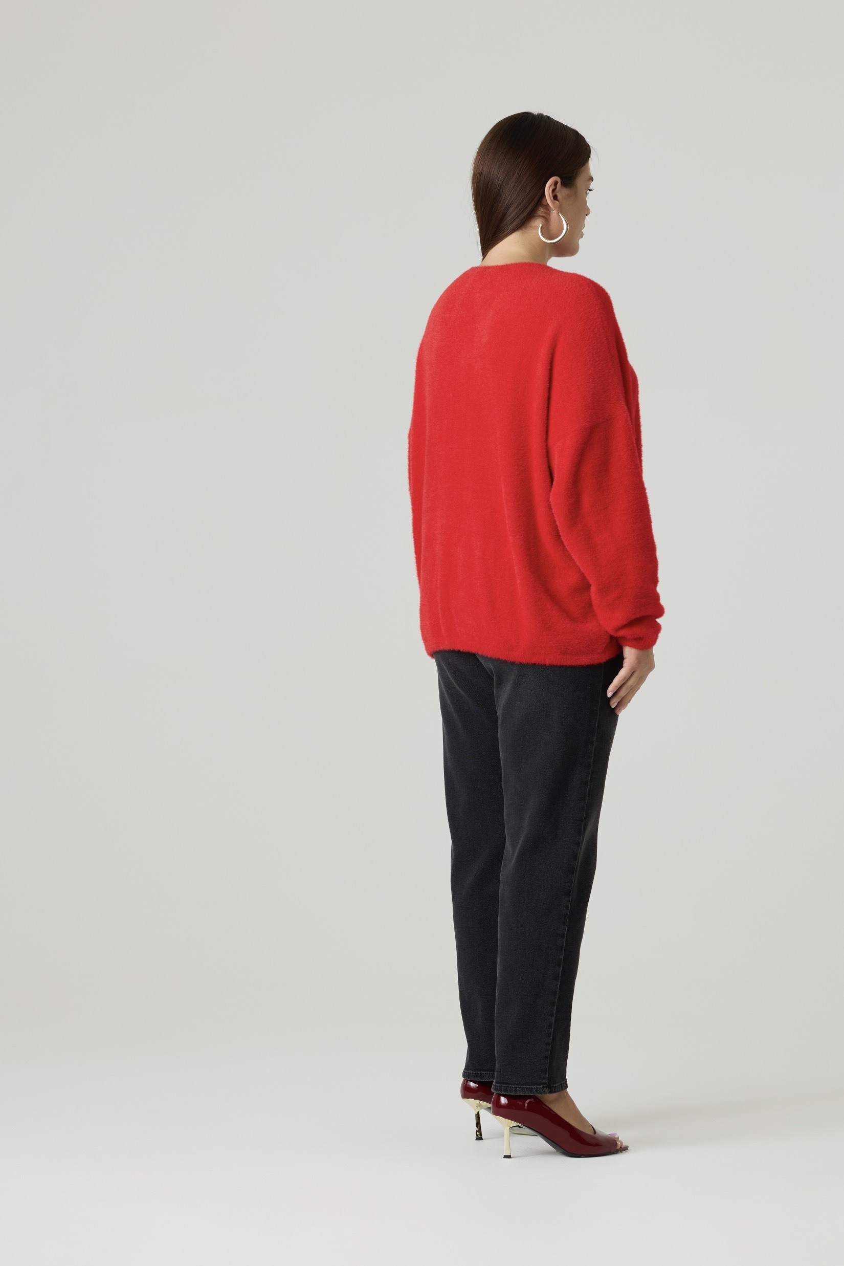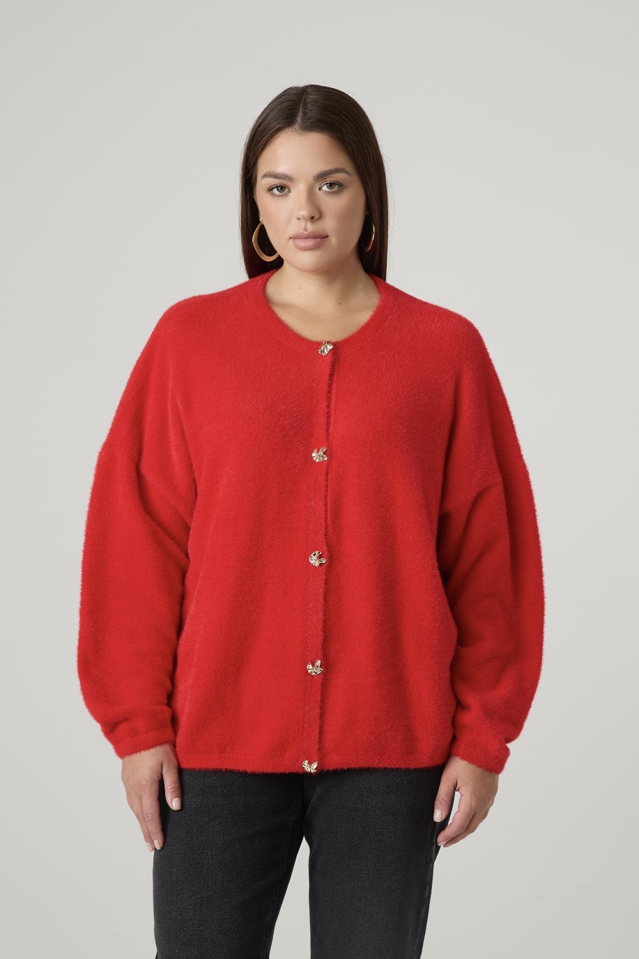Женский кардиган ярко-красного цвета, выполнен из мягкой пушистой пряжи с