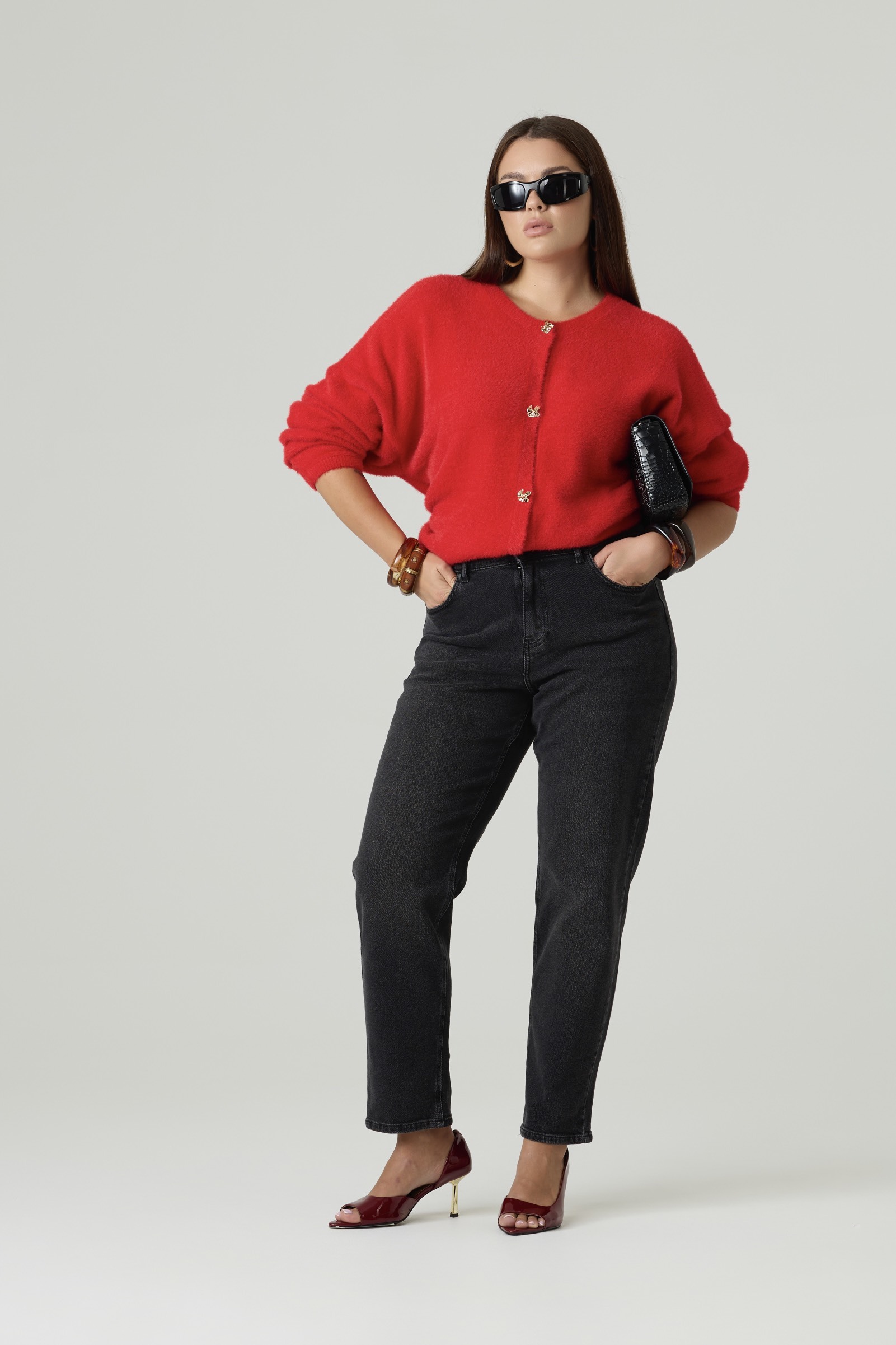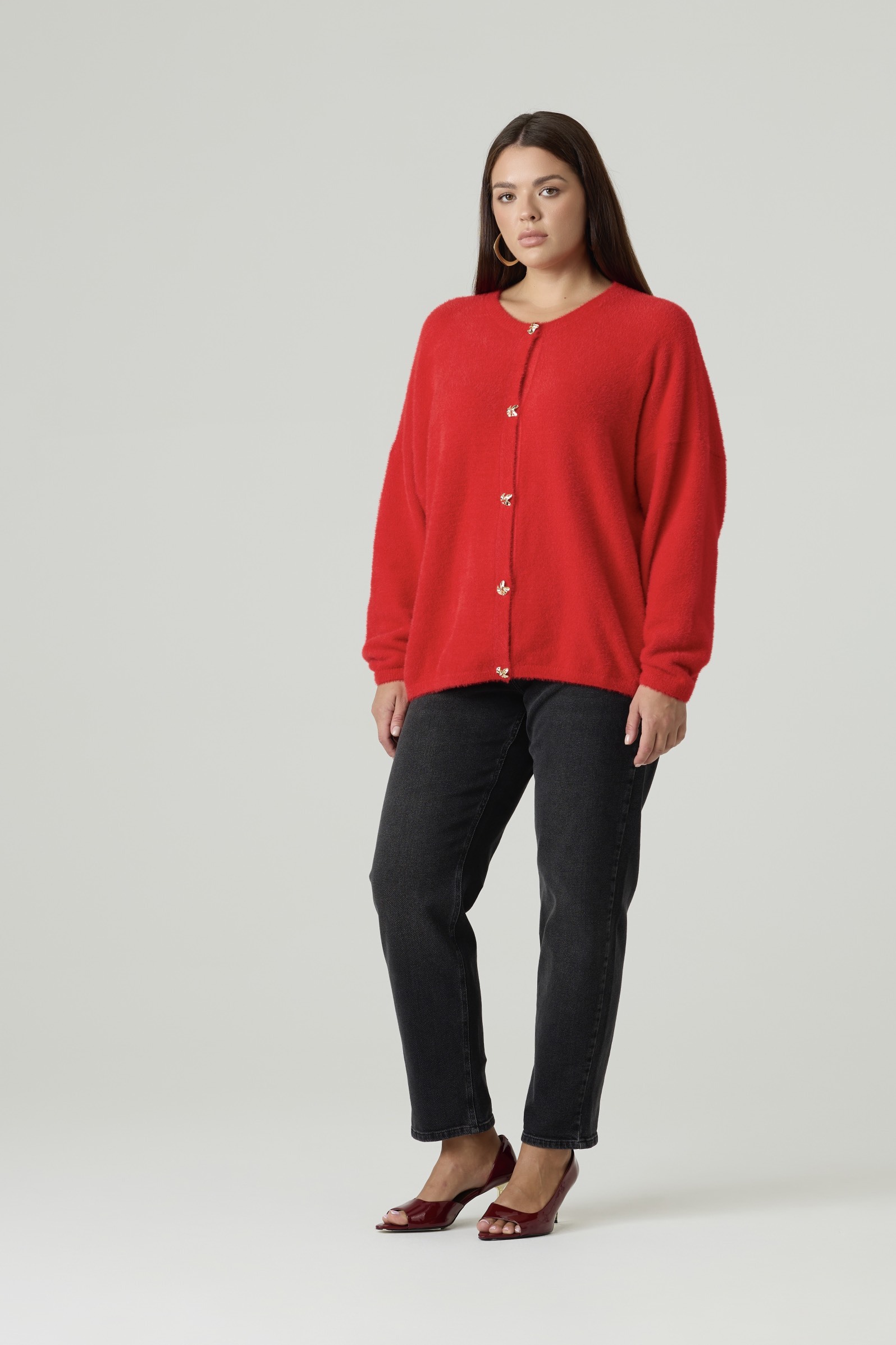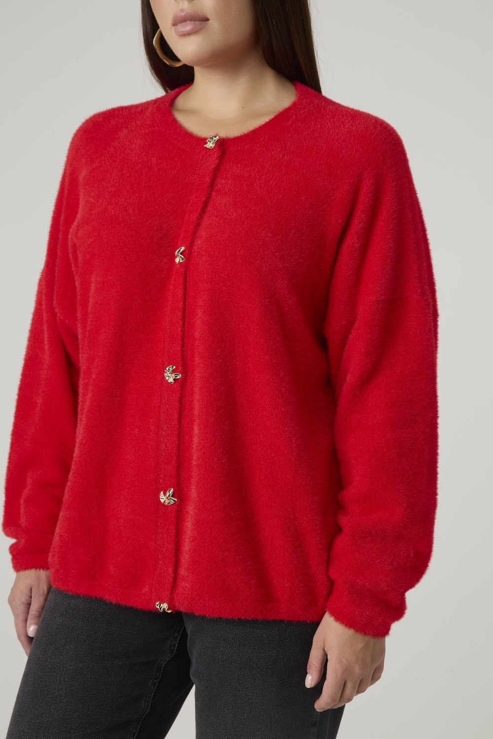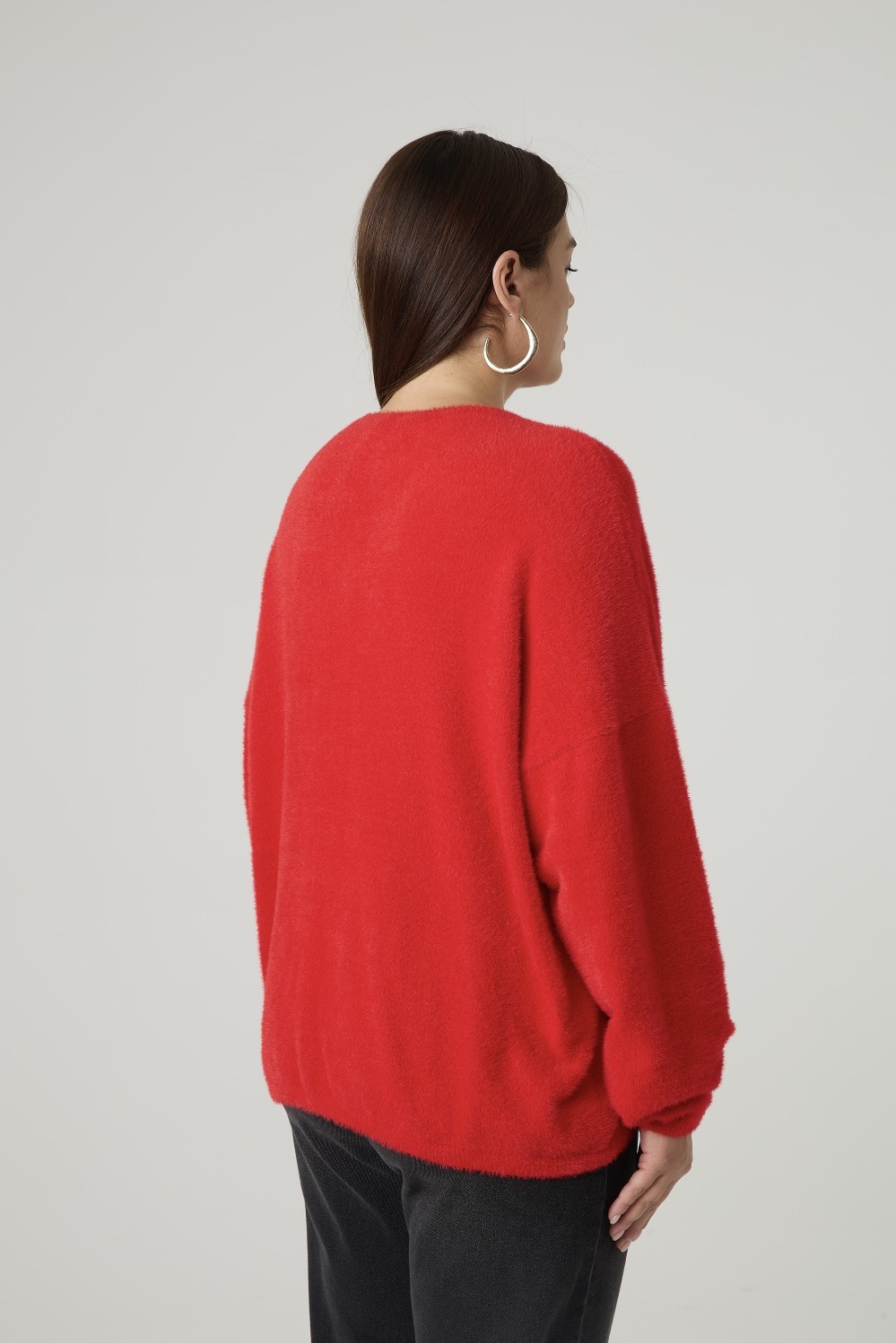 Женский кардиган ярко-красного цвета, выполнен из мягкой пушистой пряжи с
