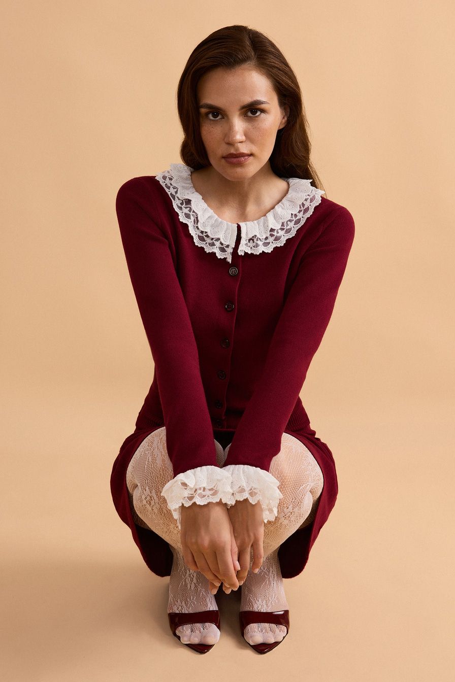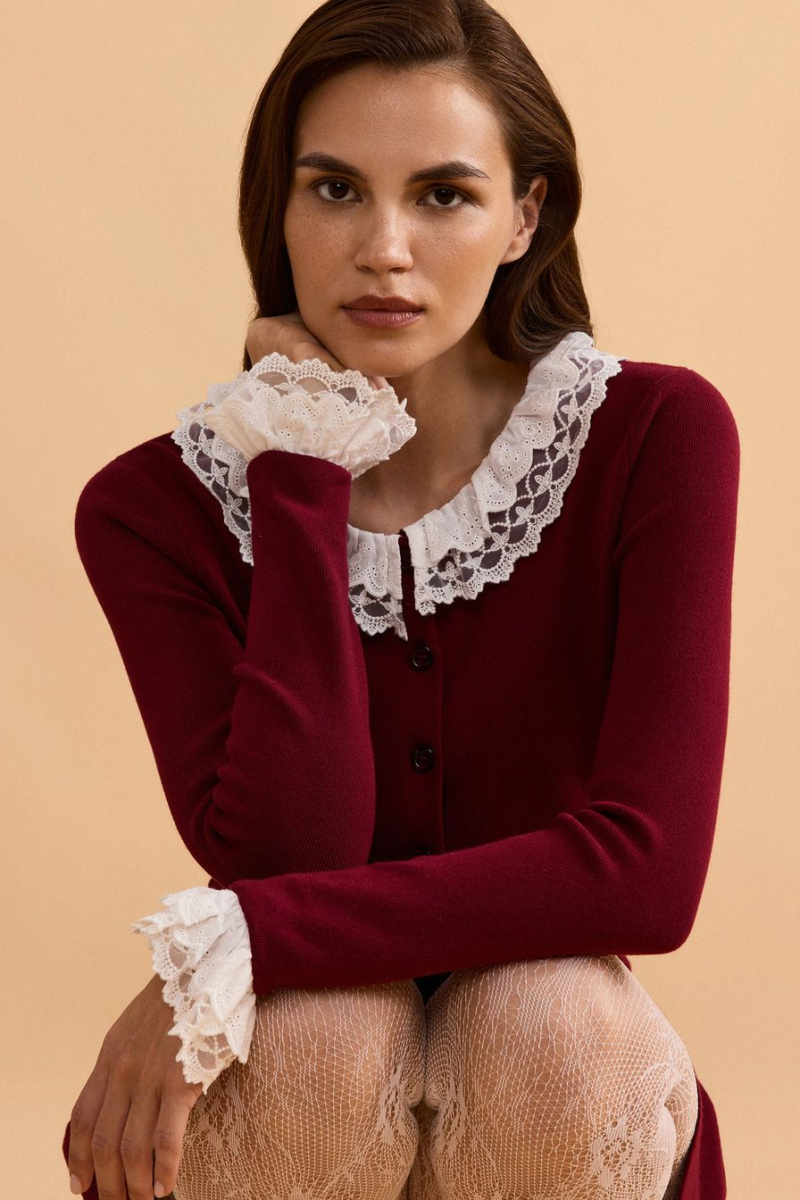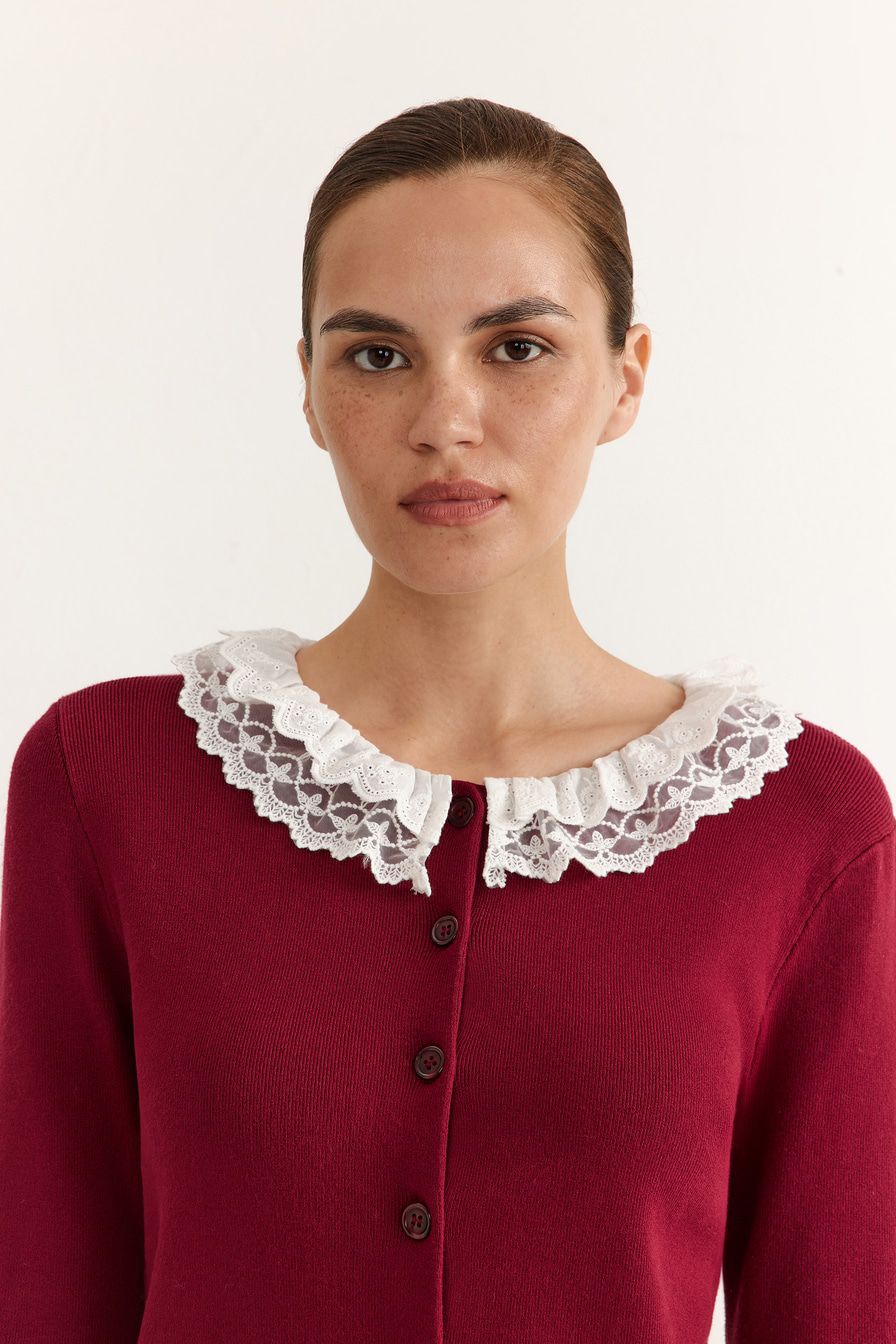 Кардиган из смесовой вискозы – модель бордового цвета. Кардиган декорирован кружевными манжетами и воротником.