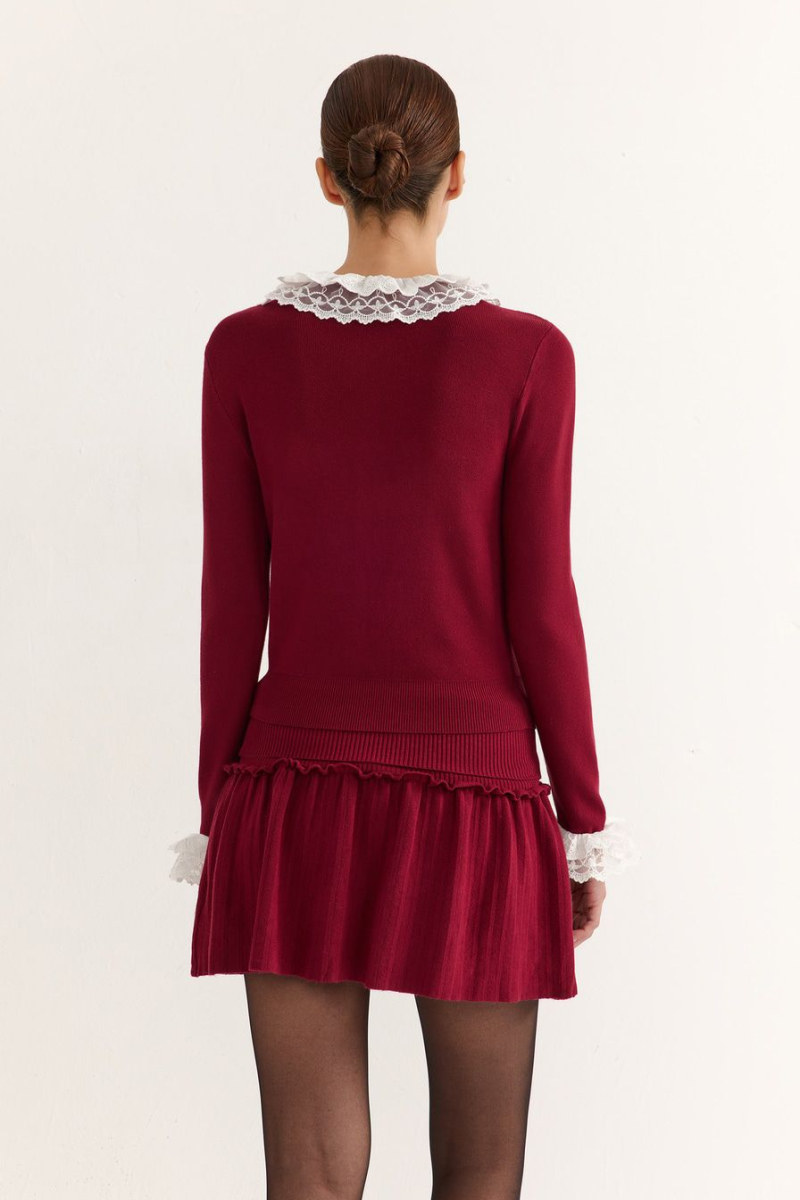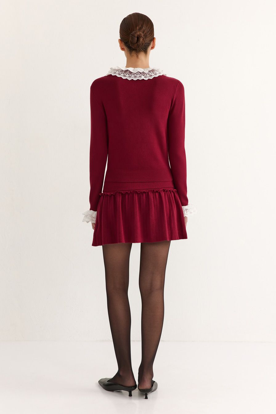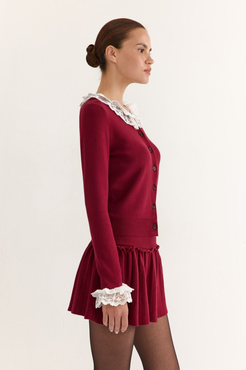 Кардиган из смесовой вискозы – модель бордового цвета. Кардиган декорирован кружевными манжетами и воротником.