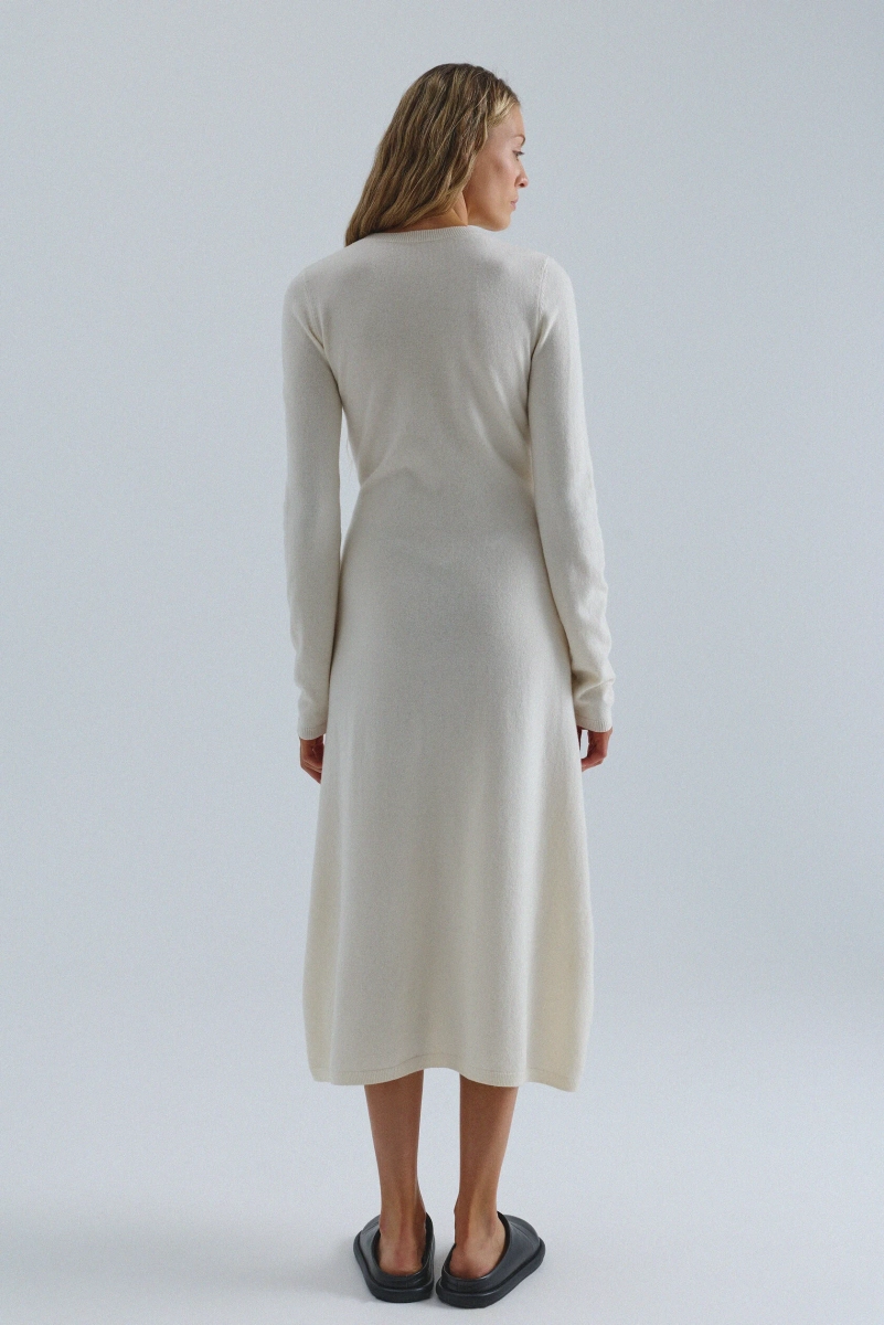 Платье A-силуэта из мягкой мериносовой шерсти длины миди. Тактильно приятный трикотаж, удлинённые рукава и классический круглый вырез. Крой модели деликатно облегает фигуру.