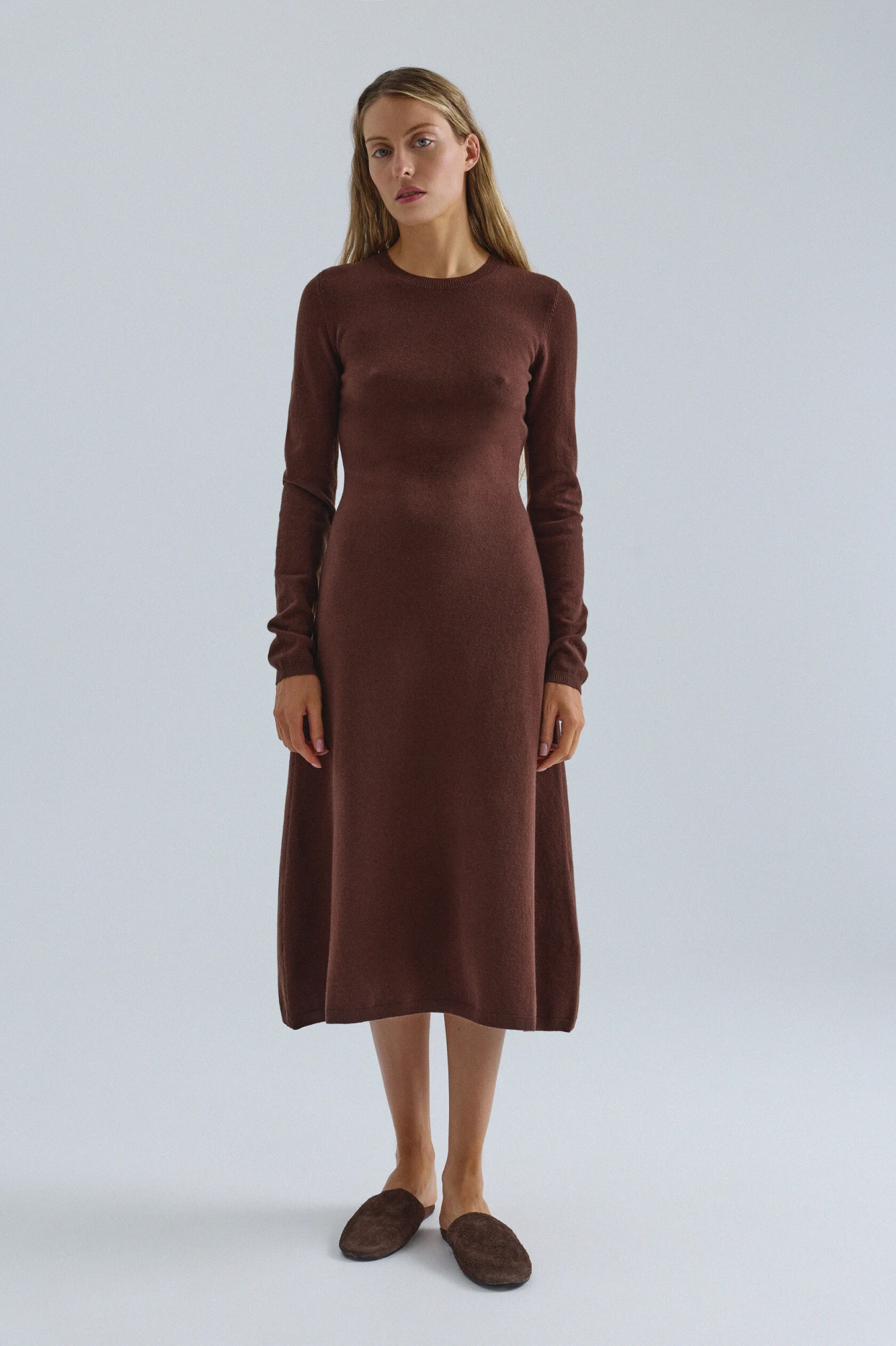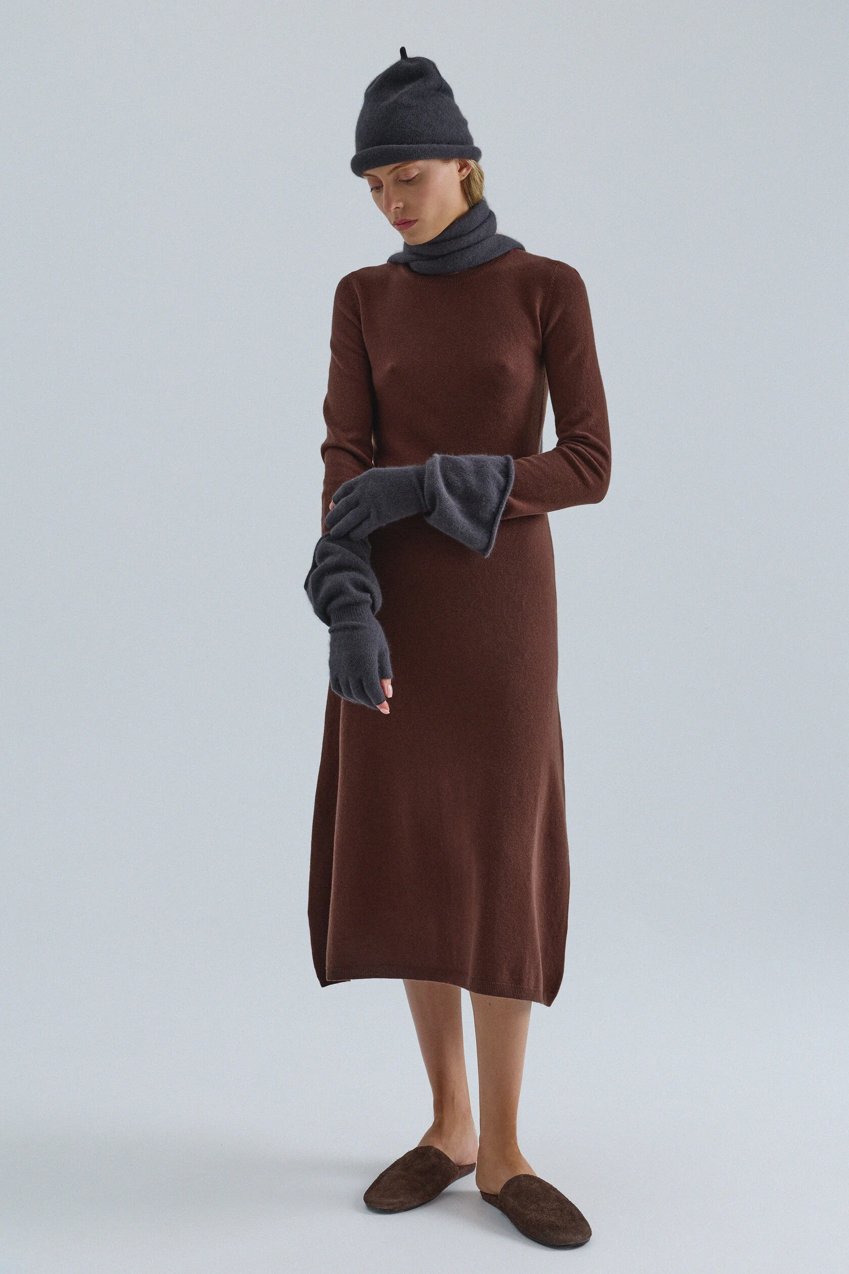 Платье A-силуэта из мягкой мериносовой шерсти длины миди. Тактильно приятный трикотаж, удлинённые рукава и классический круглый вырез. Крой модели деликатно облегает фигуру.