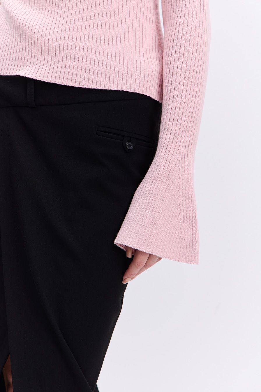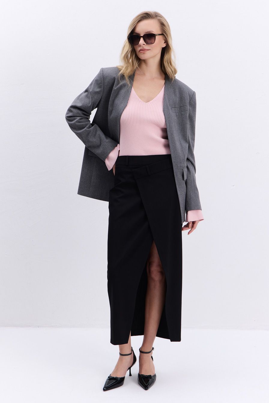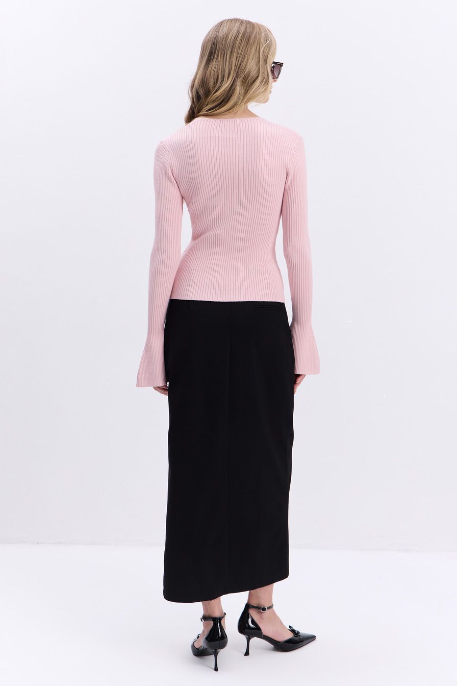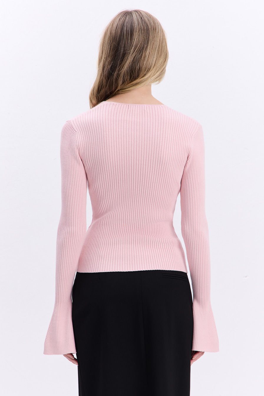 Светло-розовый облегающий джемпер из смесовой вискозы в крупный рубчик – модель с глубоким V-образным вырезом и длинными, расклешенными книзу рукавами.