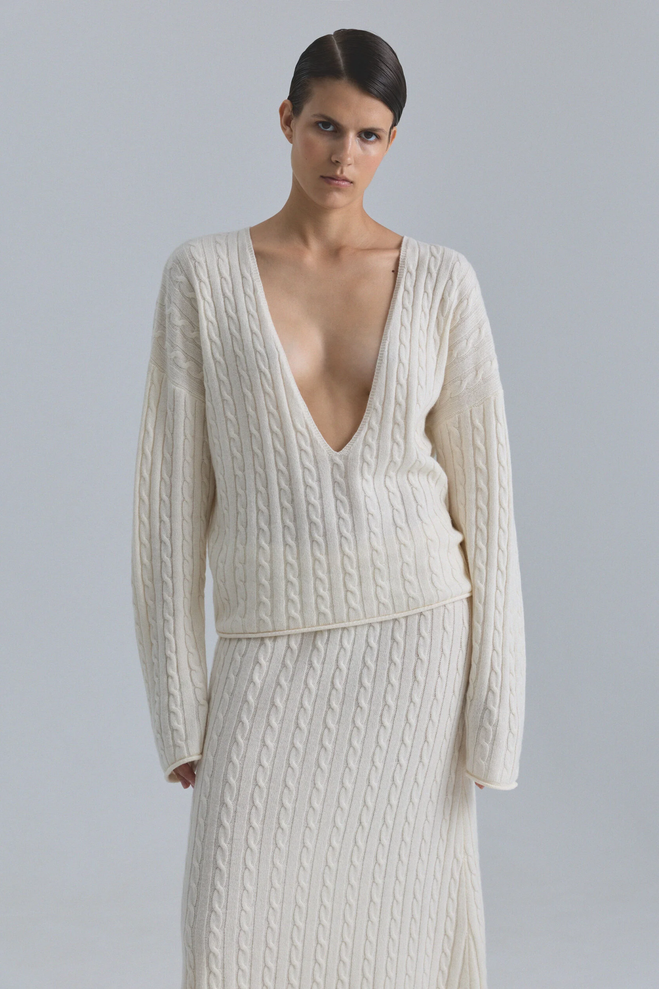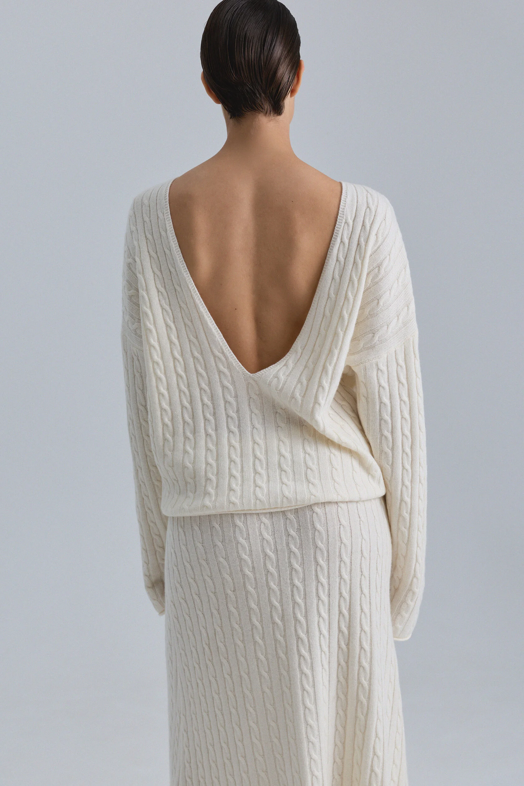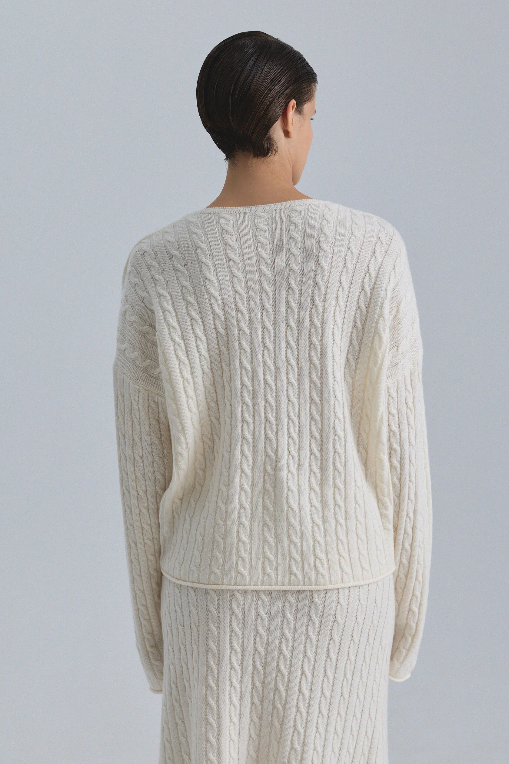 Джемпер из натуральной шерсти мериноса с фактурной вязкой косами и глубоким V-образным вырезом. Вырез можно располагать как на лицевой, так и тыльной стороне. Свободный крой позволяет носить джемпер как самостоятельную вещь или вторым слоем — поверх бадлона Opora.