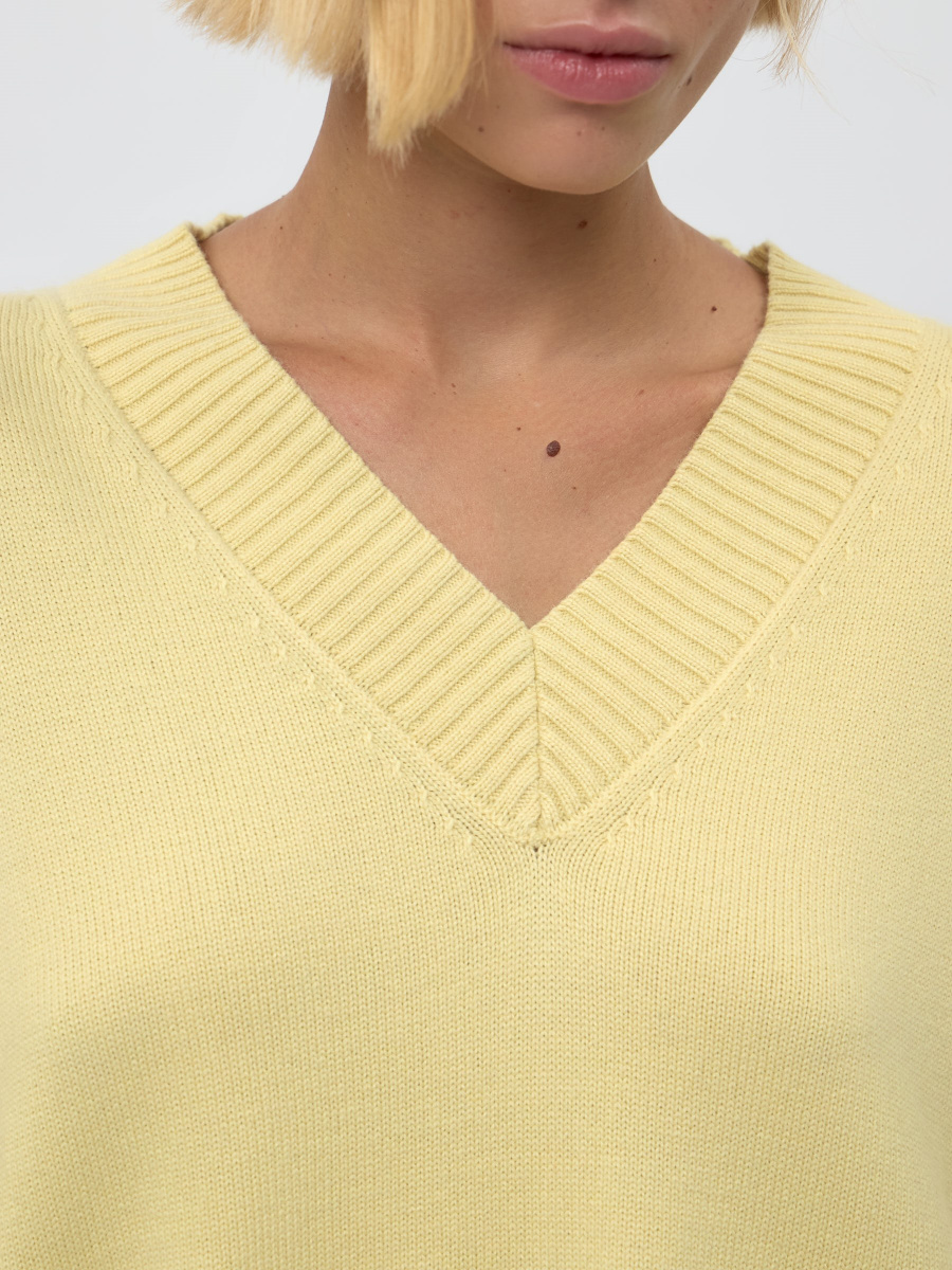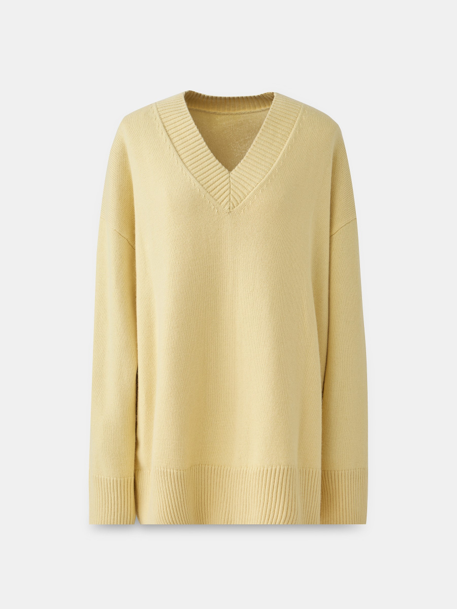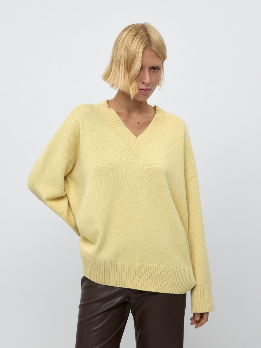 Акцентный джемпер с шерстью и кашемиром — комфортный и мягкий. Классические детали: гладкое плетение нитей, прямой крой, V-образный вырез, спущенная линия плеч. Горловина, манжеты и низ оформлены широкой фактурной резинкой. Среднее облегание дает возможность стилизовать изделие навыпуск и под заправку.