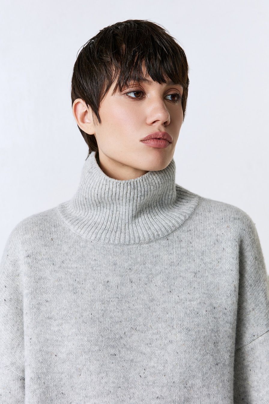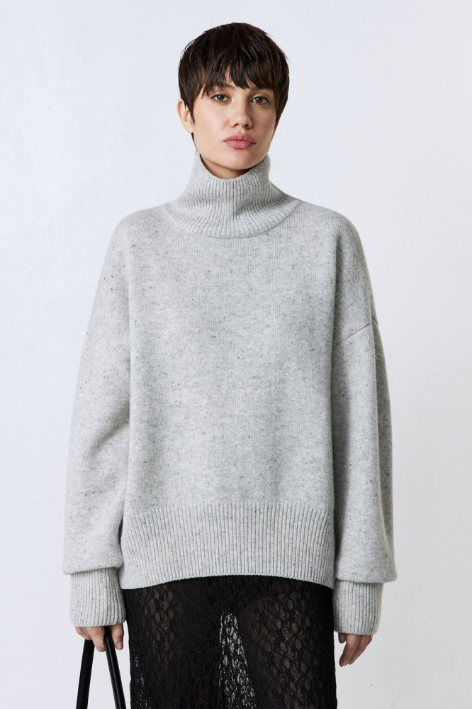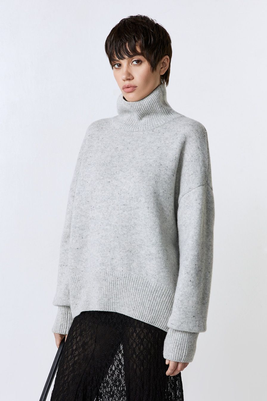 Свитер из смесовой шерсти – модель свободного кроя со спущенной линией плеч. Свитер выполнен в светло-сером оттенке с цветными вкраплениями.