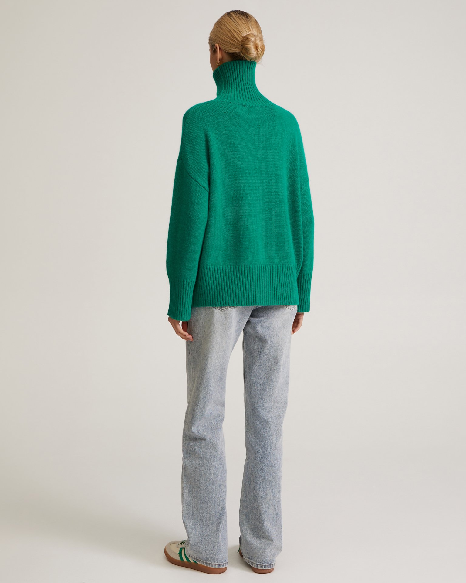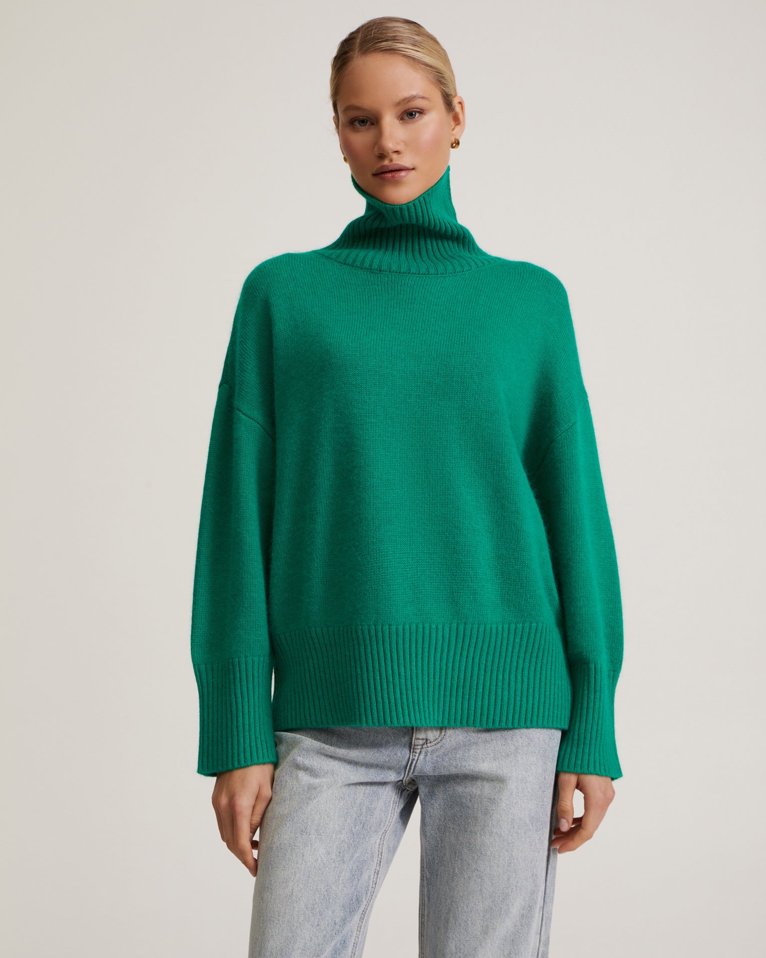 Мягкий свободный oversize джемпер из комфортного и теплого материала с шерстью и кашемиром в составе. Модель со спущенной линией плеча, удлиненными рукавами и высоким воротом. Идеальный уютный джемпер сочетайте с удобными мягкими брюками и дутым жилетом или с платьем и казаками из нашей коллекции.