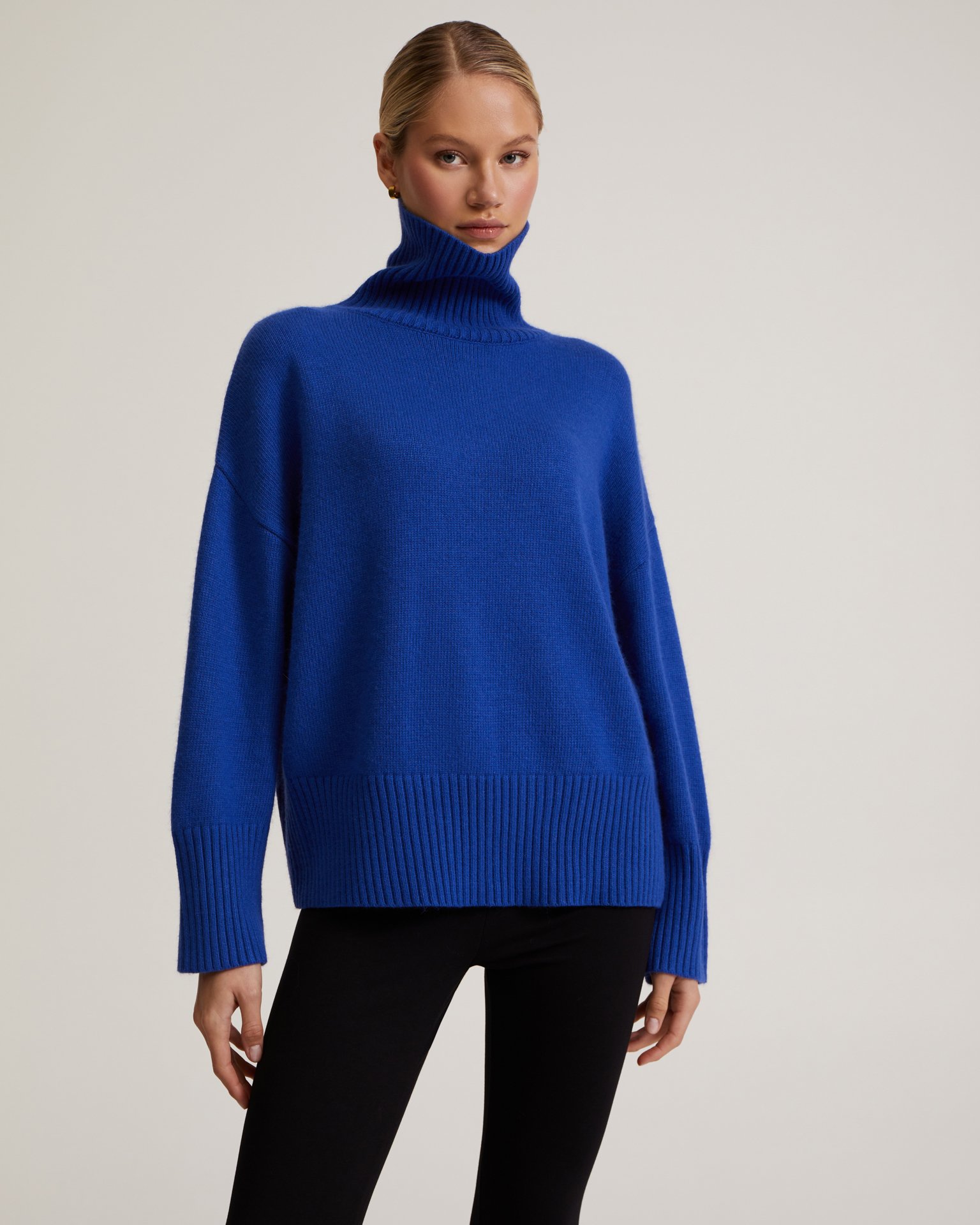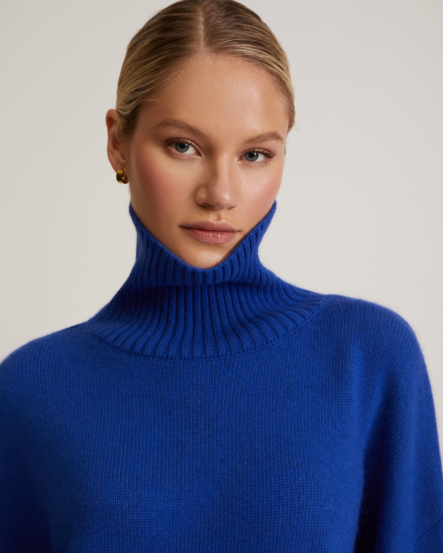 Мягкий свободный oversize джемпер из комфортного и теплого материала с шерстью и кашемиром в составе. Модель со спущенной линией плеча, удлиненными рукавами и высоким воротом. Идеальный уютный джемпер сочетайте с удобными мягкими брюками и дутым жилетом или с платьем и казаками из нашей коллекции.