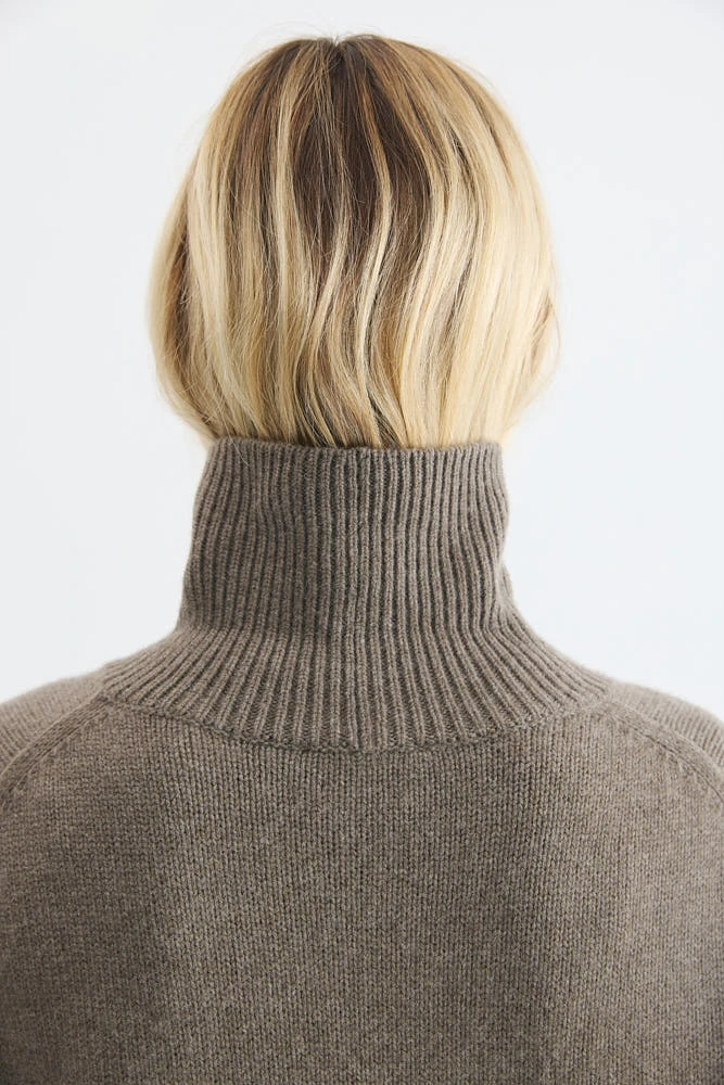 Свитер толстой вязки из 100% шерсти с высоким горлом. Обратите внимание на резинку внизу, он делает свитер не только теплым, но и оригинальным.
