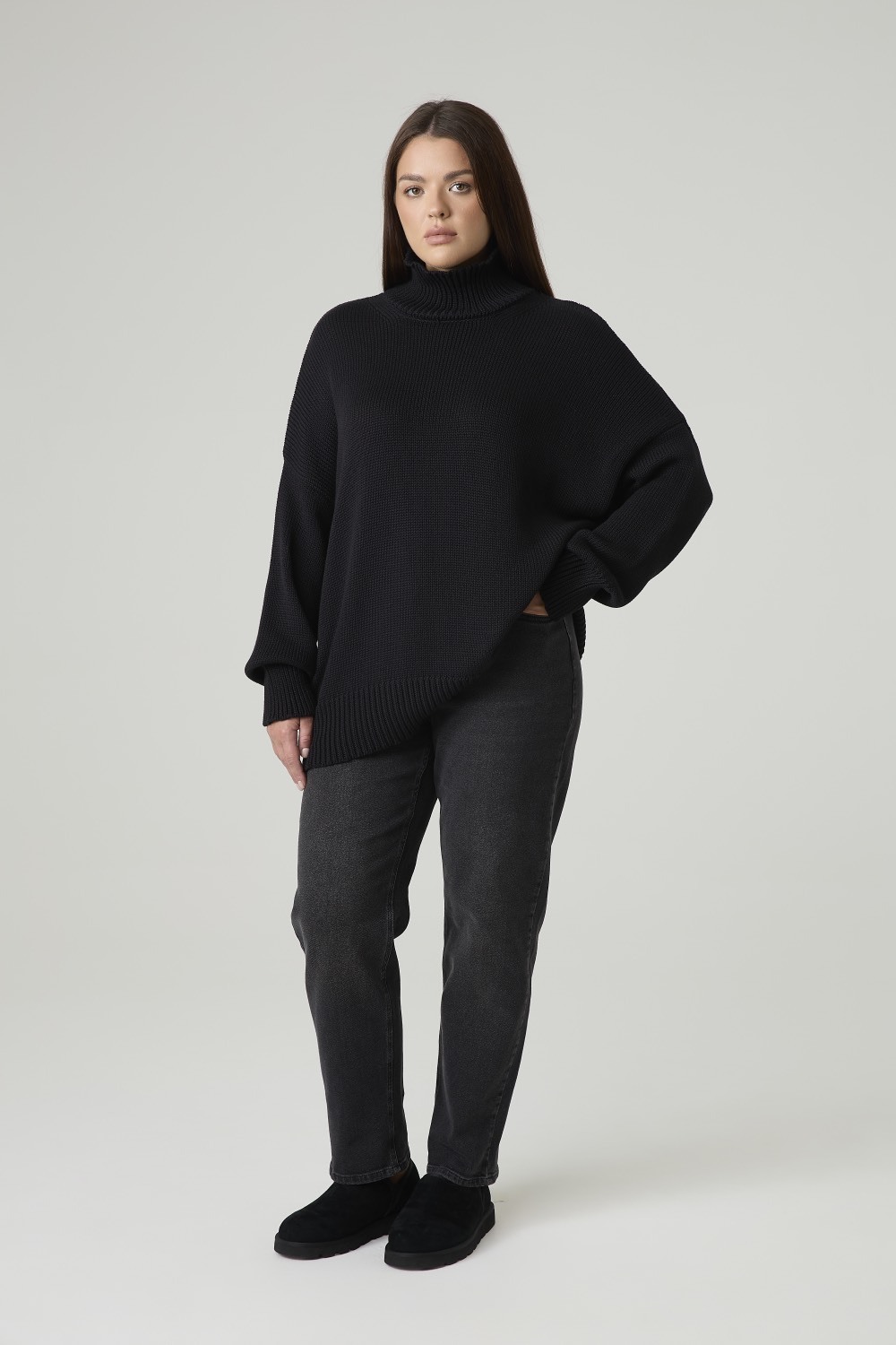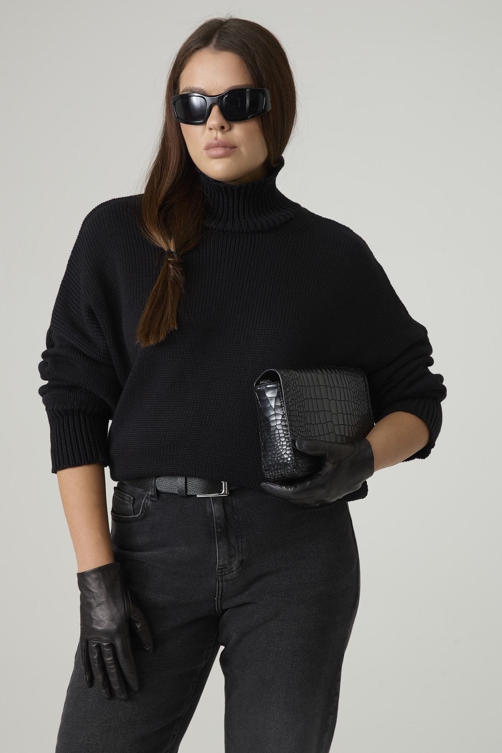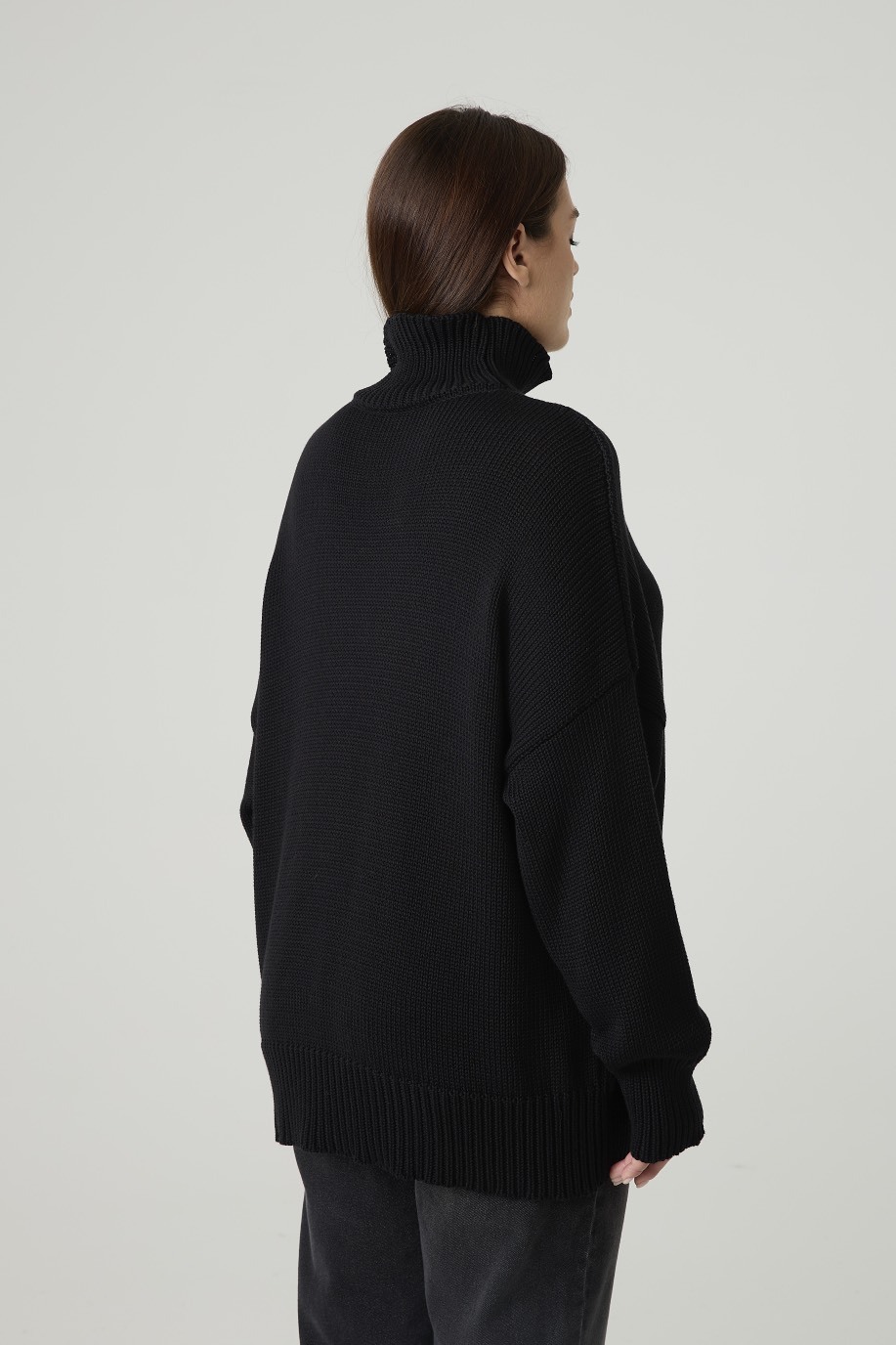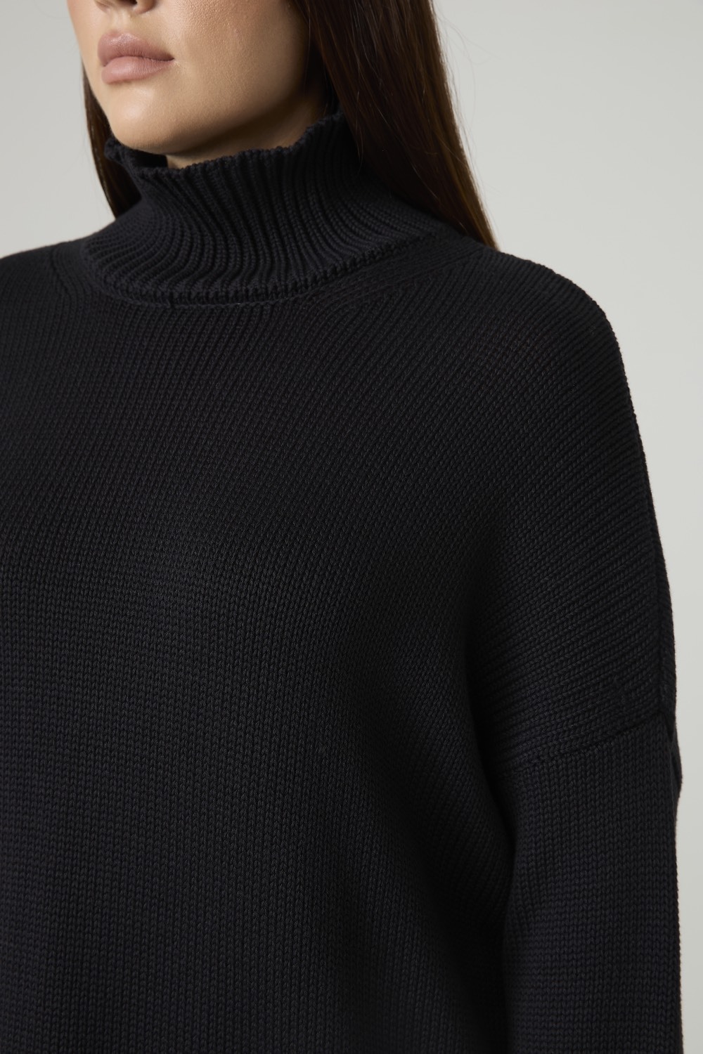 Базовый женский джемпер выполнен из плотной мягкой пряжи с гладкой вязкой. Модель свободного силуэта с длинными рукавами и высоким воротником-стойкой, защищающим от ветра и холода, добавляя стильный акцент. Плечевые швы спущены, создавая объемный и расслабленный силуэт. Манжеты, воротник и низ изделия связаны широкой резинкой, обеспечивающей комфортную посадку и сохранение формы. Модель джемпера удлиненная, закрывает линию бедер.