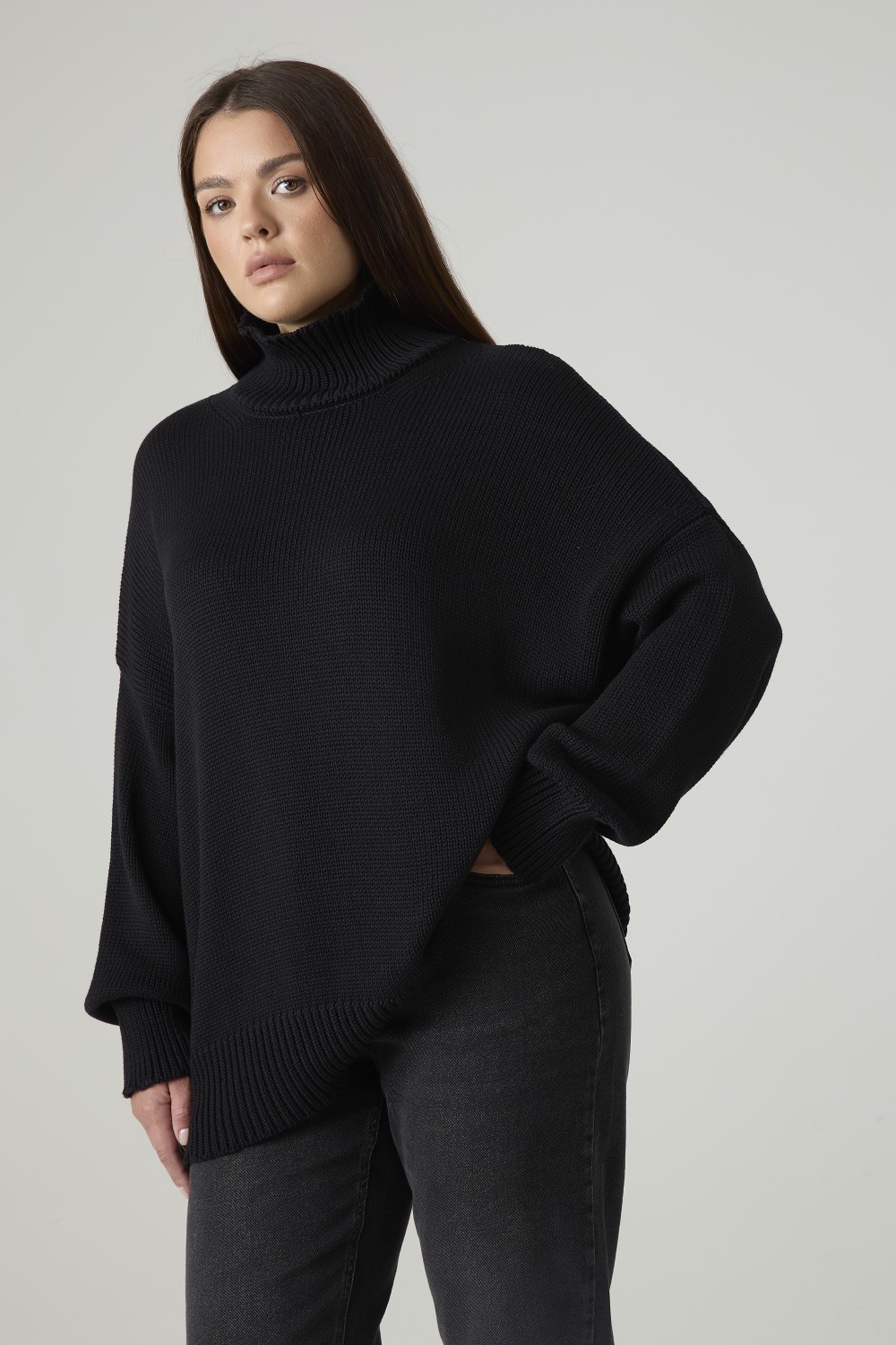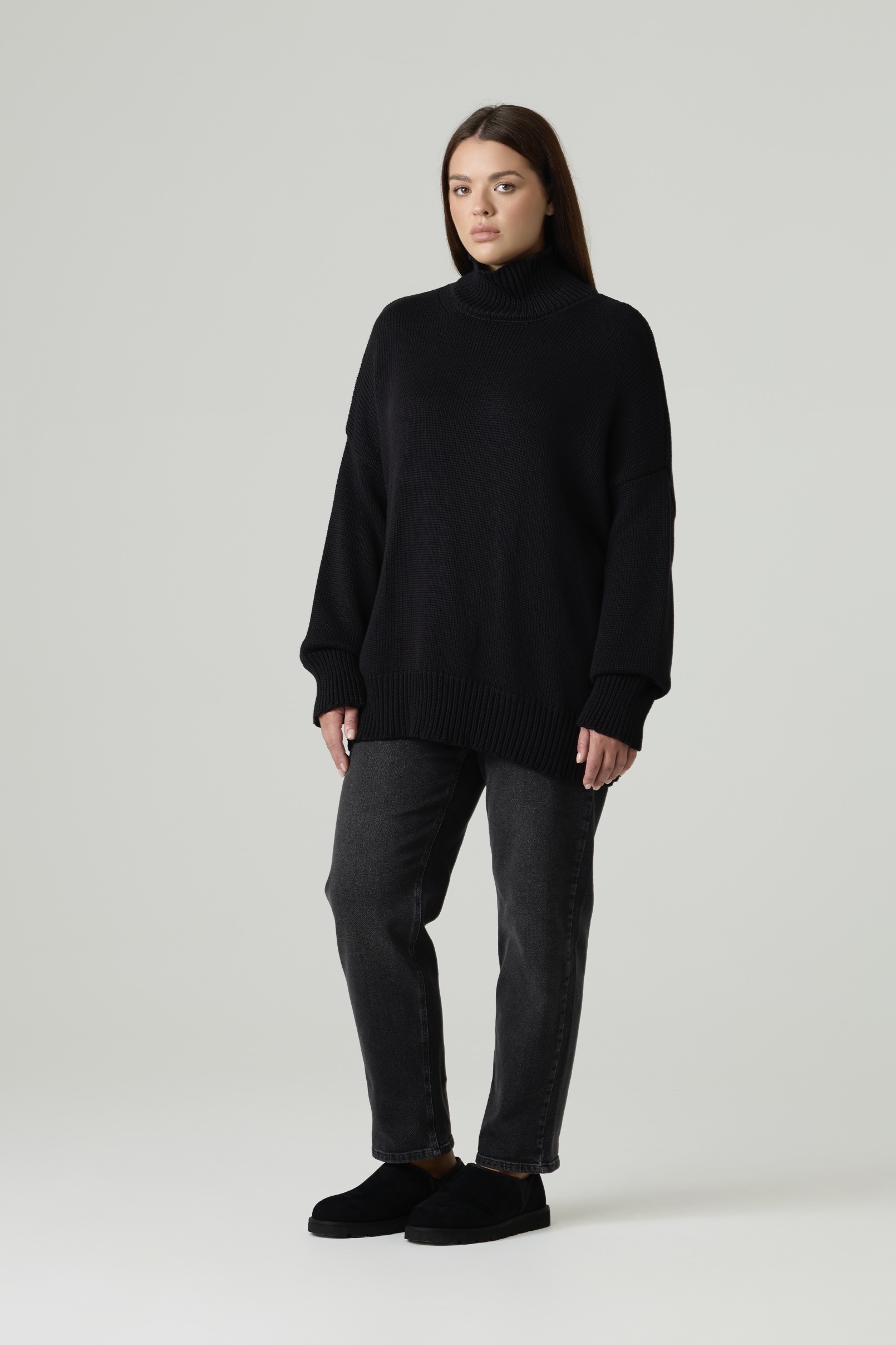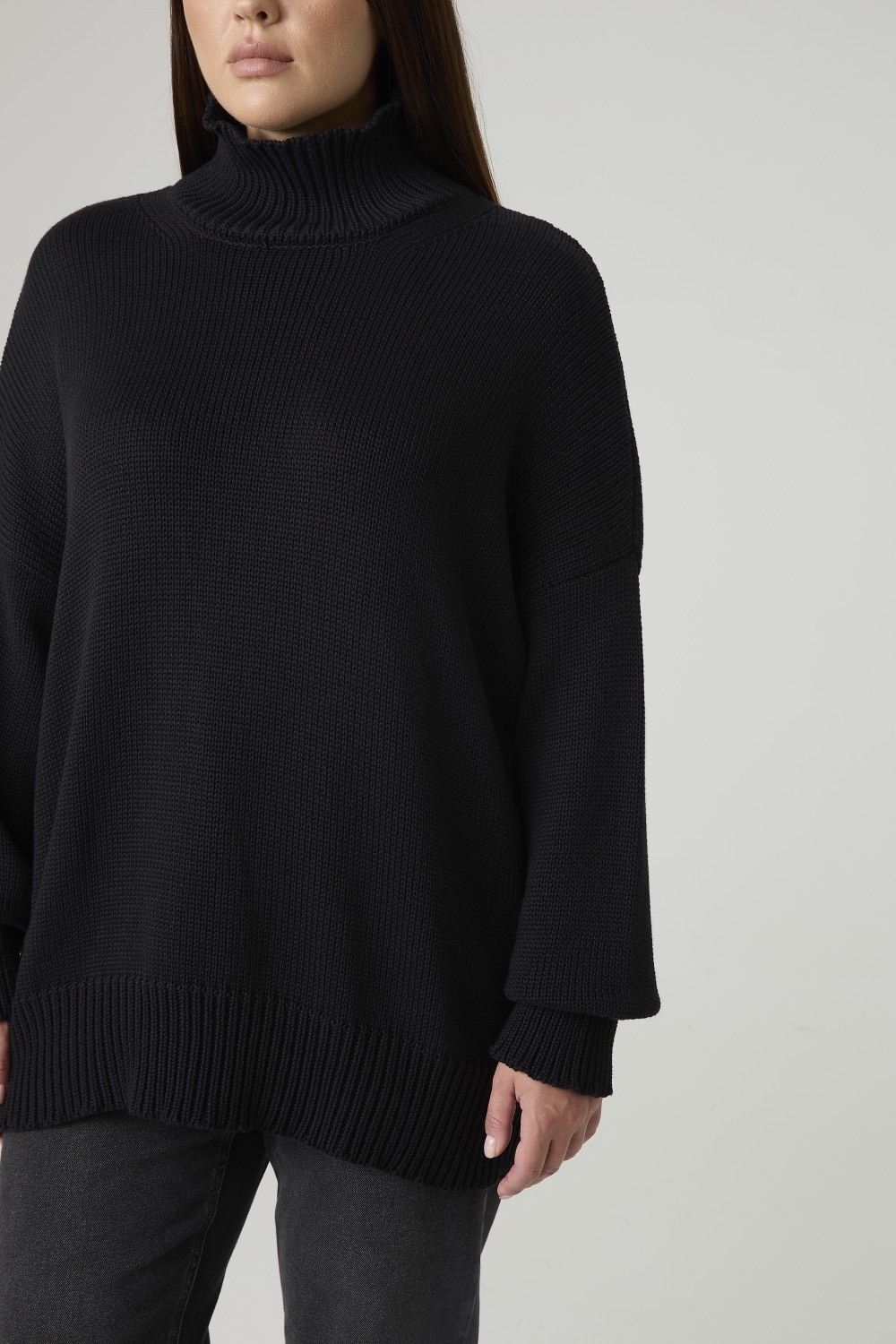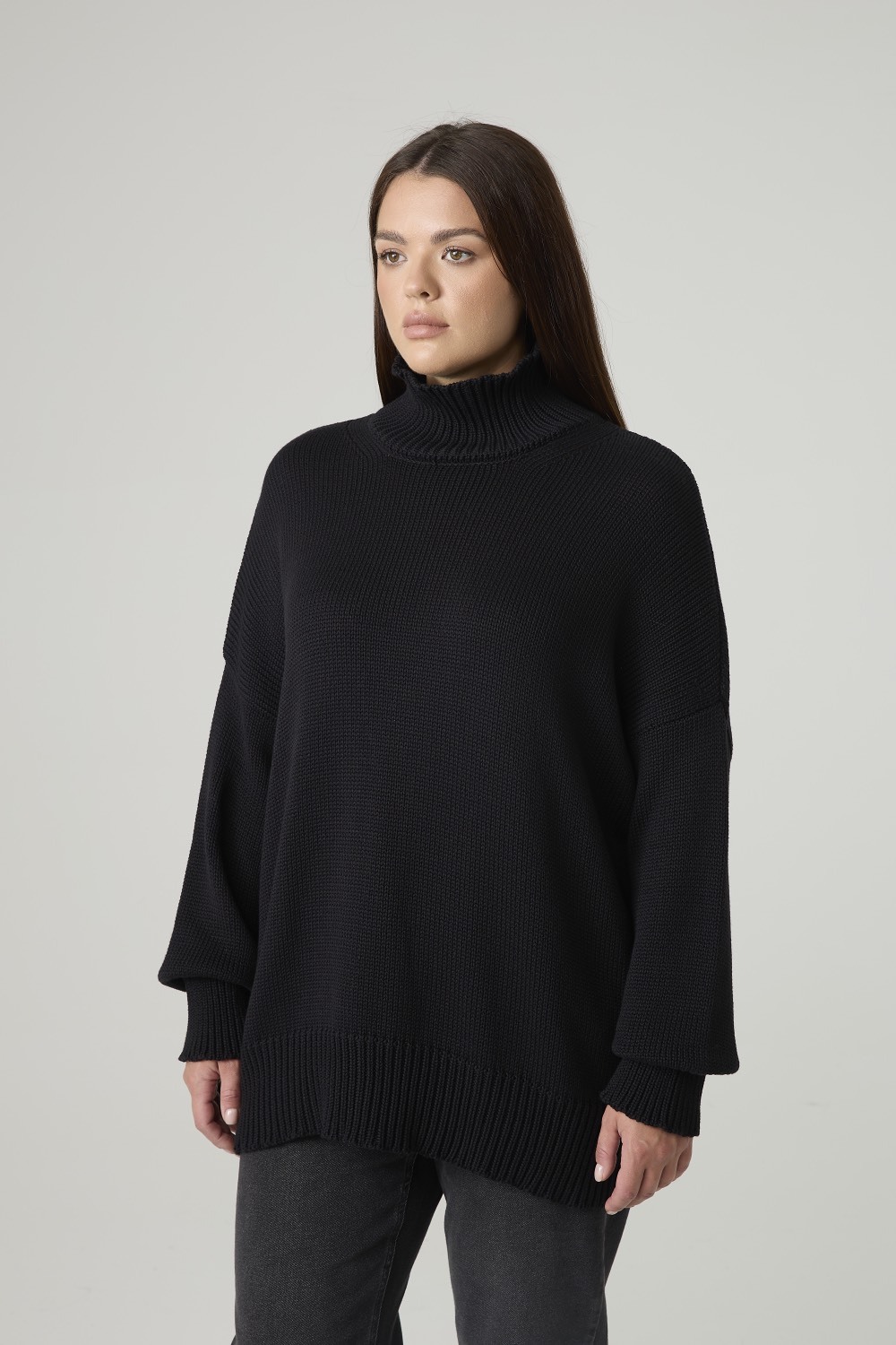 Базовый женский джемпер выполнен из плотной мягкой пряжи с гладкой вязкой. Модель свободного силуэта с длинными рукавами и высоким воротником-стойкой, защищающим от ветра и холода, добавляя стильный акцент. Плечевые швы спущены, создавая объемный и расслабленный силуэт. Манжеты, воротник и низ изделия связаны широкой резинкой, обеспечивающей комфортную посадку и сохранение формы. Модель джемпера удлиненная, закрывает линию бедер.