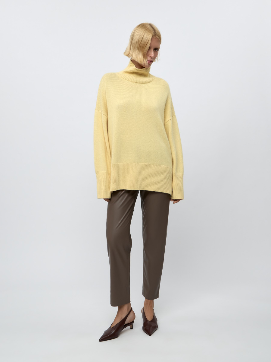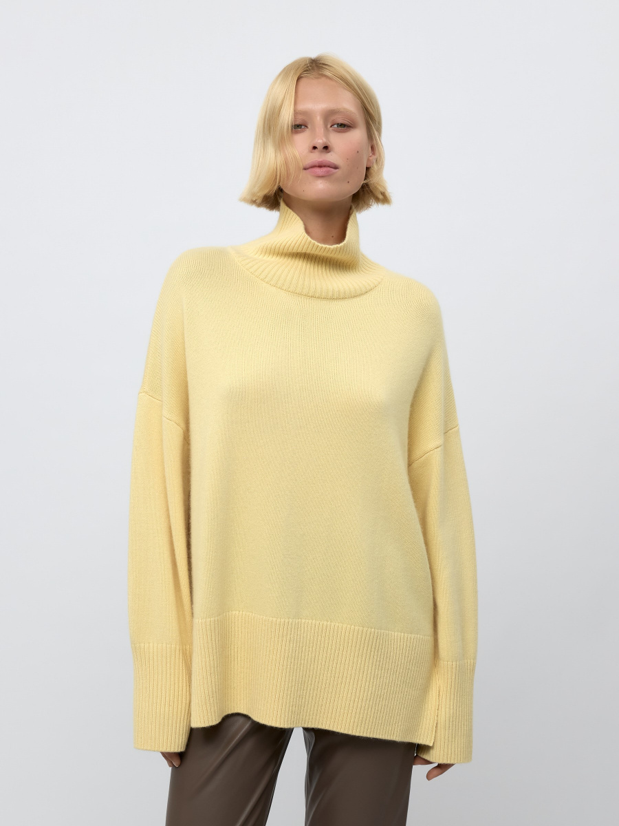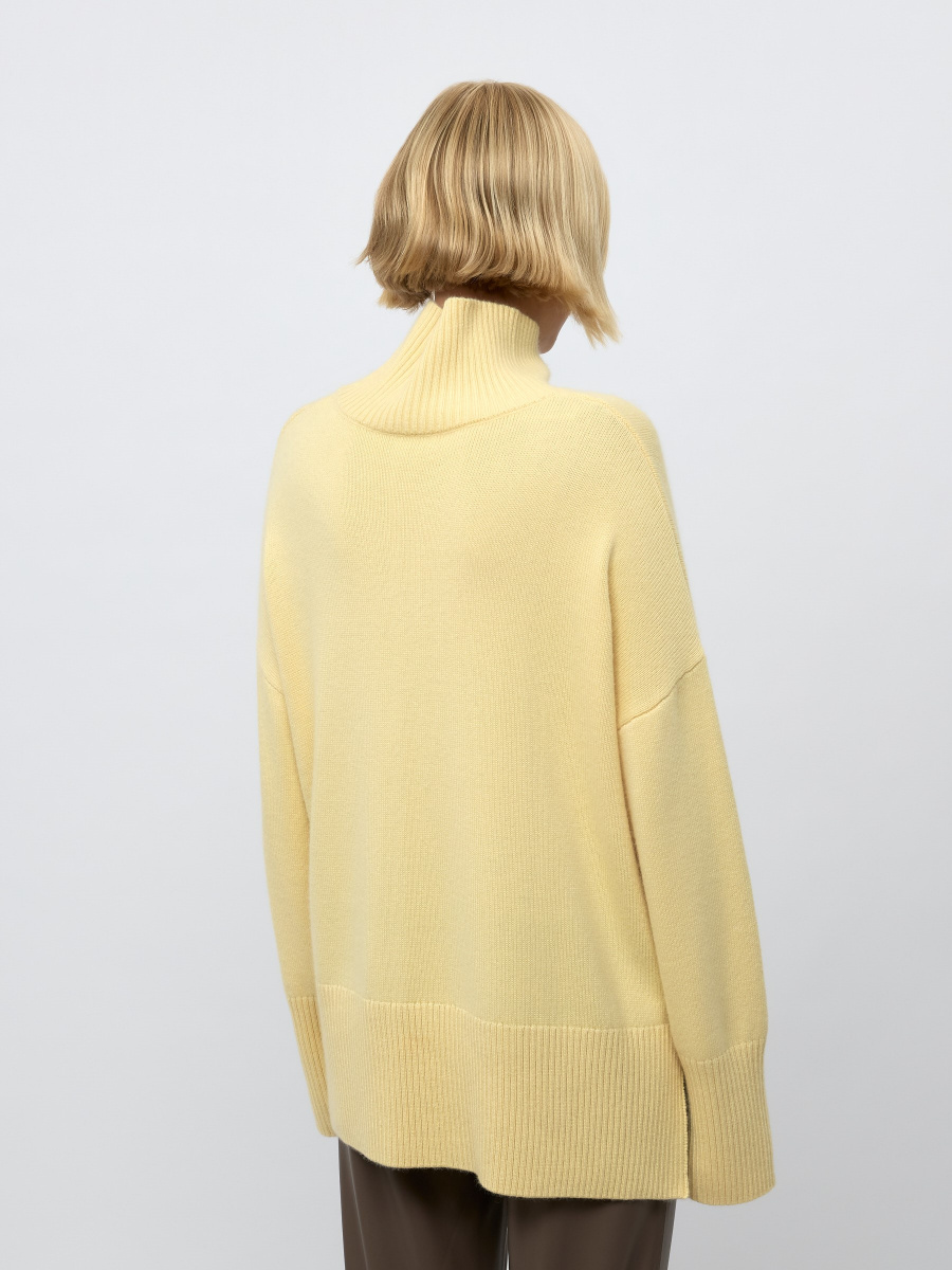 Уютный просторный джемпер из пряжи с шерстью и кашемиром — для самых холодных дней. Прямая свободная архитектура со спущенной линией плеча позволяет надеть вещь поверх футболки или лонгслива. Широкий фактурный воротник под горло ложится небрежными складками. Манжеты и низ обвязаны фактурной резинкой. Боковые разрезы — чтобы двигаться максимально свободно.