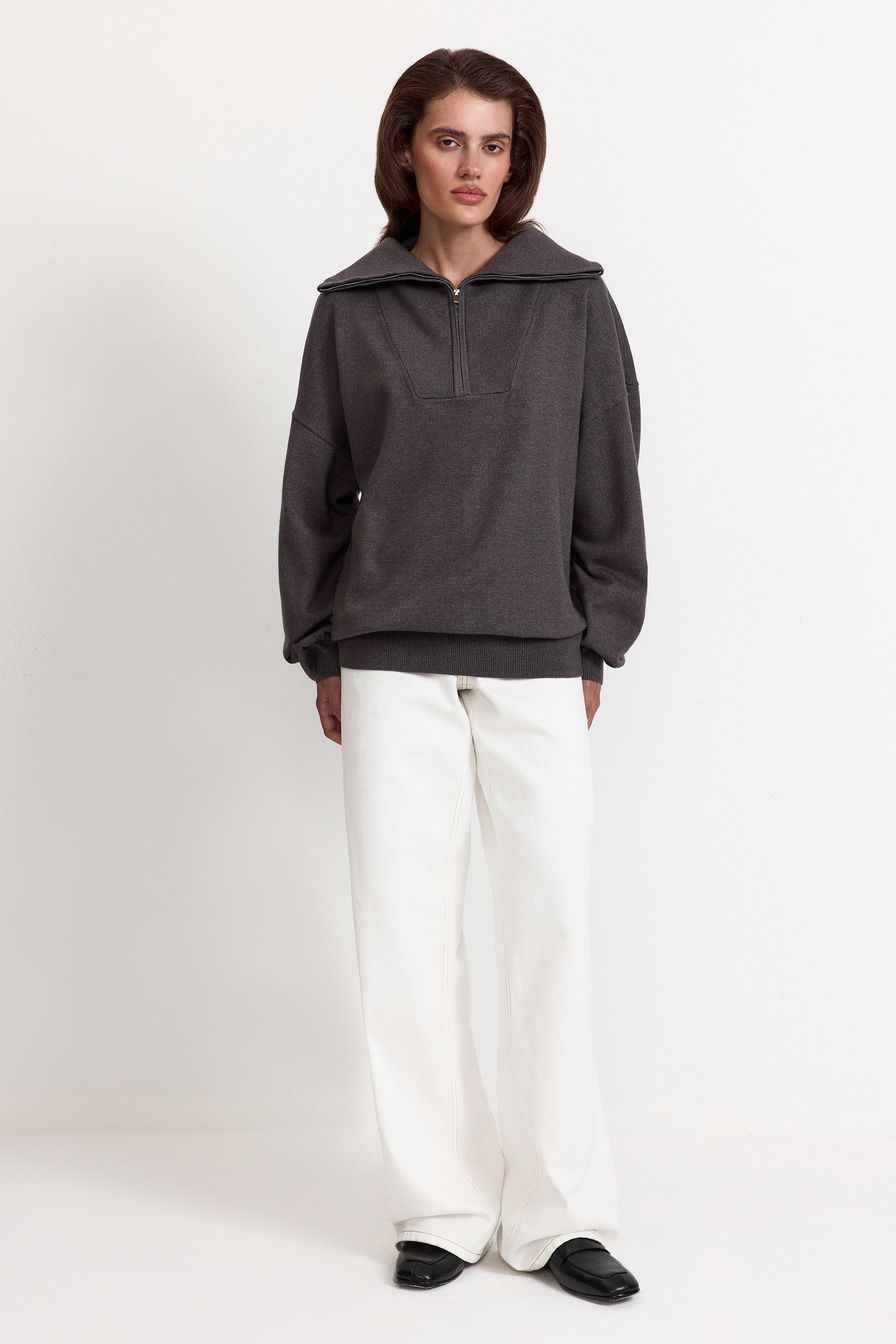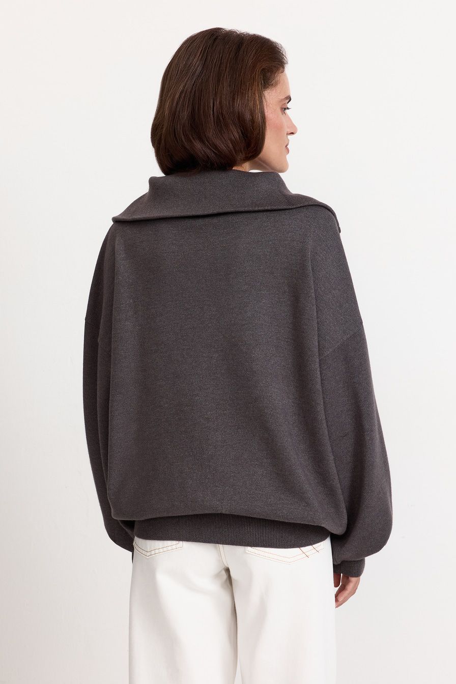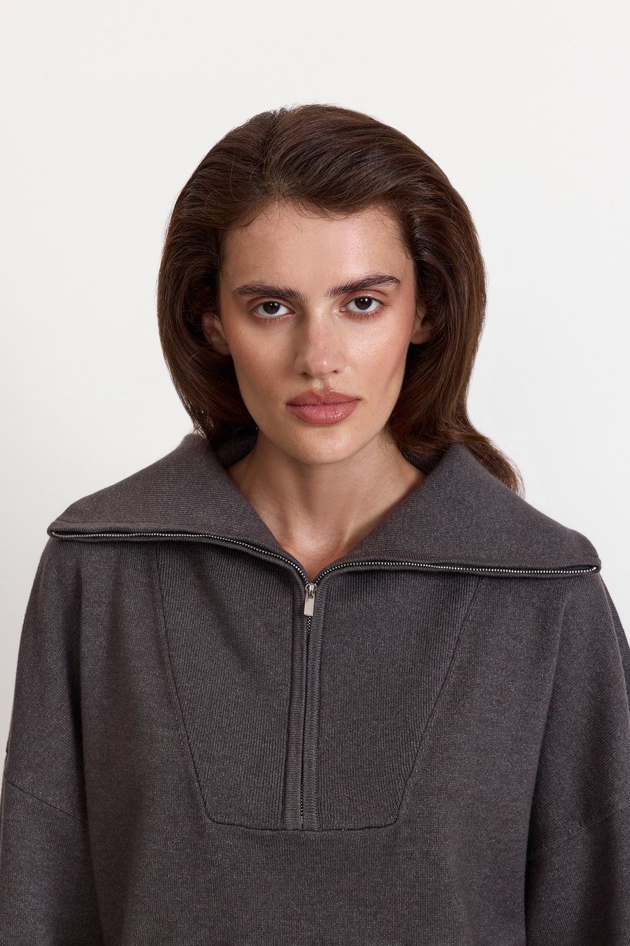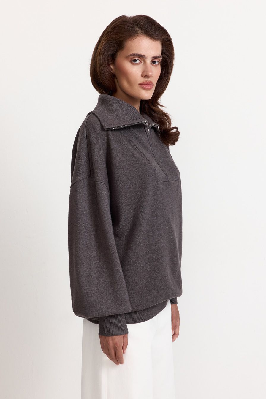 Объемный темно-серый джемпер из смесовой вискозы – модель свободного кроя со спущенной линией плеч. Широкий воротник на молнии трансформируется из отложного в стойку.