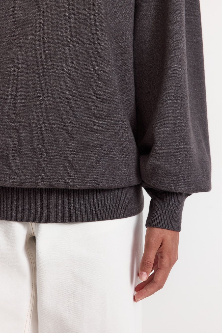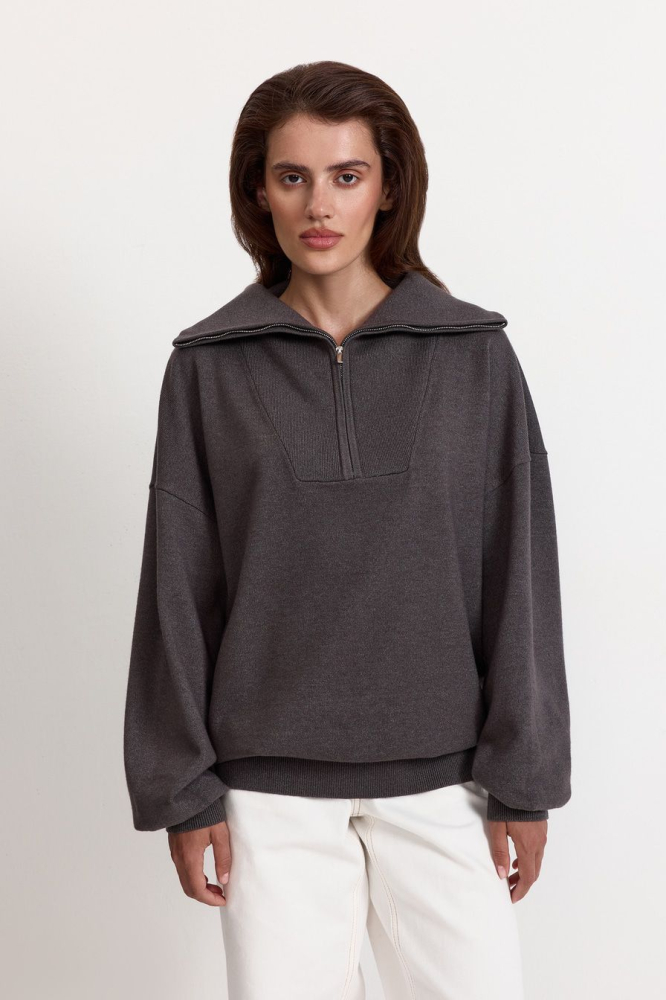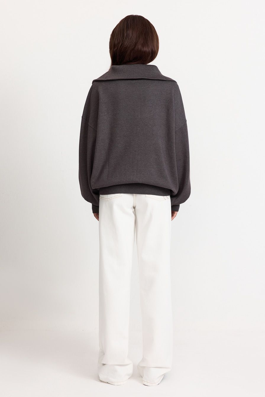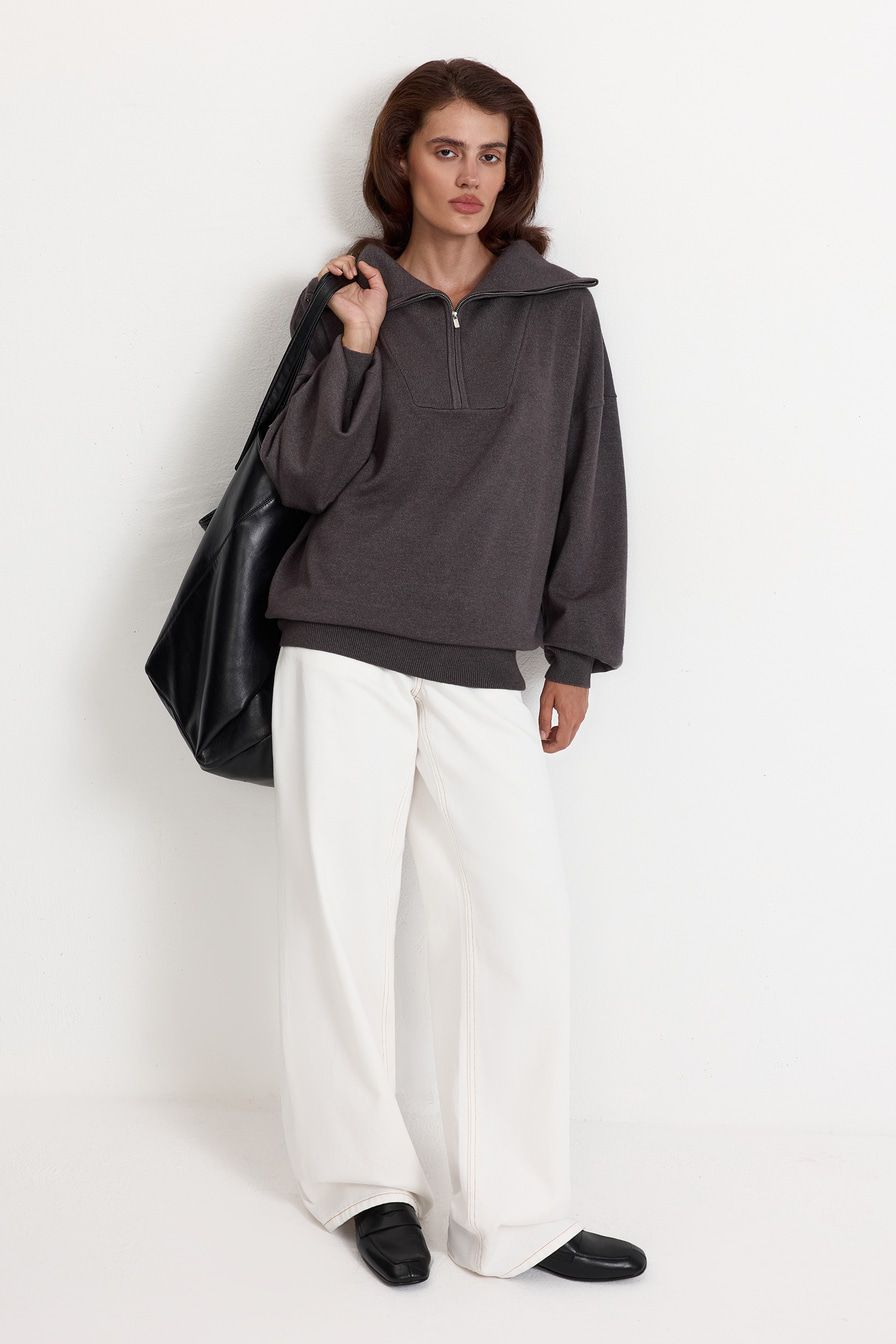 Объемный темно-серый джемпер из смесовой вискозы – модель свободного кроя со спущенной линией плеч. Широкий воротник на молнии трансформируется из отложного в стойку.