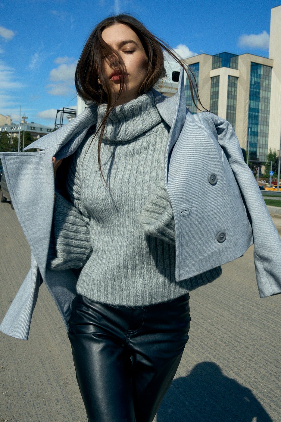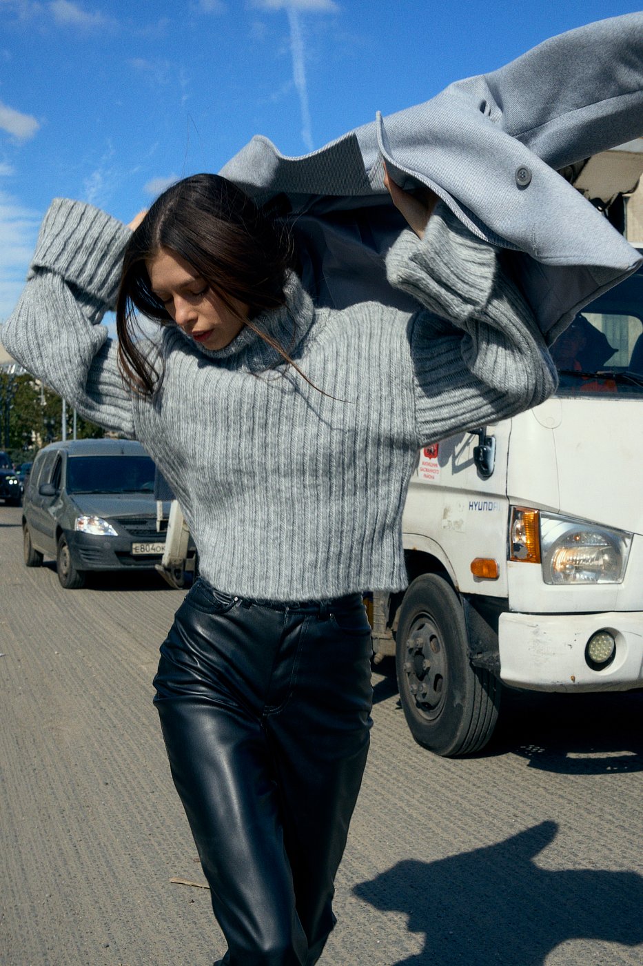 Укороченный свитер серого цвета — это стильная и комфортная вещь в вашем гардеробе. Отлично подойдёт для создания повседневных образов.