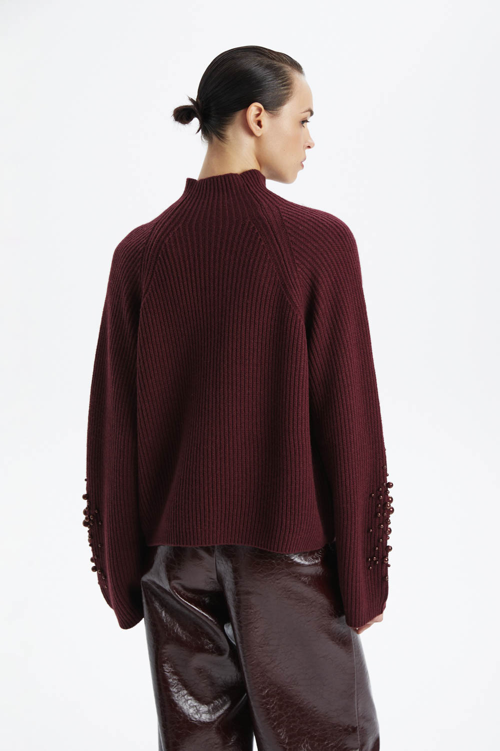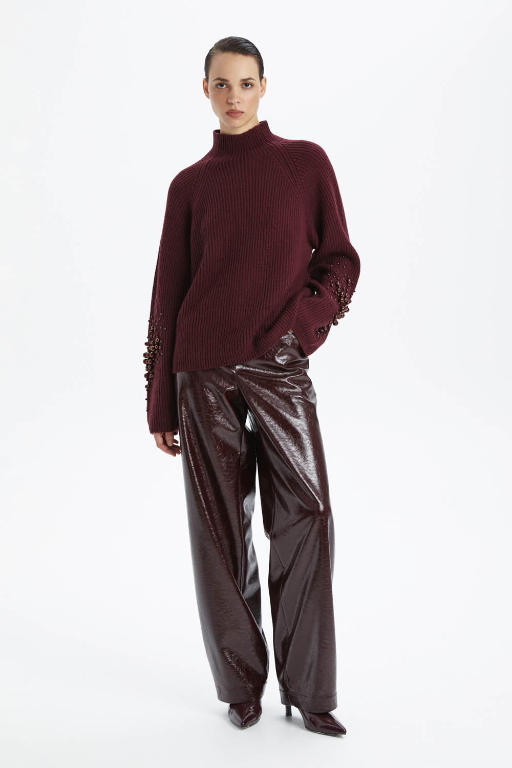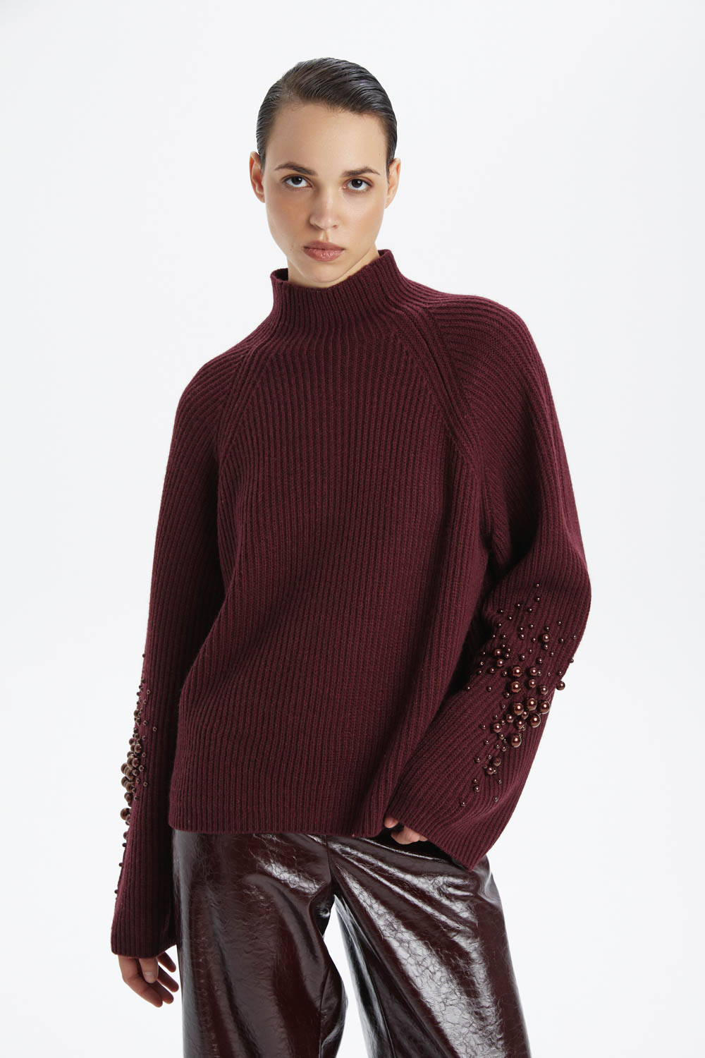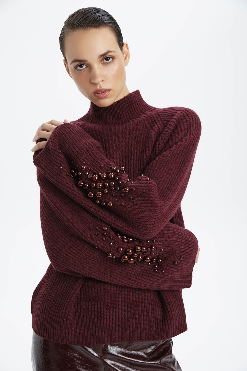 Объёмный свитер прямого силуэта выполнен из мягкой объёмной пряжи насыщенного вишнёво-бордового оттенка, который подчёркивает глубину цвета и создаёт современный акцент.