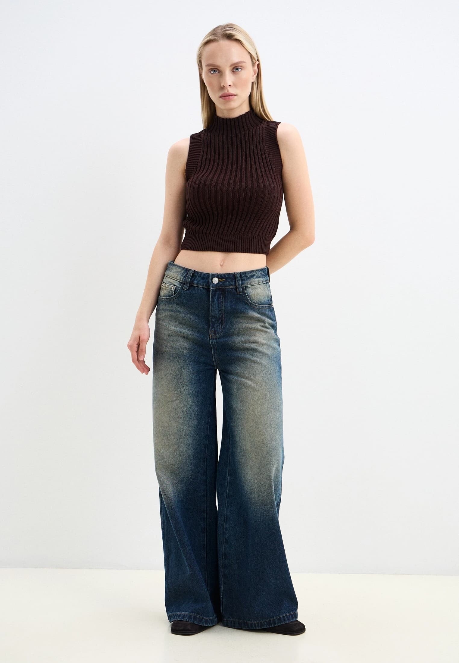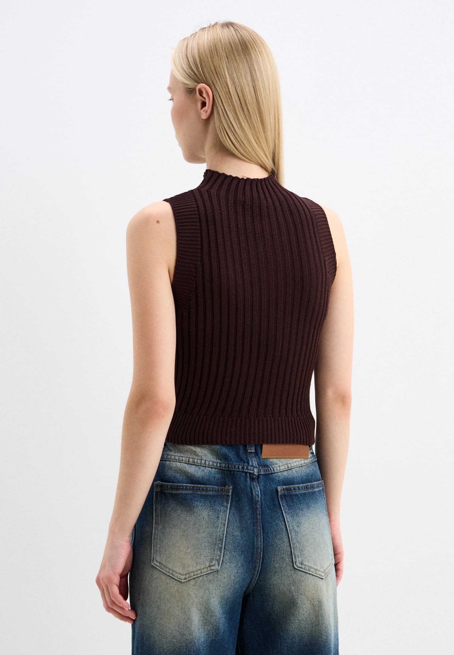 Коричневый укороченный джемпер без рукавов с фактурной вязкой. Высокий горловой вырез, мягкий трикотаж, свобода для экспериментов.