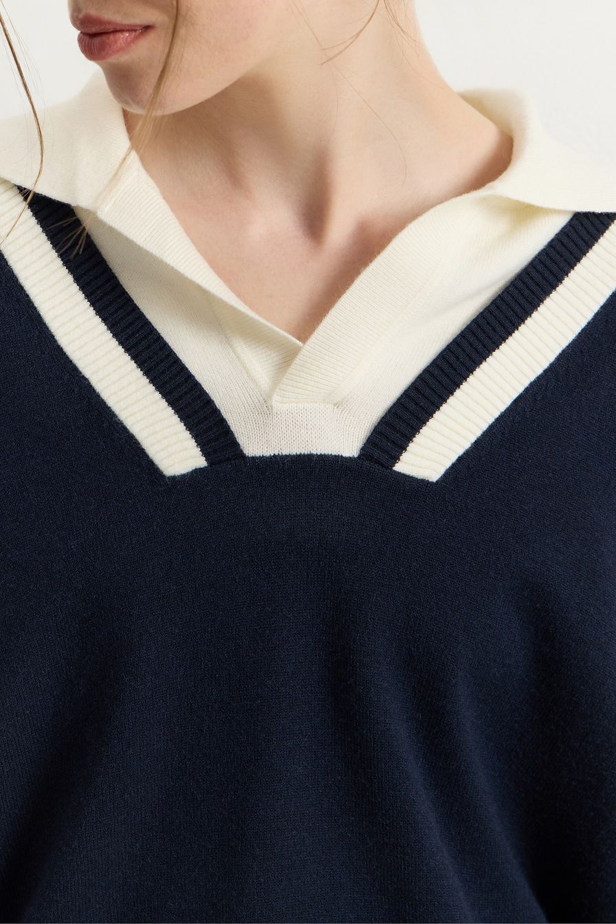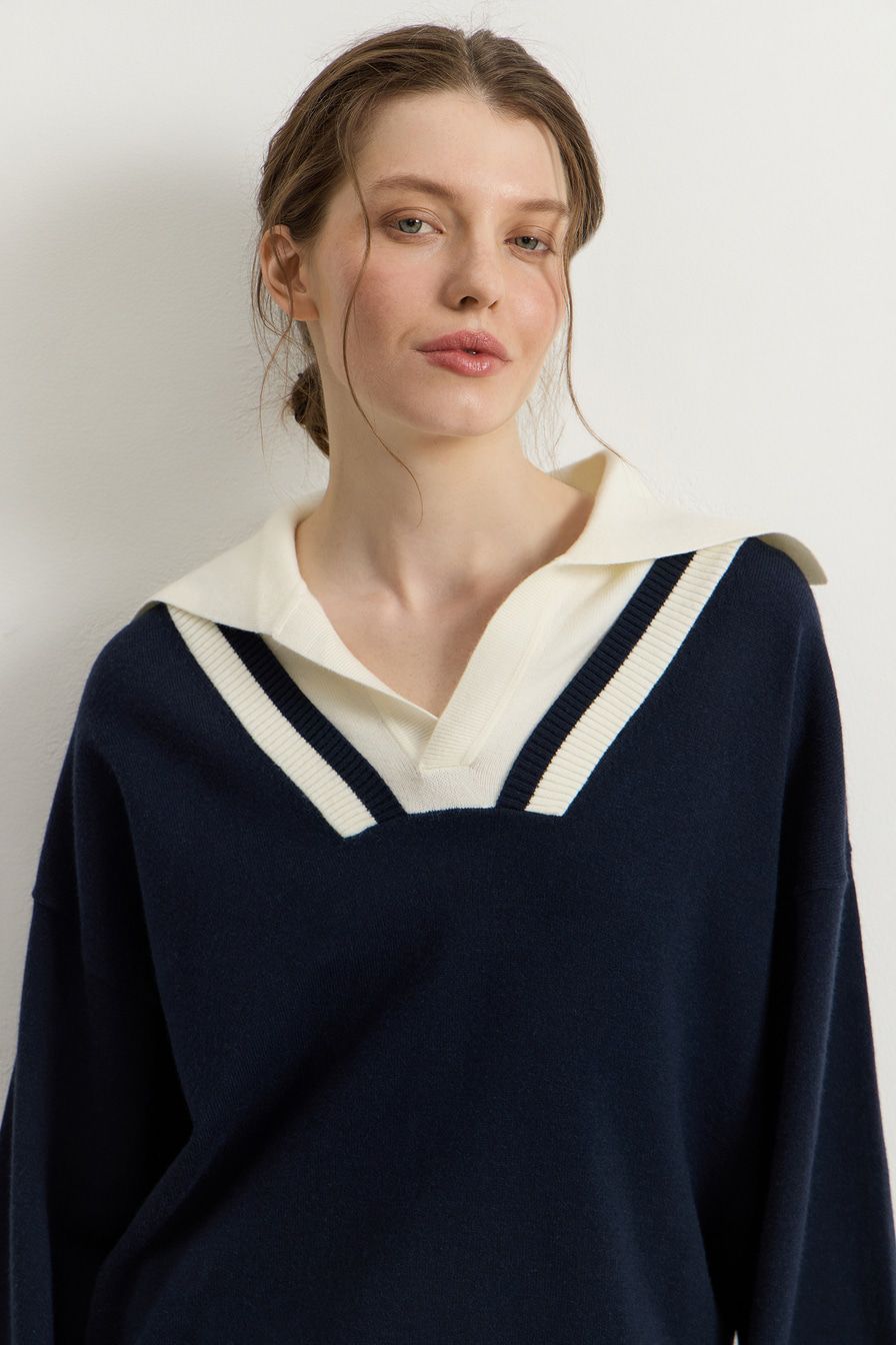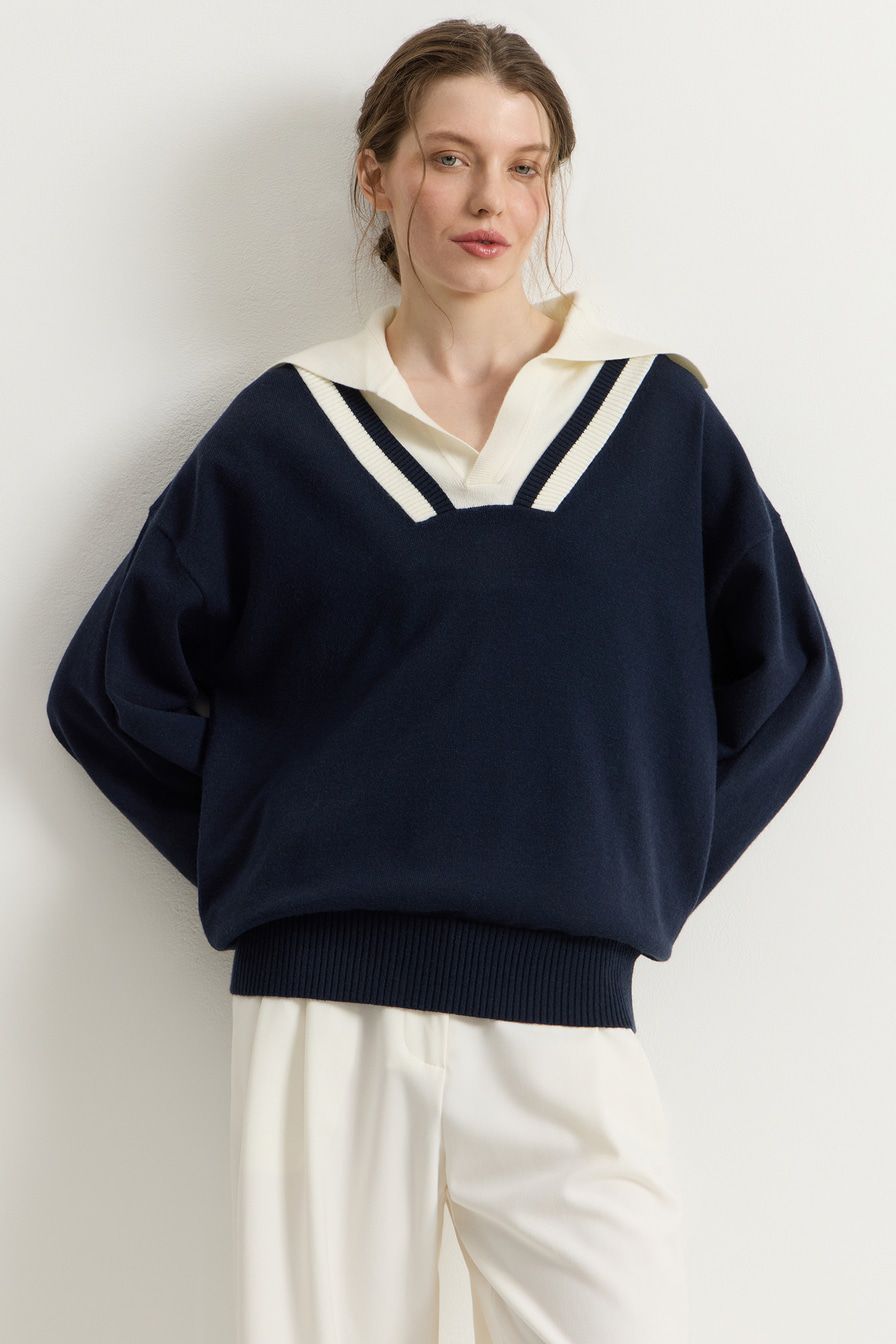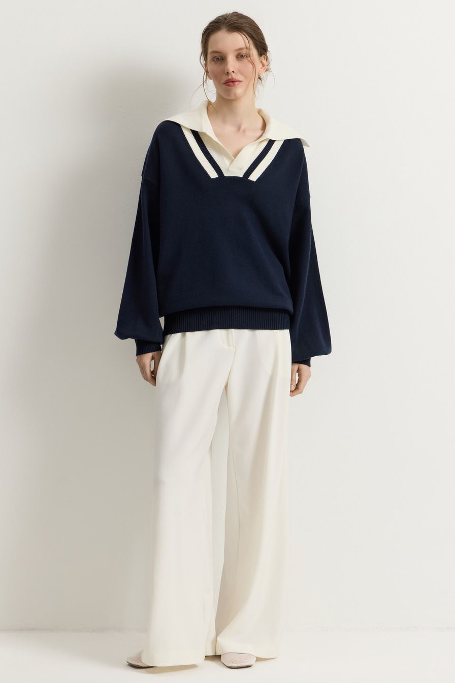 Темно-синий пуловер из смесовой ткани с добавлением вискозы – модель оверсайз-крой со спущенной линией плеч. Пуловер дополнен отложным воротником и декорирован контрастной отделкой.