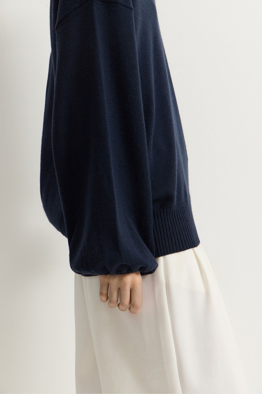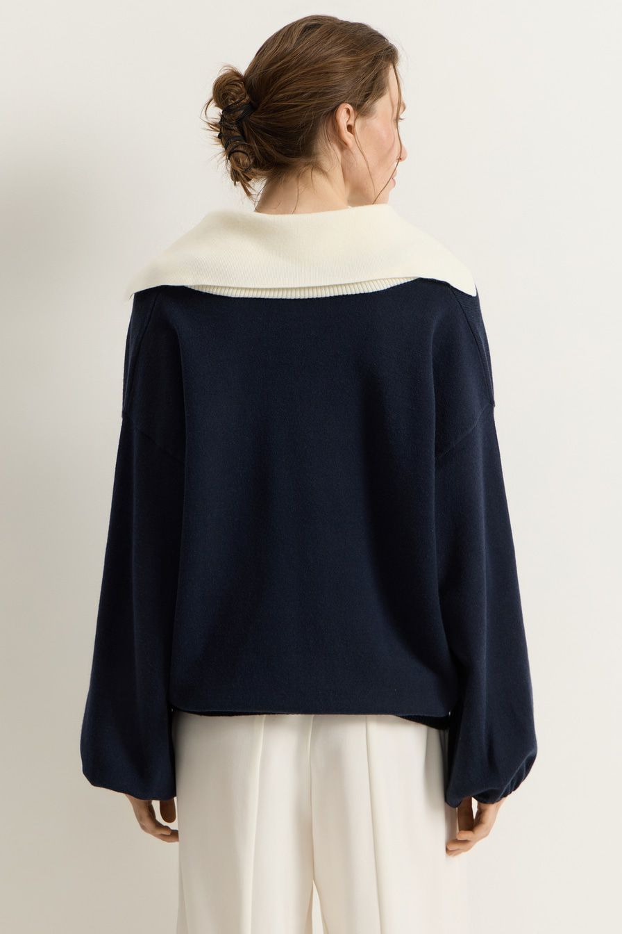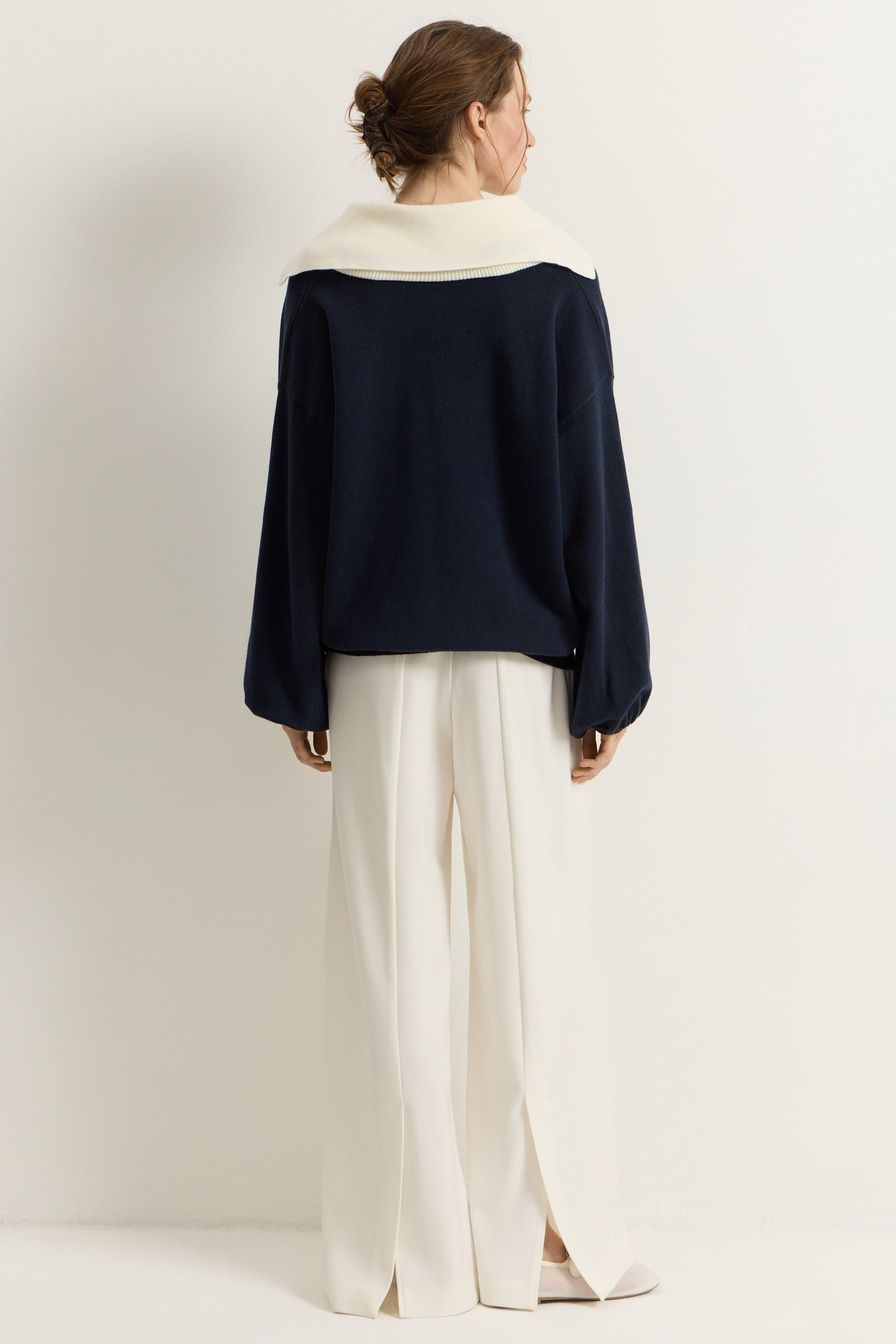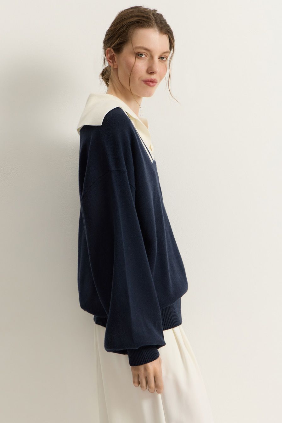 Темно-синий пуловер из смесовой ткани с добавлением вискозы – модель оверсайз-крой со спущенной линией плеч. Пуловер дополнен отложным воротником и декорирован контрастной отделкой.