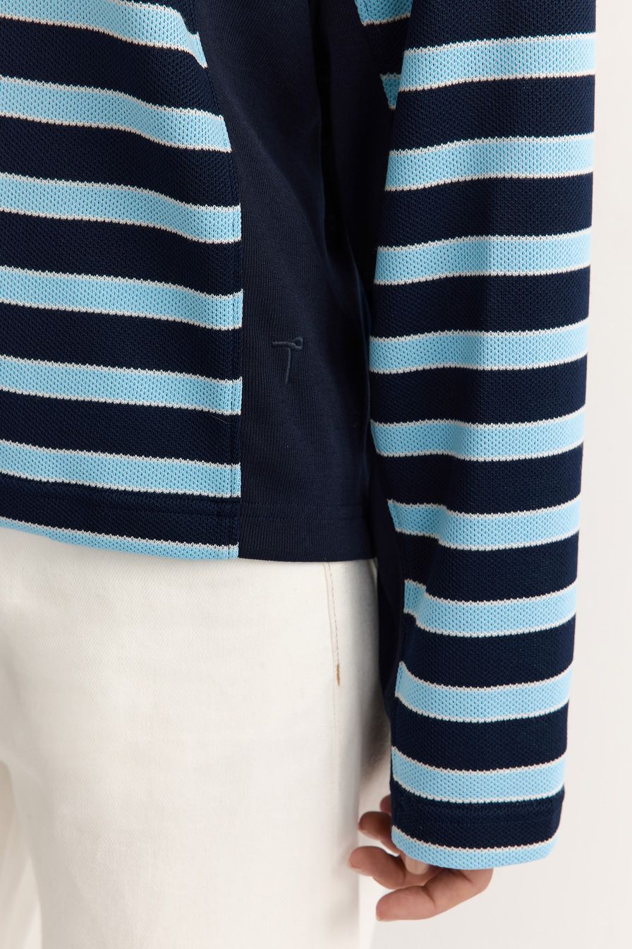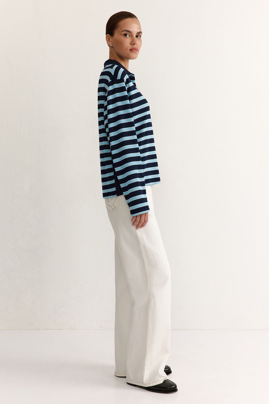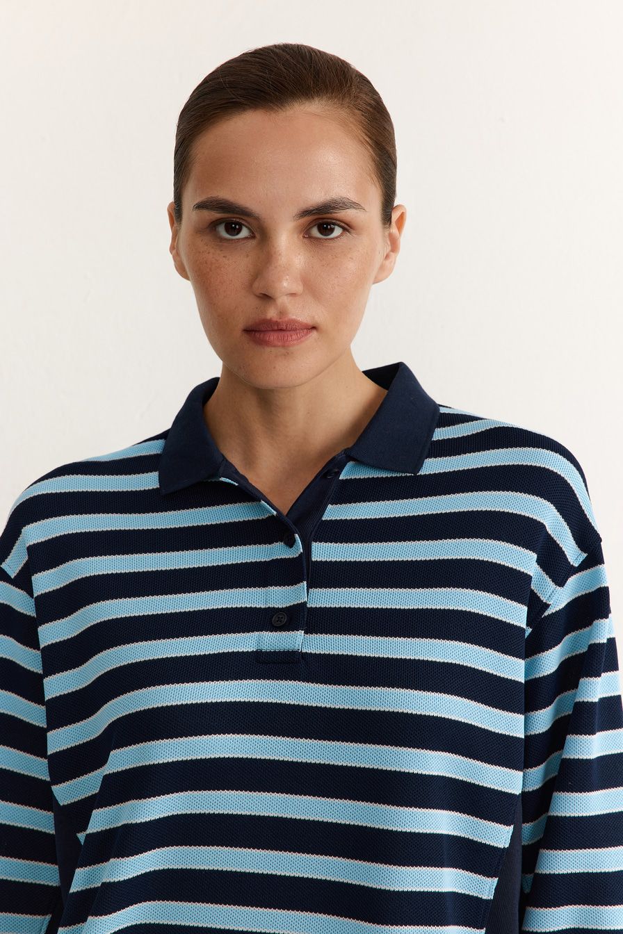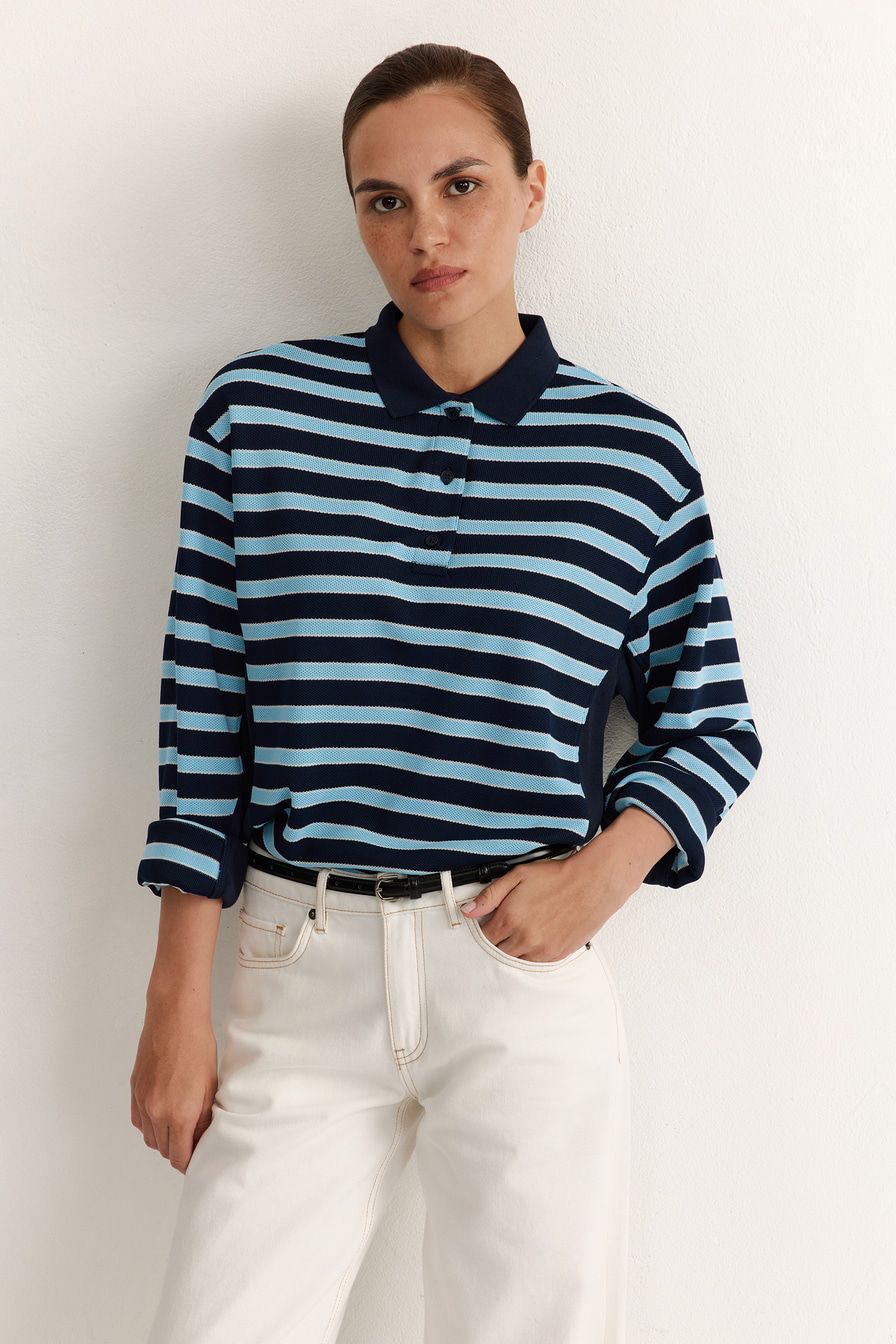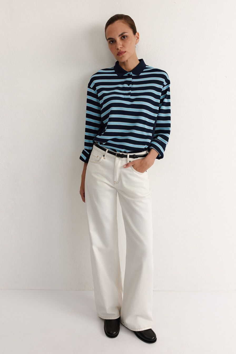 Джемпер из смесовой ткани с добавлением вискозы – модель свободного кроя со спущенной линией плеч. Джемпер дополнен воротником-поло с застежкой на пуговицы и декорирован принтом «полоска».