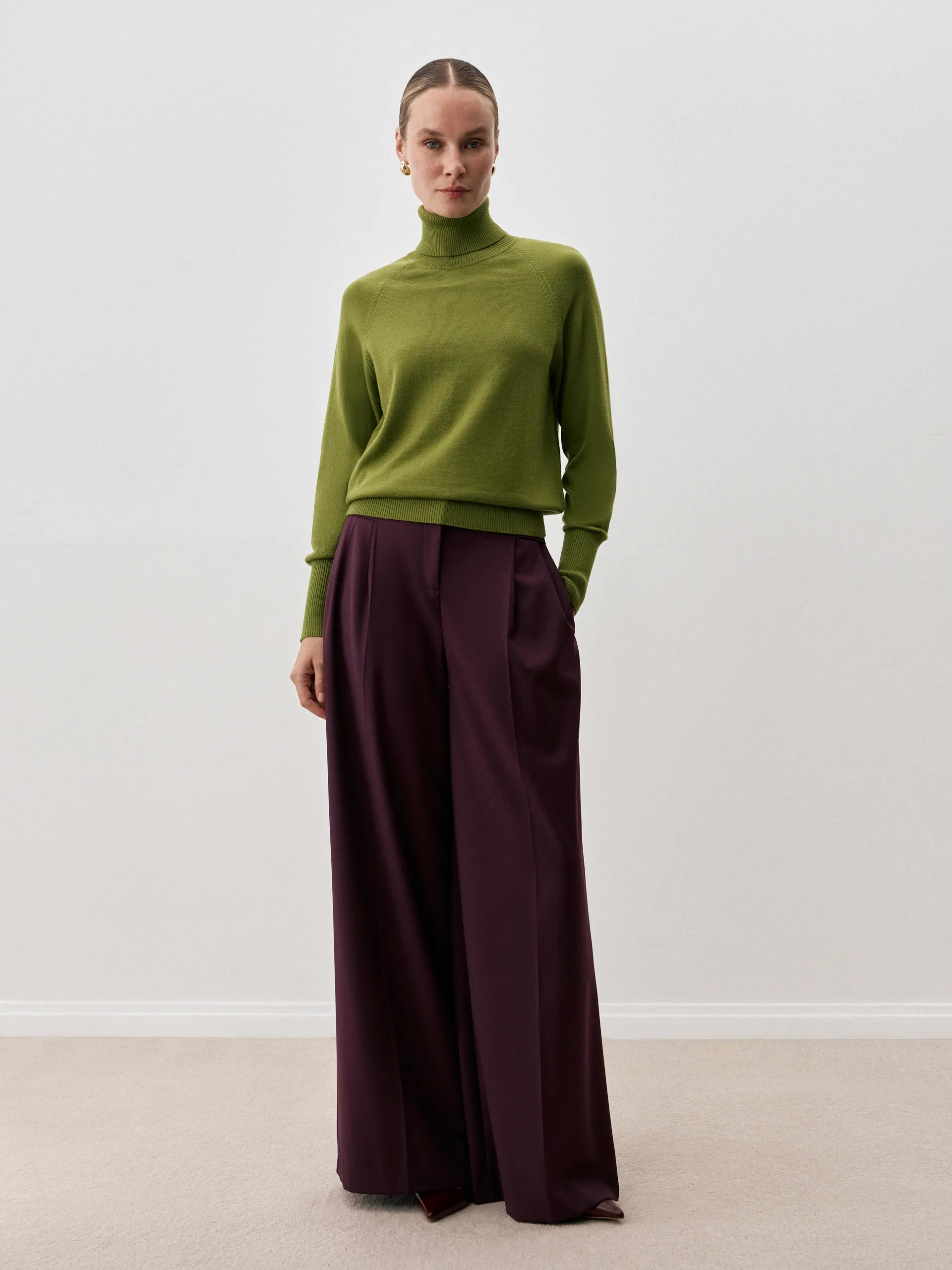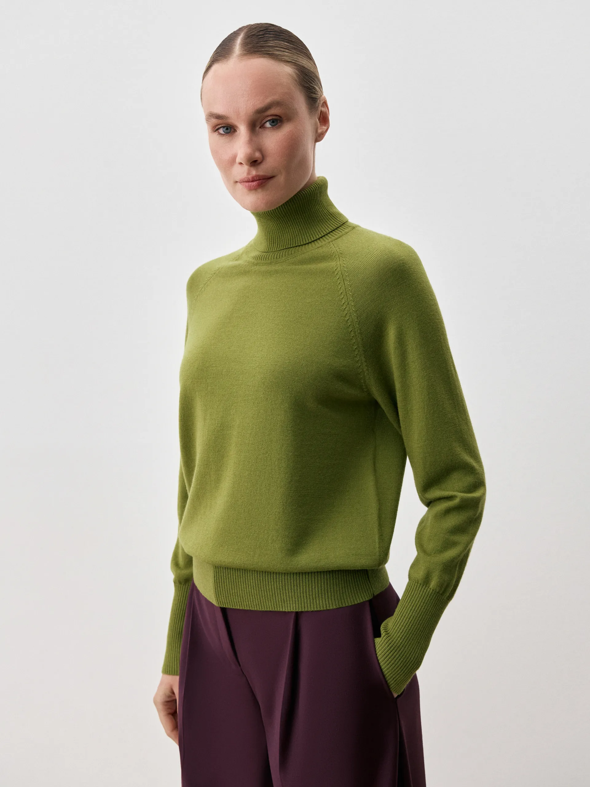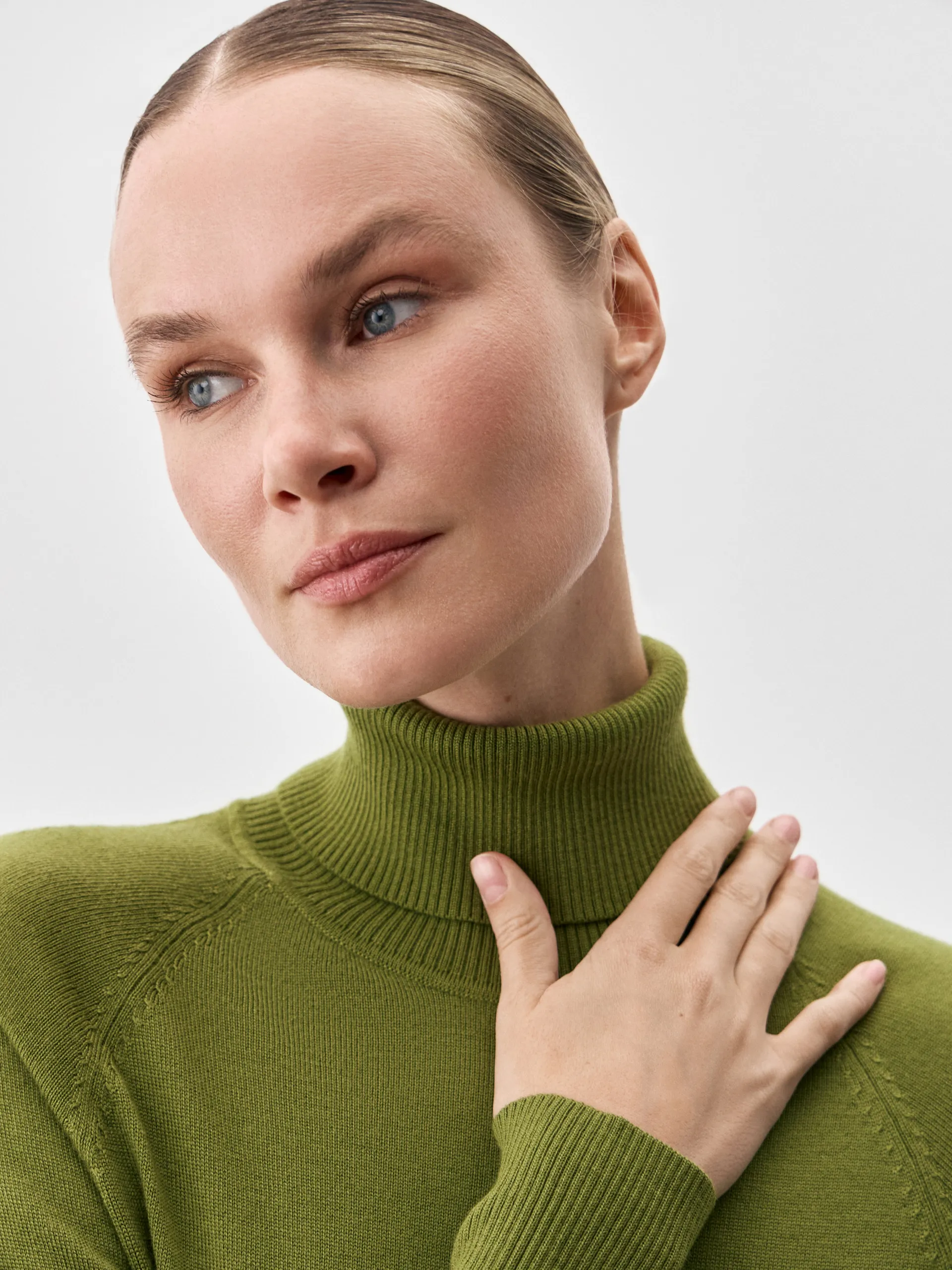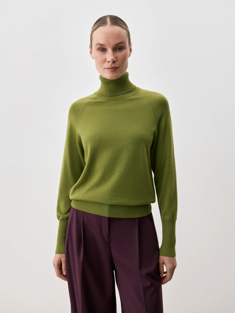 Водолазка Forte из 100% мягкой мериносовой шерсти. Такая шерсть обладает уникальным качеством — тонким волосом. Чем тоньше волос, тем теплее материал, поэтому в этой водолазке будет комфортно и уютно в холодную погоду. Еще одна особенность – способность отводить влагу от тела, не намокая, практически, как термобелье. Благодаря переплетению водолазка прекрасно держит форму, не колется и не вытягивается в зоне локтей. Forte - отличный вариант для многослойных образов, под жакет и верхнюю одежду или как самостоятельный элемент одежды.