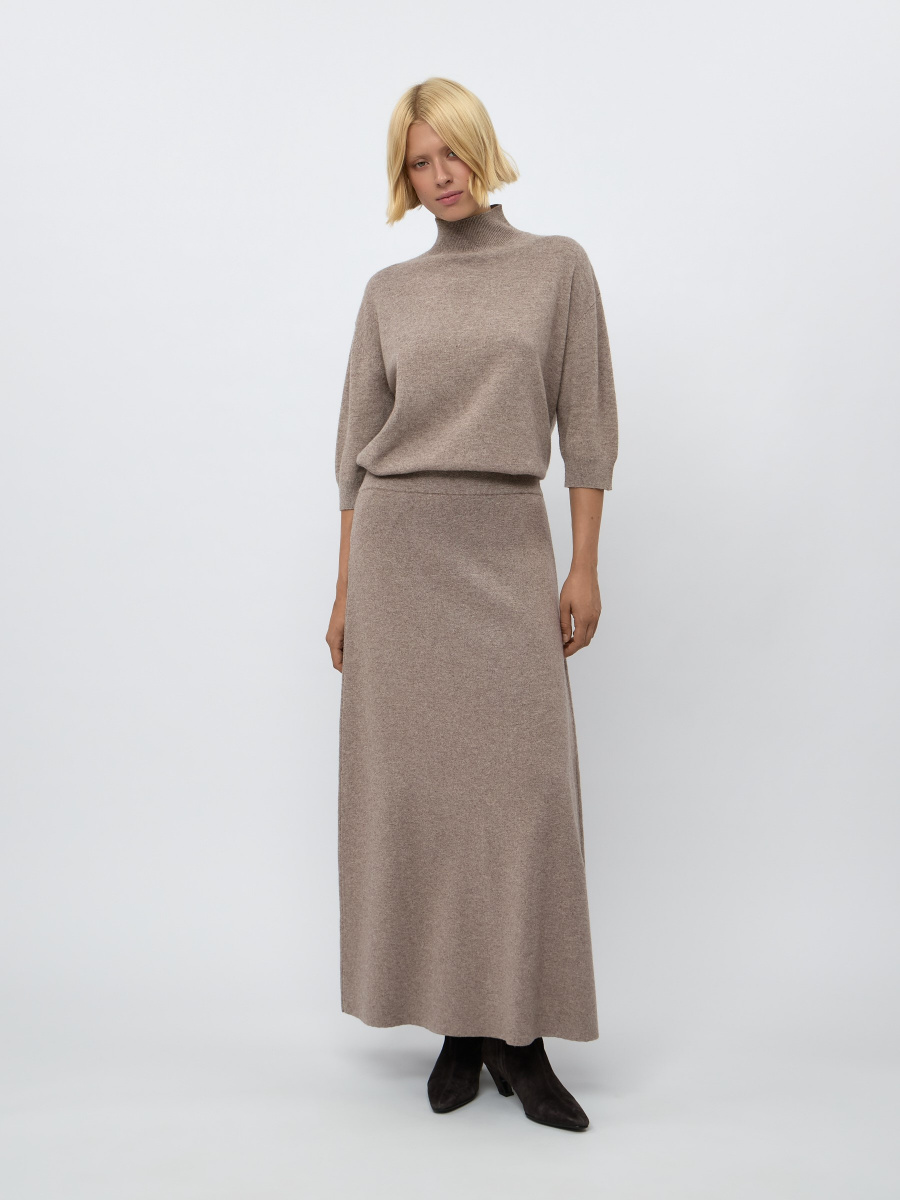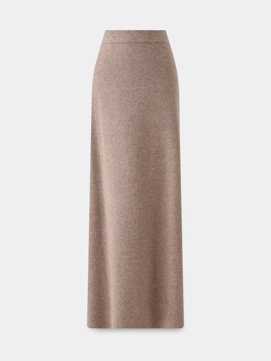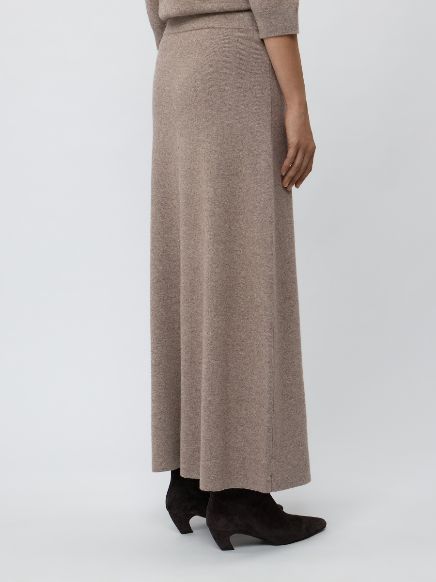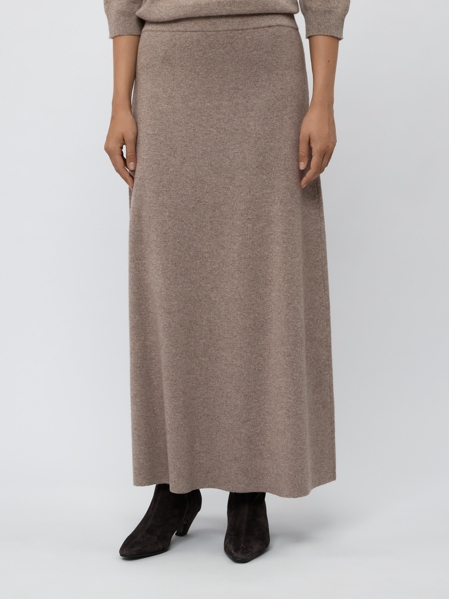 Юбка-трапеция с шерстью и кашемиром в длине макси. Идеальна для холодной погоды, когда хочется особенного уюта и комфорта. Выполнена гладким плетением из мягкой меланжевой пряжи. Плотный легкий трикотаж ложится оформленными складками и естественно играет в движении, оживляя осенние и зимние образы.