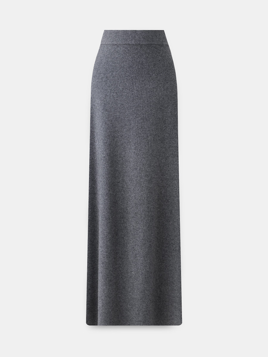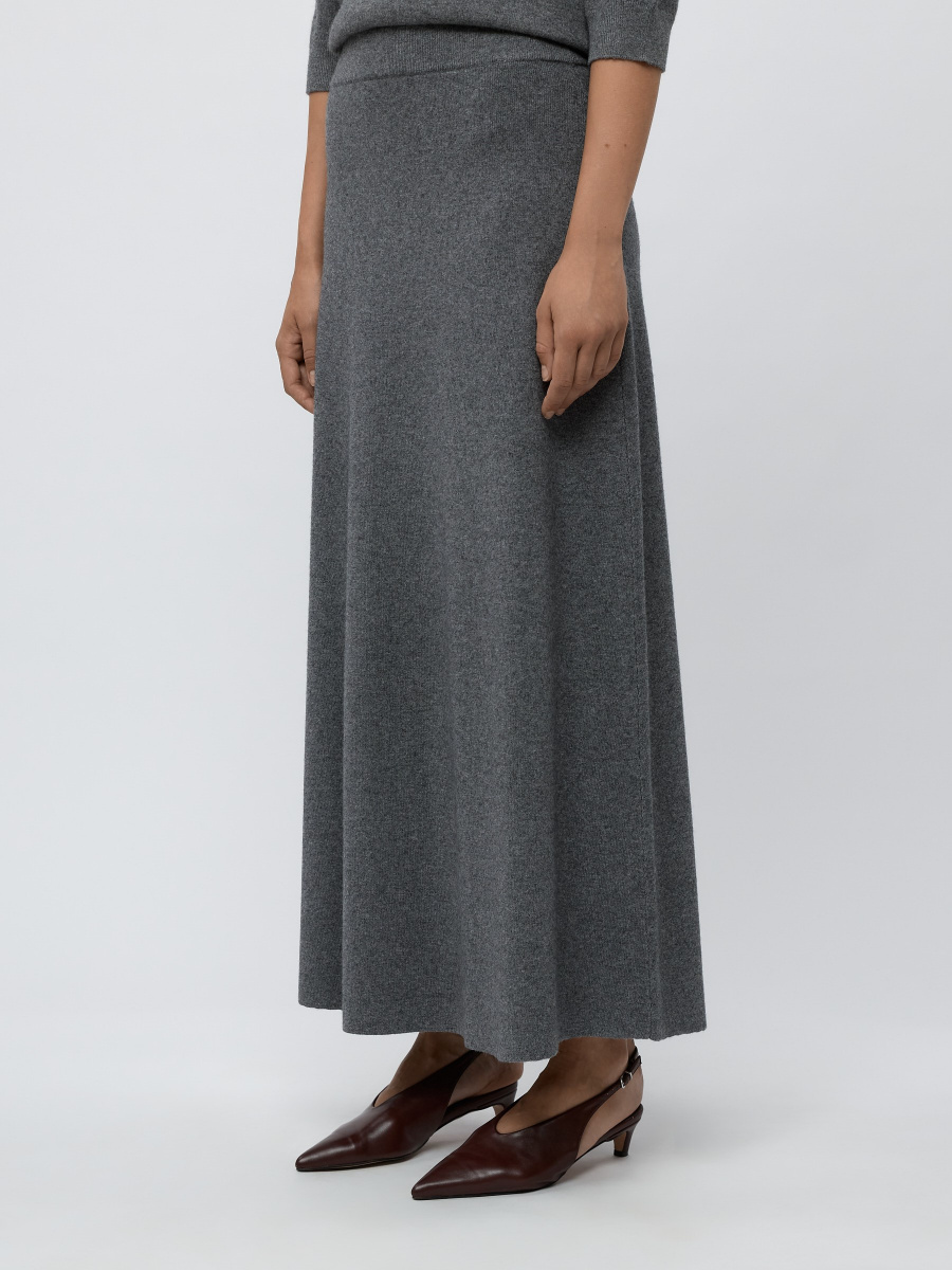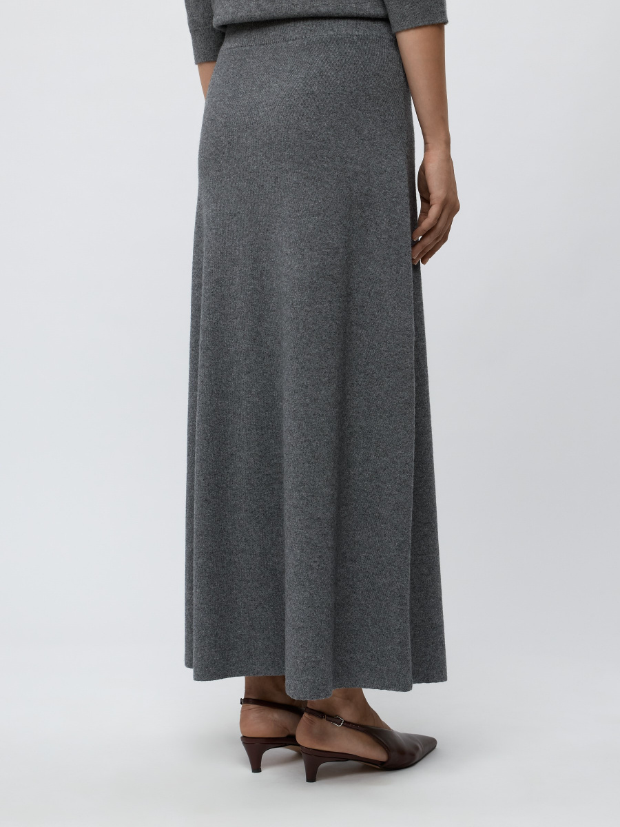 Юбка-трапеция с шерстью и кашемиром в длине макси. Идеальна для холодной погоды, когда хочется особенного уюта и комфорта. Выполнена гладким плетением из мягкой меланжевой пряжи. Плотный легкий трикотаж ложится оформленными складками и естественно играет в движении, оживляя осенние и зимние образы.
