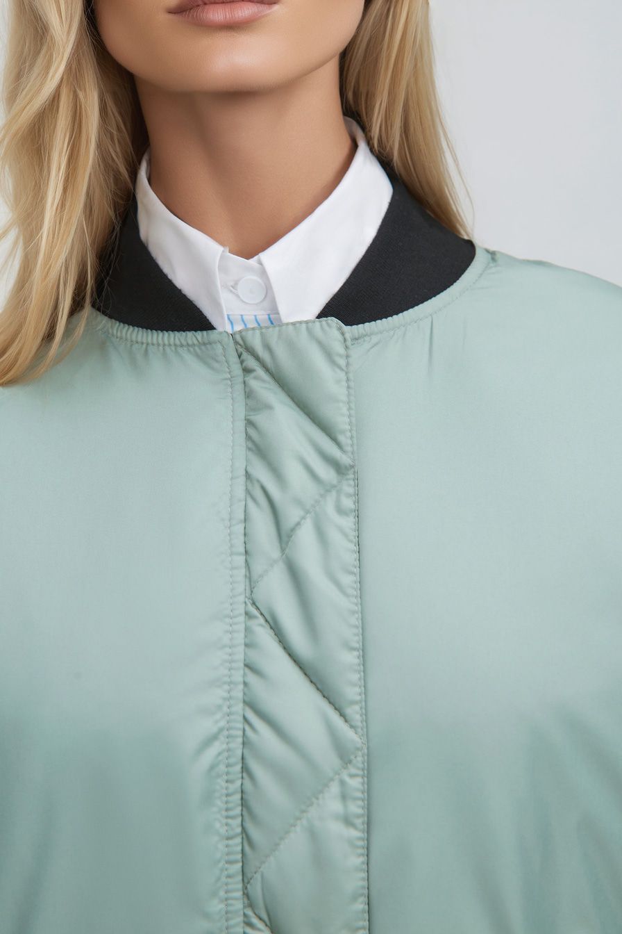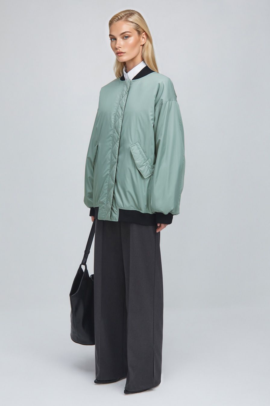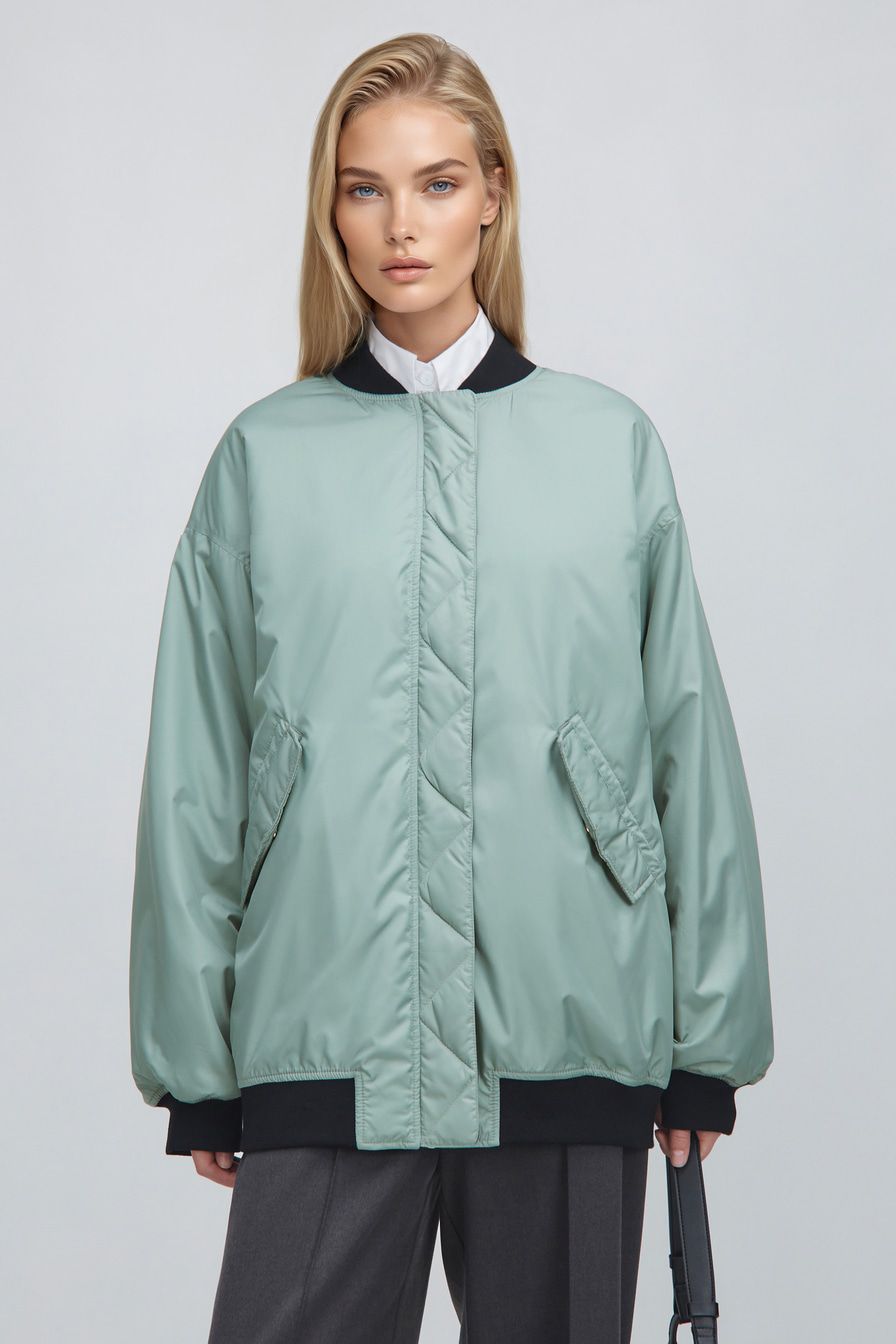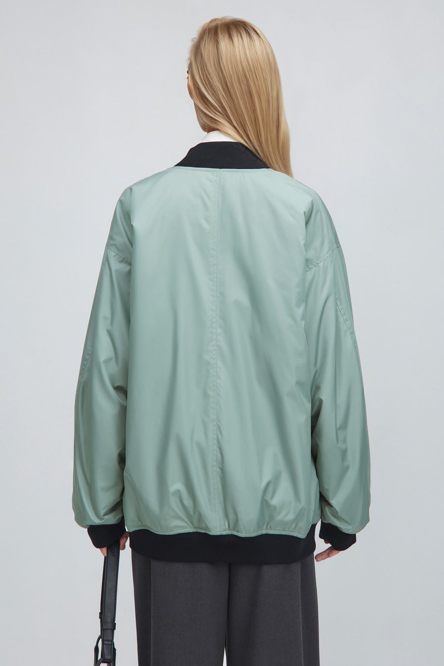 Объемный двусторонний бомбер c застежкой-молнией и боковыми карманами на кнопках. Одна сторона выполнена в черном цвете, другая – в светлом зеленом оттенке. Внутренняя сторона рукавов декорирована сборкой.