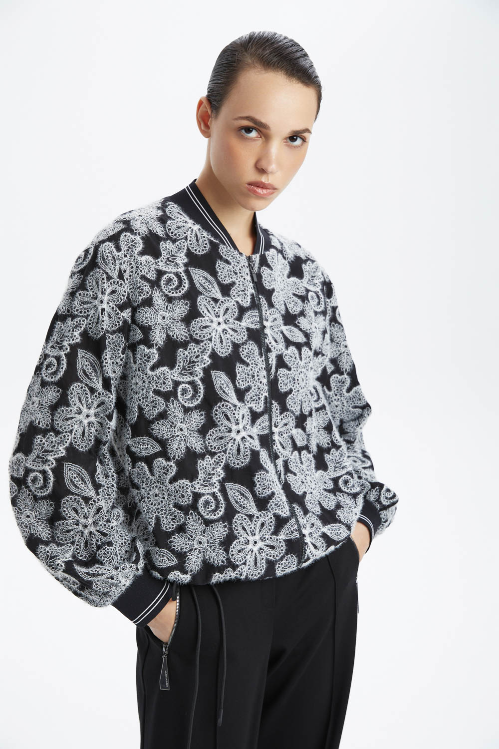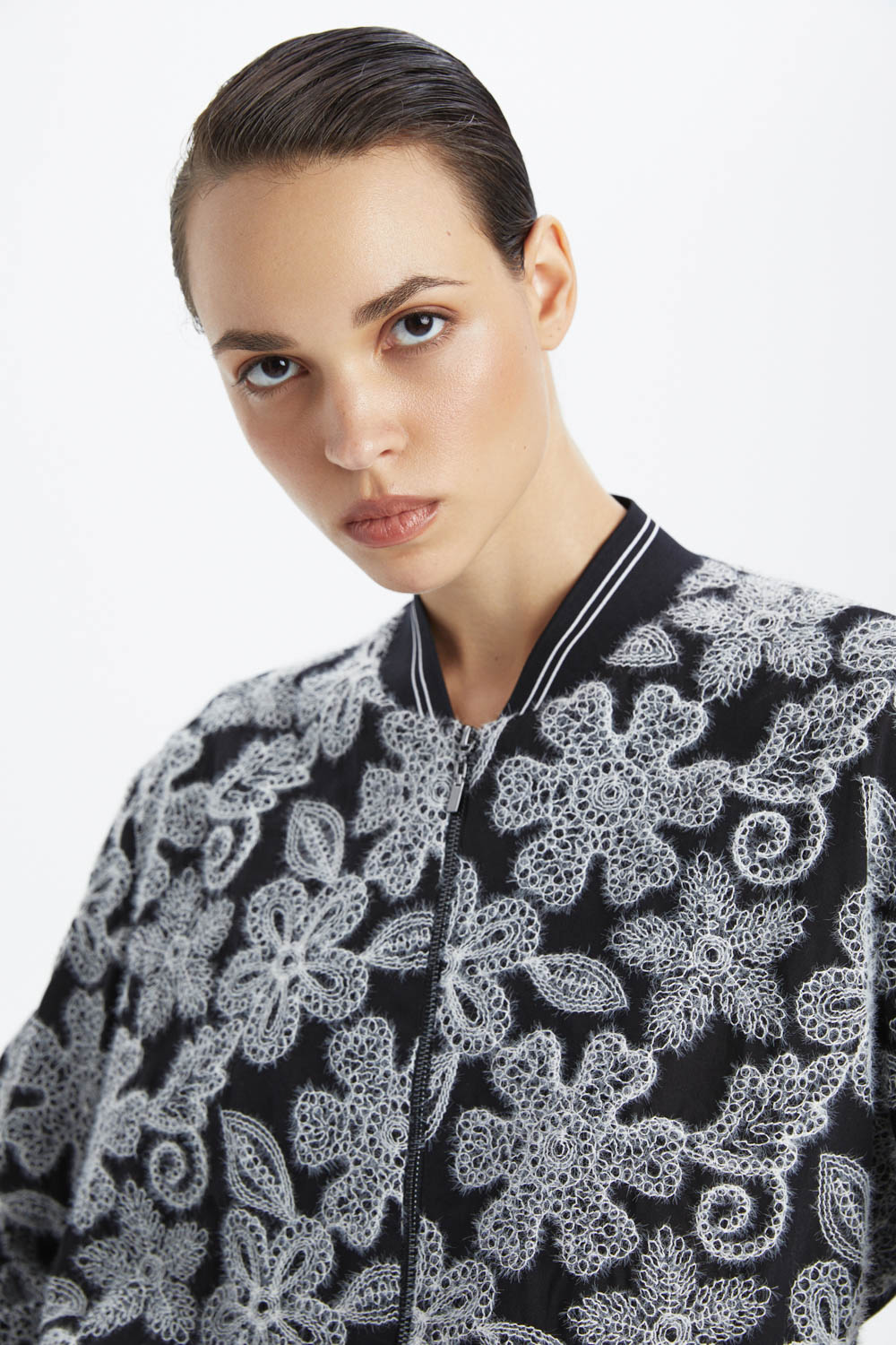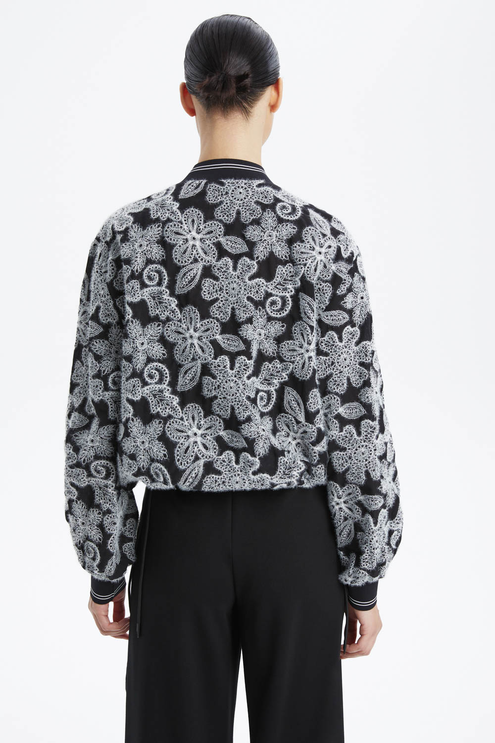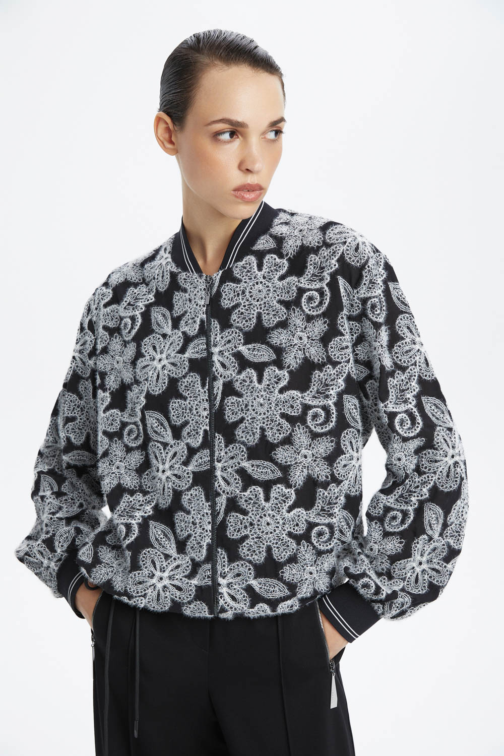 Стильный чёрный бомбер с ажурной вышивкой — это отличный выбор для тех, кто ценит комфорт и современный дизайн. Ажурная вышивка добавляет изделию уникальность и изысканность. Этот бомбер станет ярким акцентом в вашем гардеробе и подойдёт для создания различных образов.