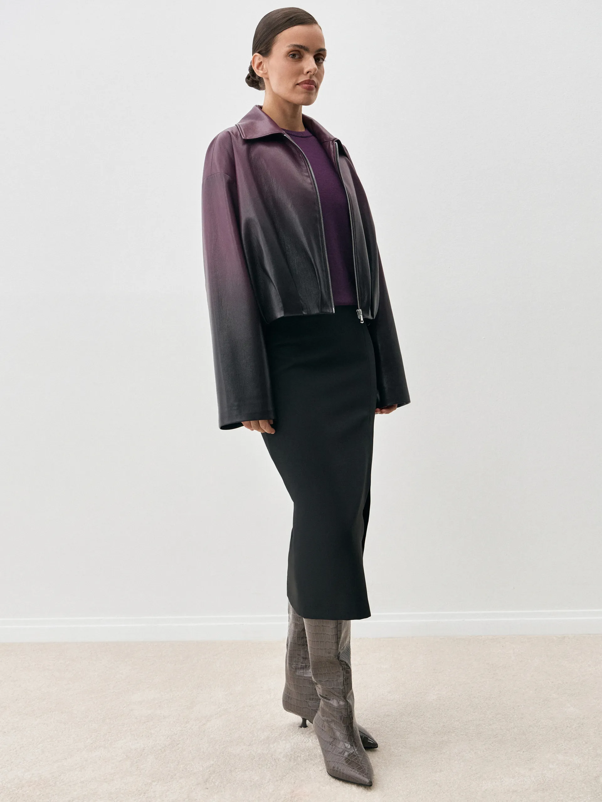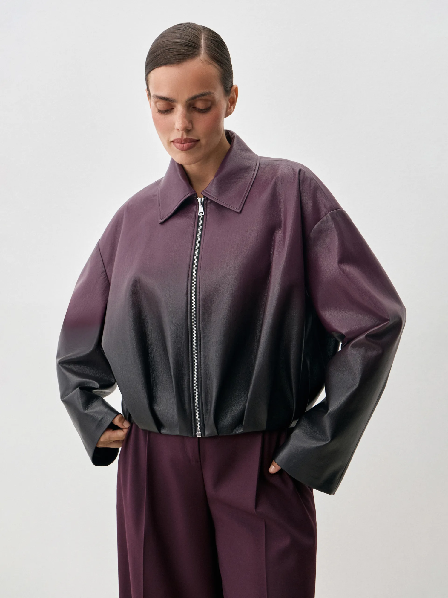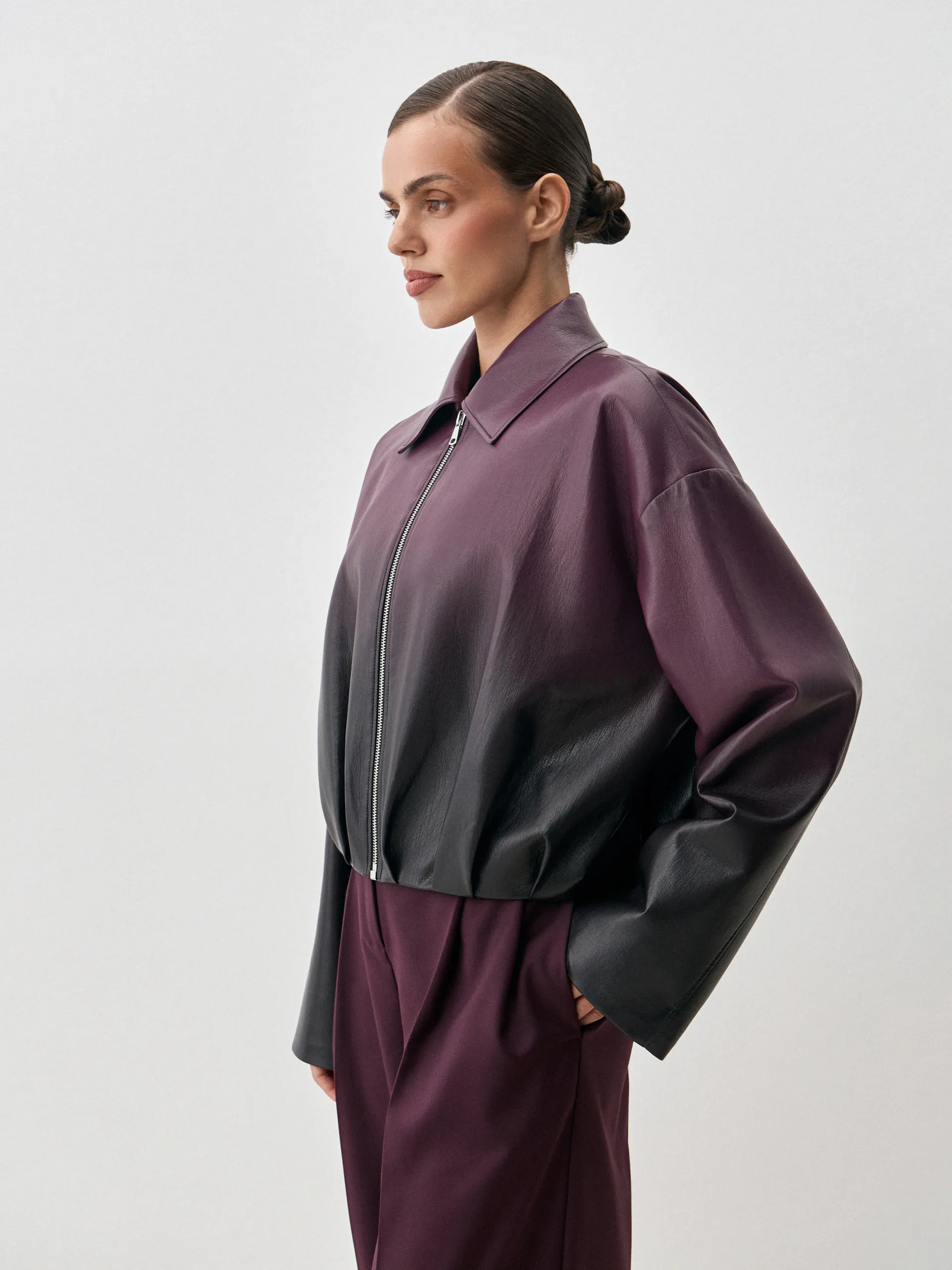 Бомбер Abby. Эффектный бомбер из мягкой премиальной экокожи с уникальным переходом цвета от тёмного к фиолетовому. Укороченный силуэт придаёт образу современный и дерзкий акцент, а гладкая экокожа обеспечивает комфорт и долговечность. Благодаря градиенту модель выглядит выразительно и стильно, легко вписываясь как в повседневные, так и в более эффектные образы. Куртка хорошо сочетается с брюками и юбками из комплектной костюмной ткани, трикотажем в тон, а также с джинсами или лаконичными базовыми элементами гардероба. Это универсальный вариант для городских прогулок, стильных выходов и демисезонных ансамблей.
